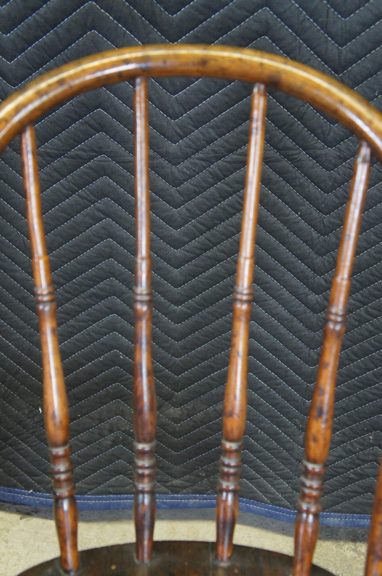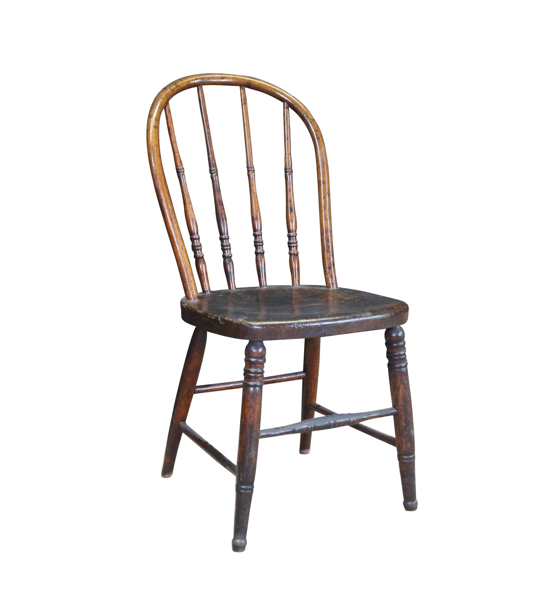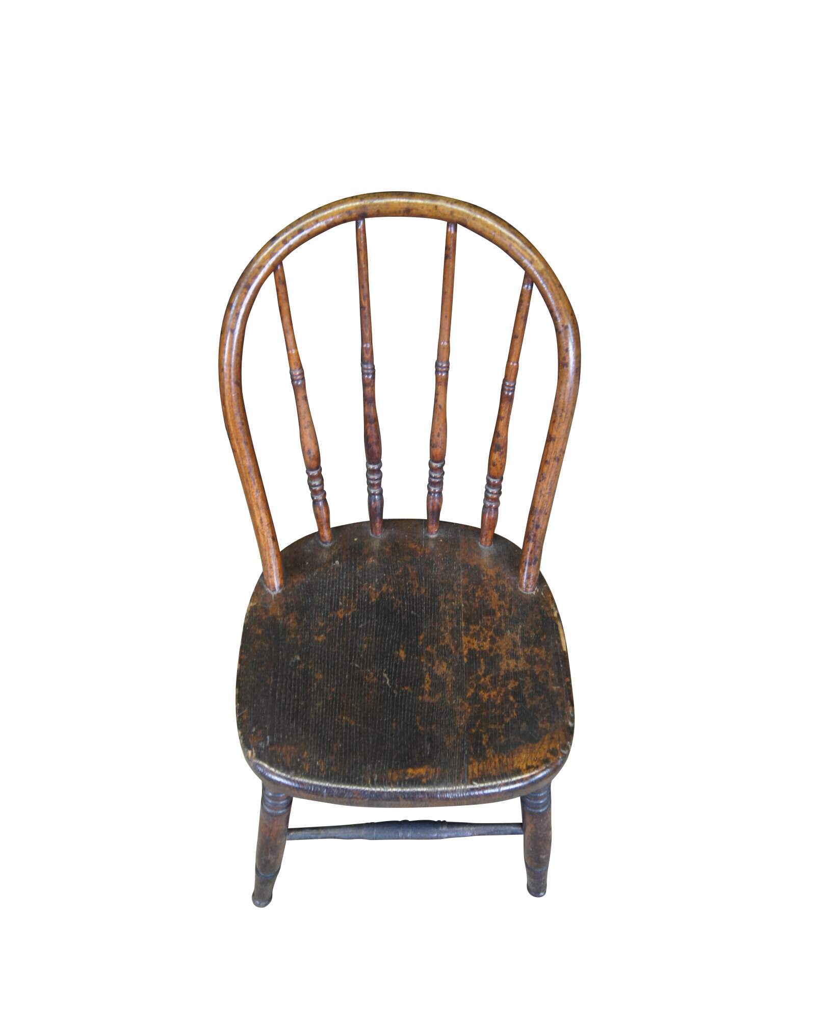 Quaint antique windsor bowback chair. Made from oak with a warm brown finish. Features a turned spindle back over plank seat and turned legs connected by stretchers.