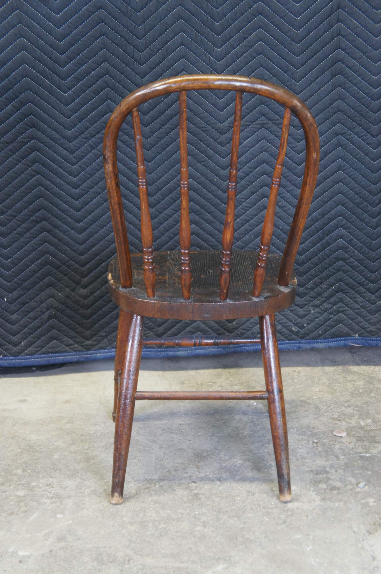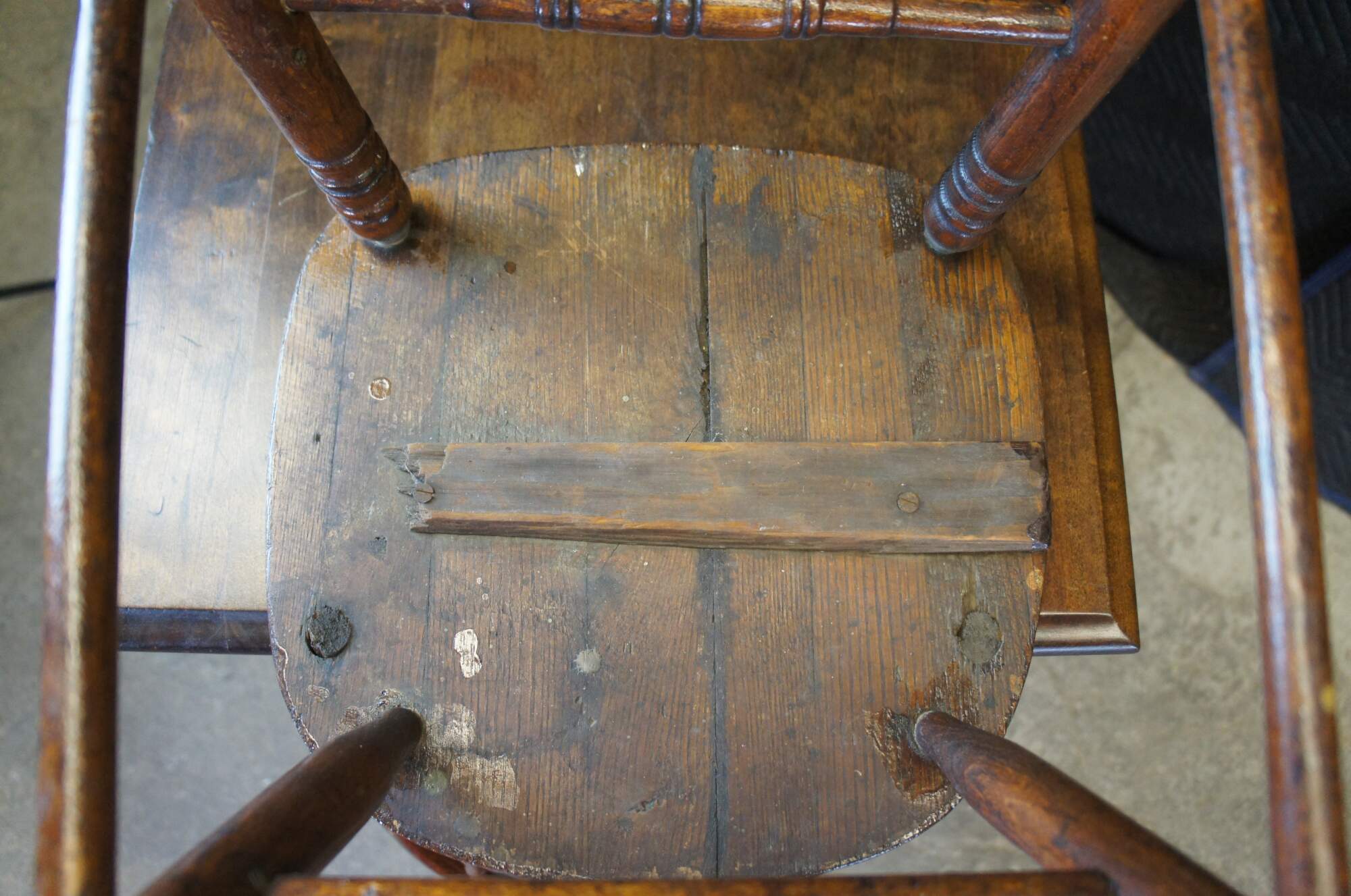 Fair antique condition, wear and distressing commensurate with age and use, finish loss, fading, scuffing / marking, past repair to seat.