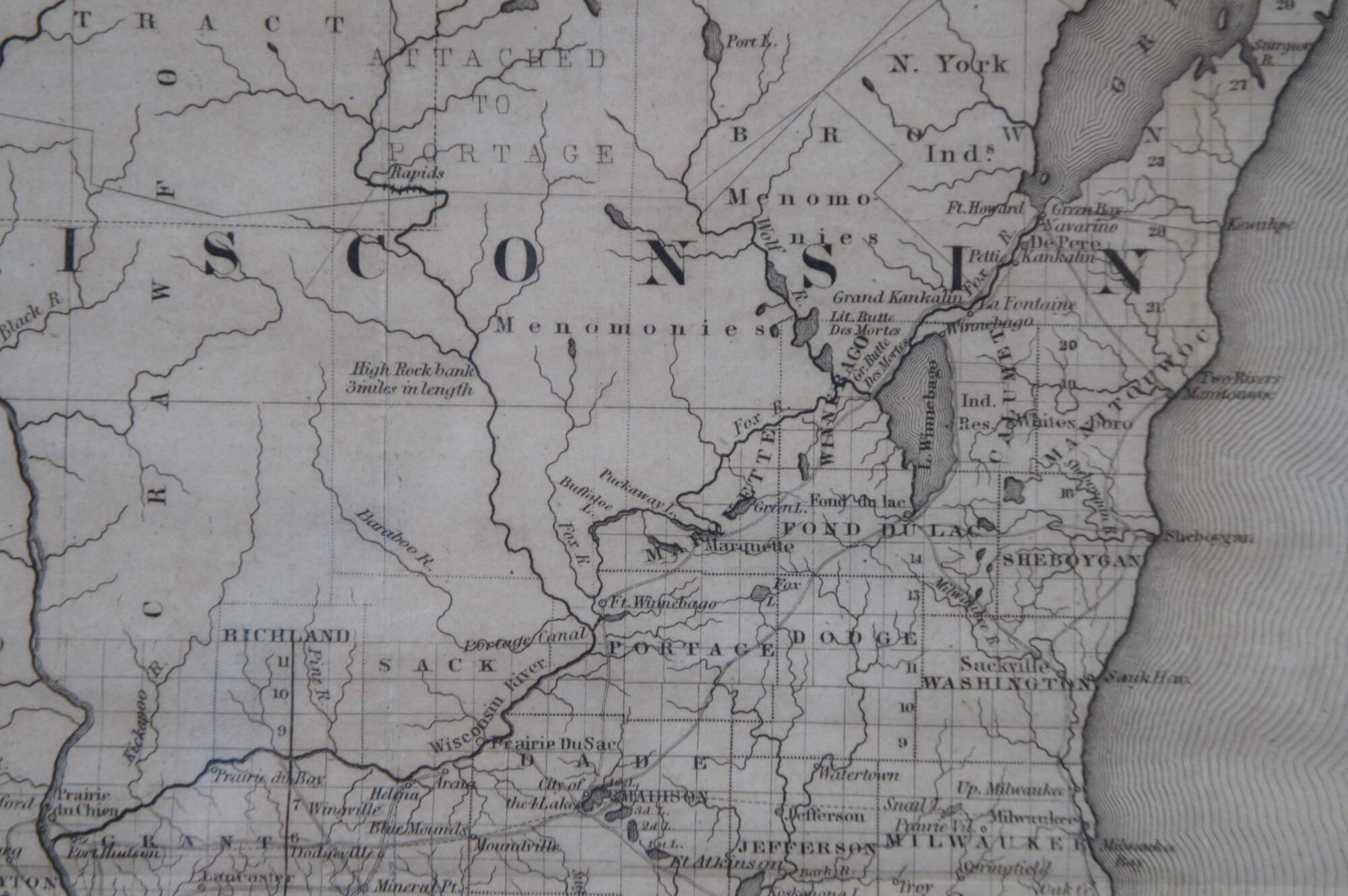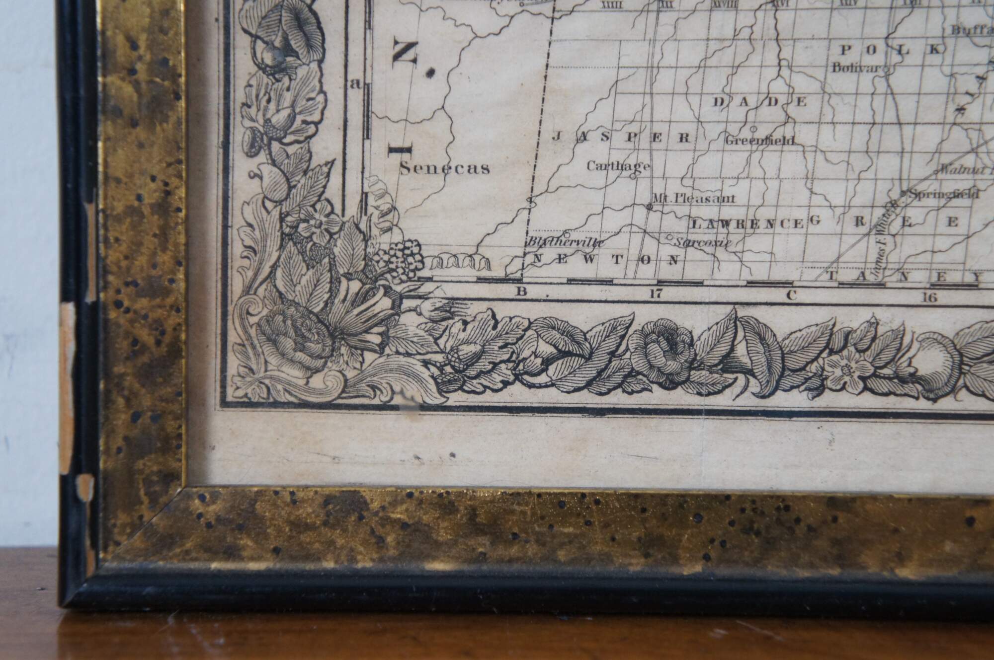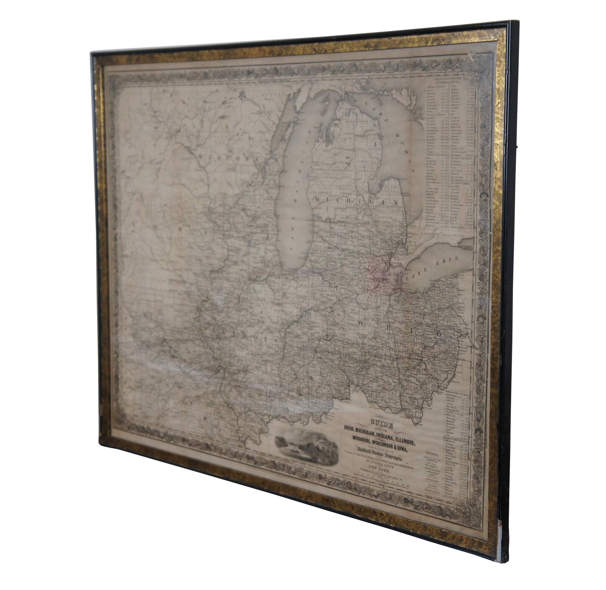 Antique framed black and white map of seven Midwestern American states. Guide Through Ohio, Michigan, Indiana, Illinois, Missouri, Wisconsin, & Iowa. Showing the Township Lines of the United States Surveys, Location of Cities, Towns, Villages, Post Hamlets, Canals, Rail and Stage Roads.