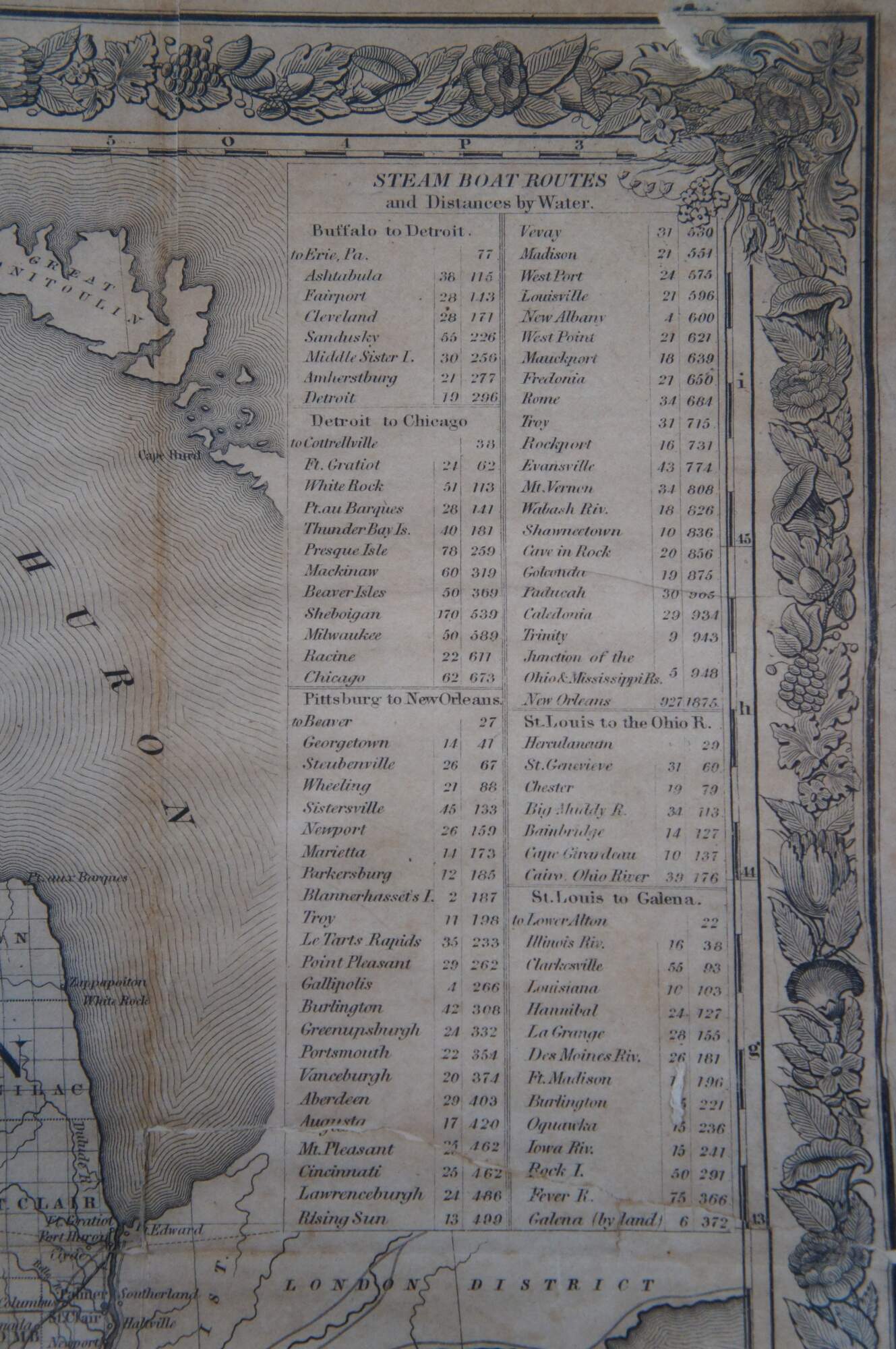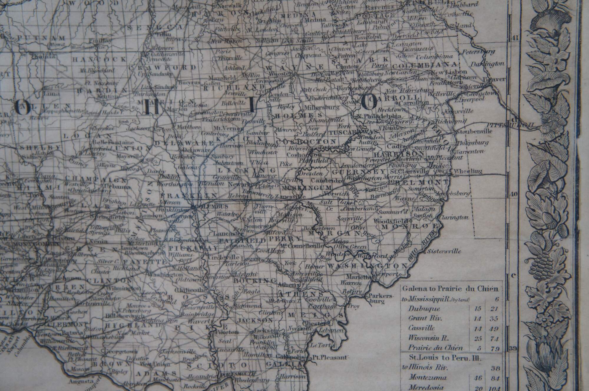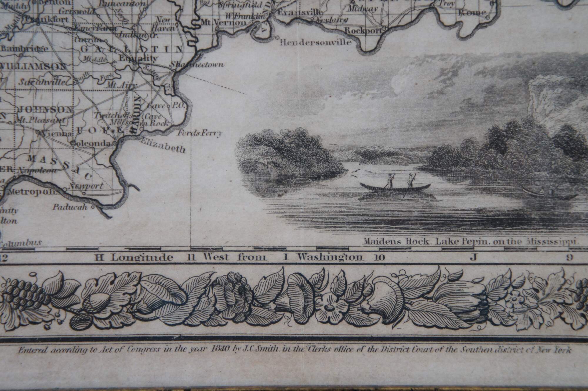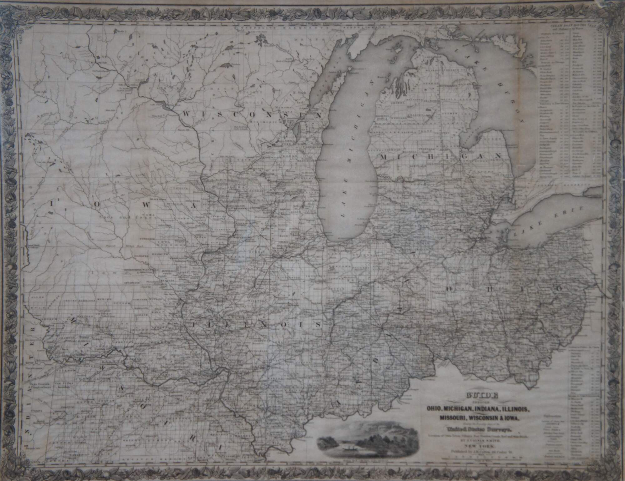 The map would have been a useful tool for the myriad of European immigrants who were moving to the United States in vast numbers throughout the mid-19th century. The states of Illinois, Indiana, Michigan, Ohio, Wisconsin, Iowa and Missouri are all displayed, with their respective transportation routes in the forms of railroads, canals and roads a focal point of the image. Distribution of surveyed counties and townships reflect the general pattern of westward settlement along these routes. Distance tables on the right side show various lengths of routes between popular destinations via water and land, while a decorative view at the bottom shows Maiden’s Rock on the tranquil Mississippi. The map provides a fascinating glimpse at how the U.S. promoted itself during the rush of immigration in the 19th century. Colton published several updated editions of this map through the late 1860’s.