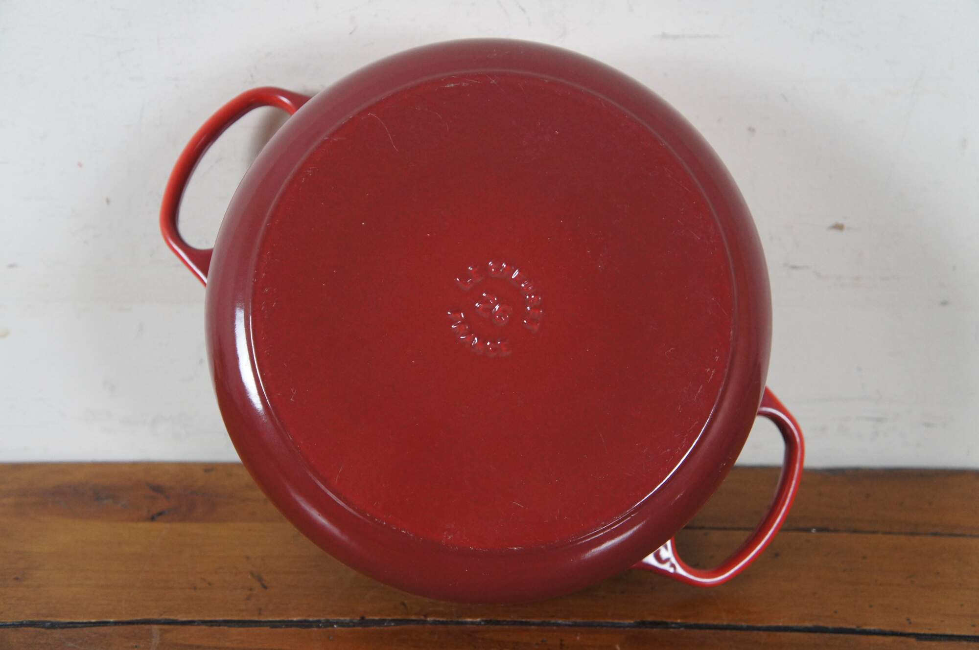 Le Creuset France No. 26, double handled round dutch oven with lid. Made of cast iron and enameled in cerise red ombre with black lid handle. 5.5 quart capacity.