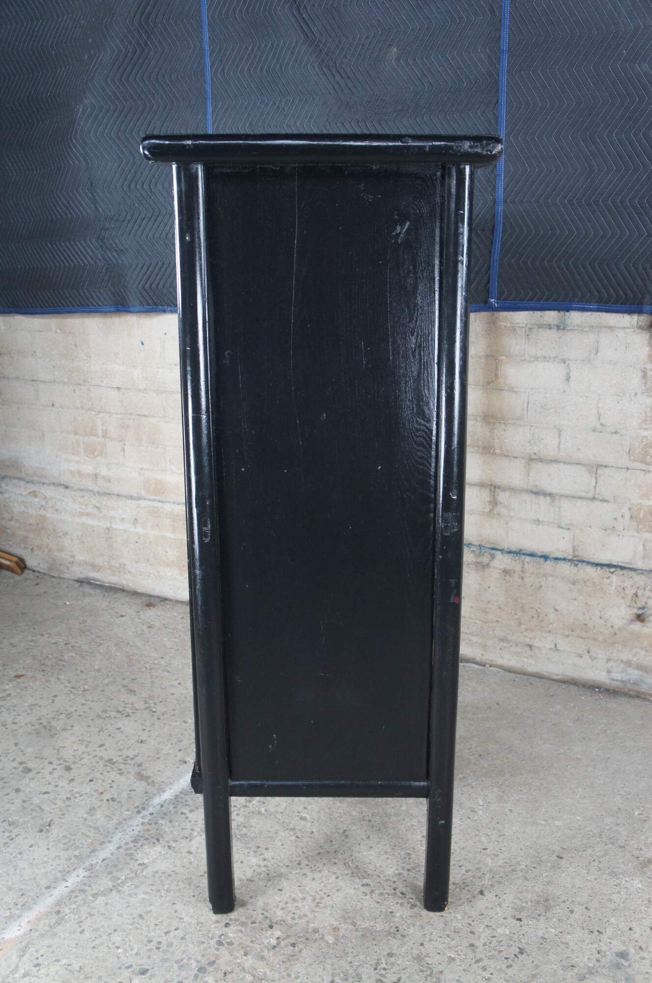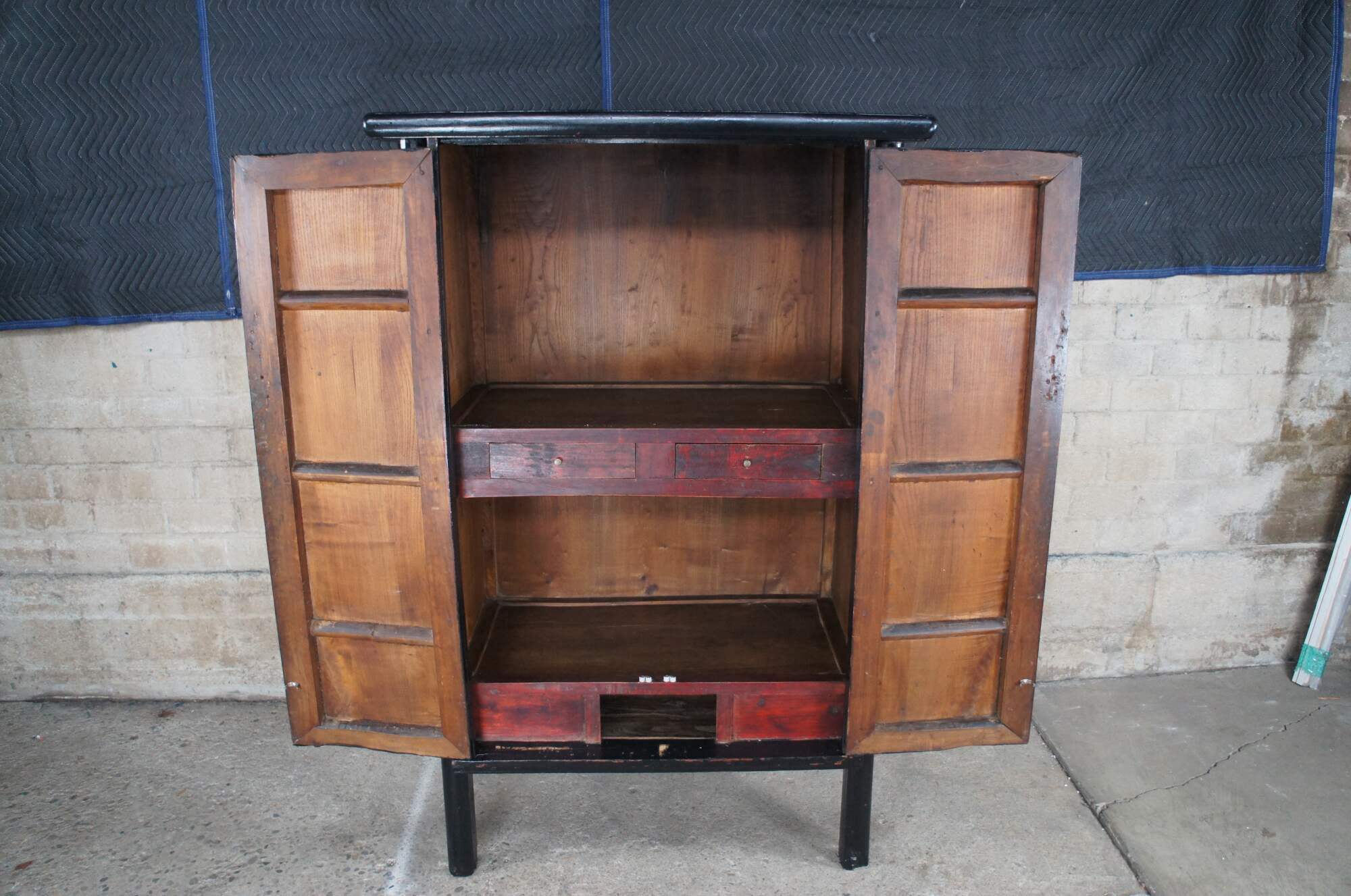 Chinese black lacquer Qing Dynasty lines press or scholars cabinet, circa 1890s. Features two doors with iron hardware that open to a natural finished interior with two large storage areas and two hand dovetailed drawers. The cabinet is raised over rounded legs. Mortise & Tenon Construction.