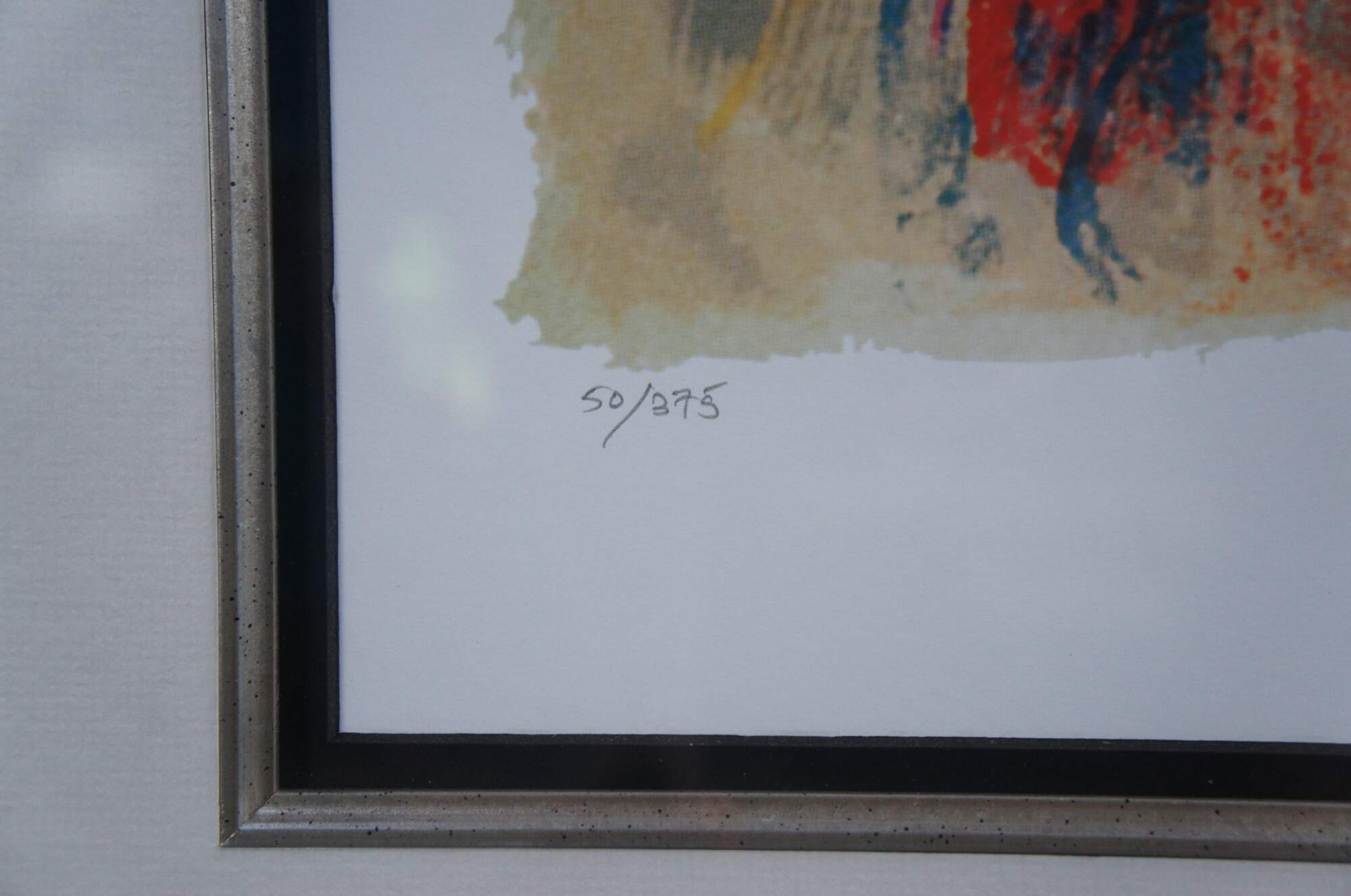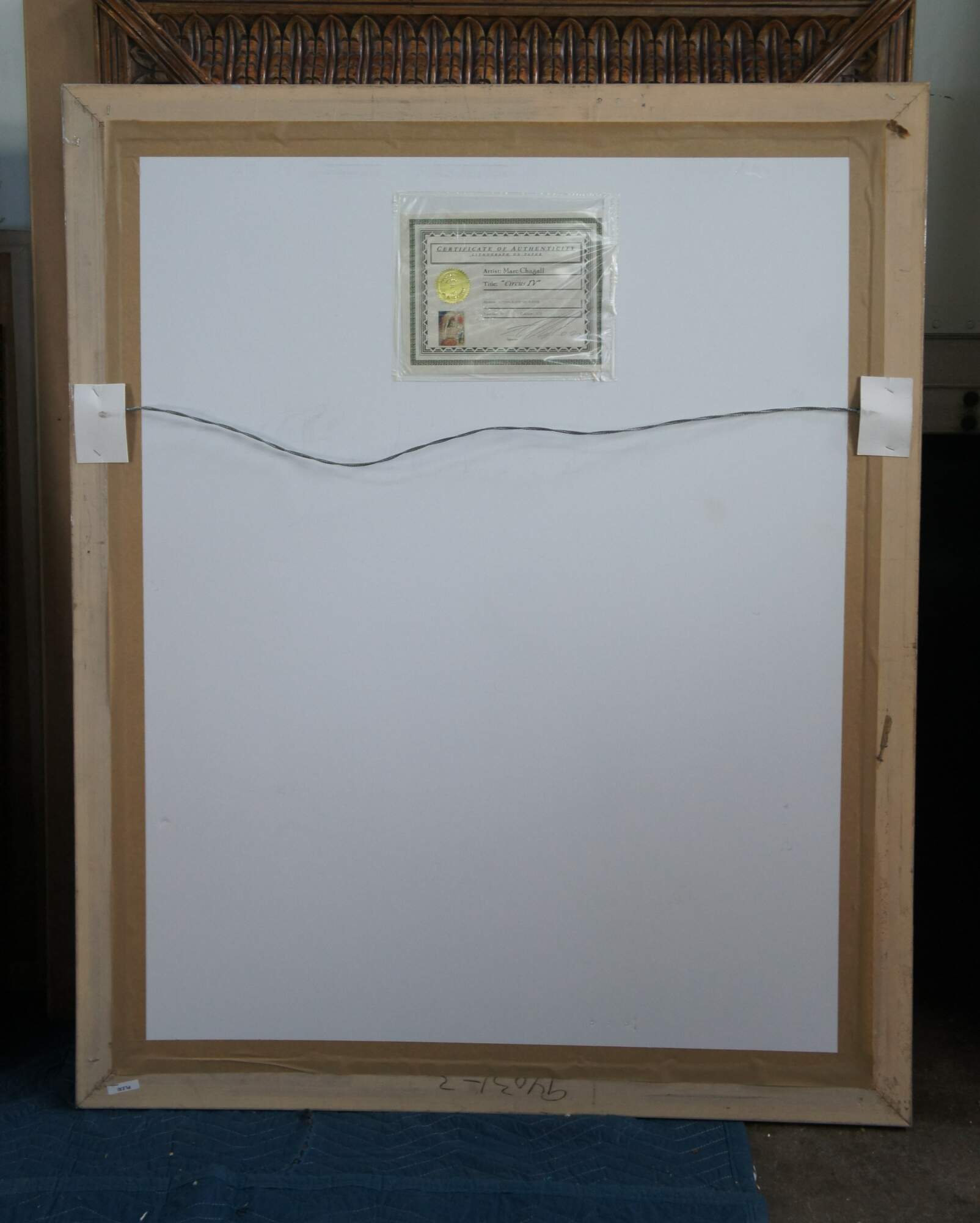 Vintage large and impressive Marc Chagall impressionist/expressionist lithogaph on paper featuring a circus scene with a man, woman / angel and horse levitating above the crowd with a pair of juggling clowns. Beautifully framed in a coin dot / graduated silver bead. Edition 50 of 375.