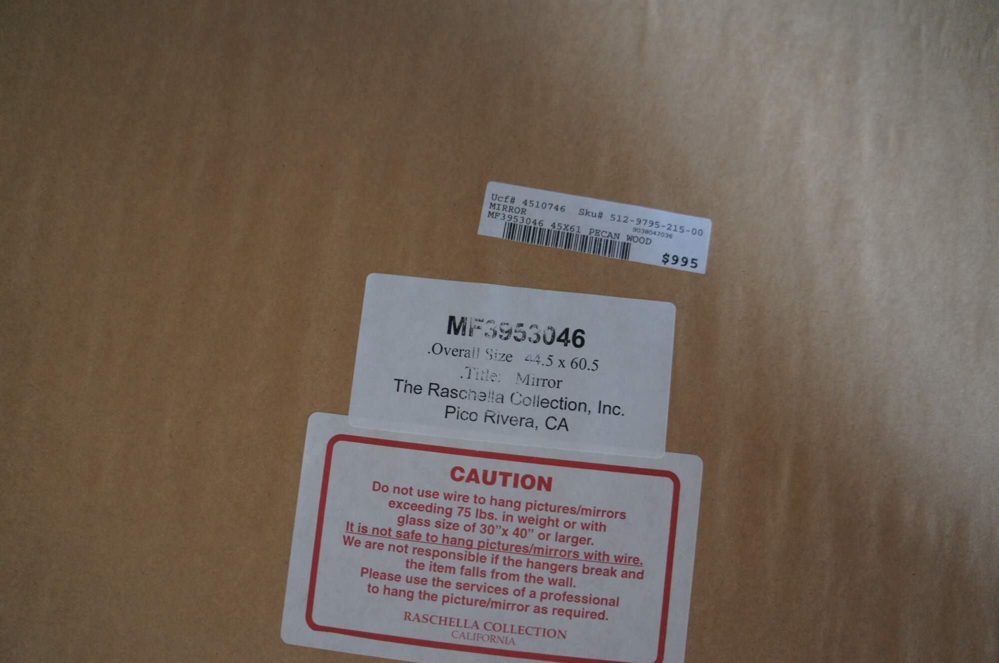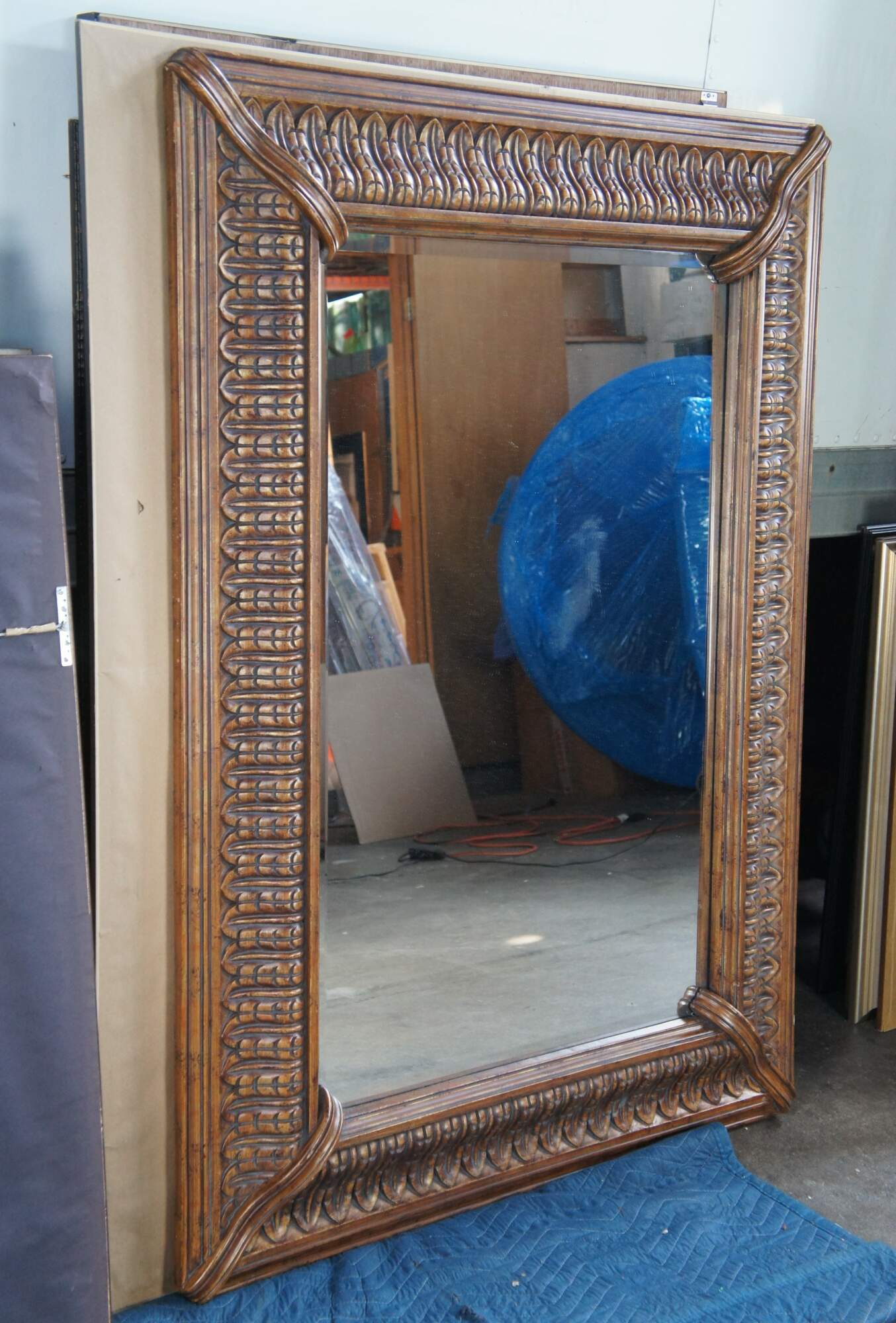 Vintage Raschella Collection beveled vanity or mantel mirror featuring an ornate pecan wood frame. Set up for vertical or horizontal hanging.