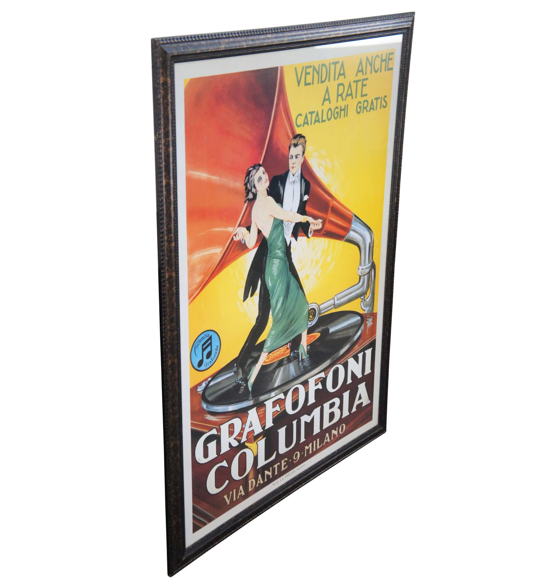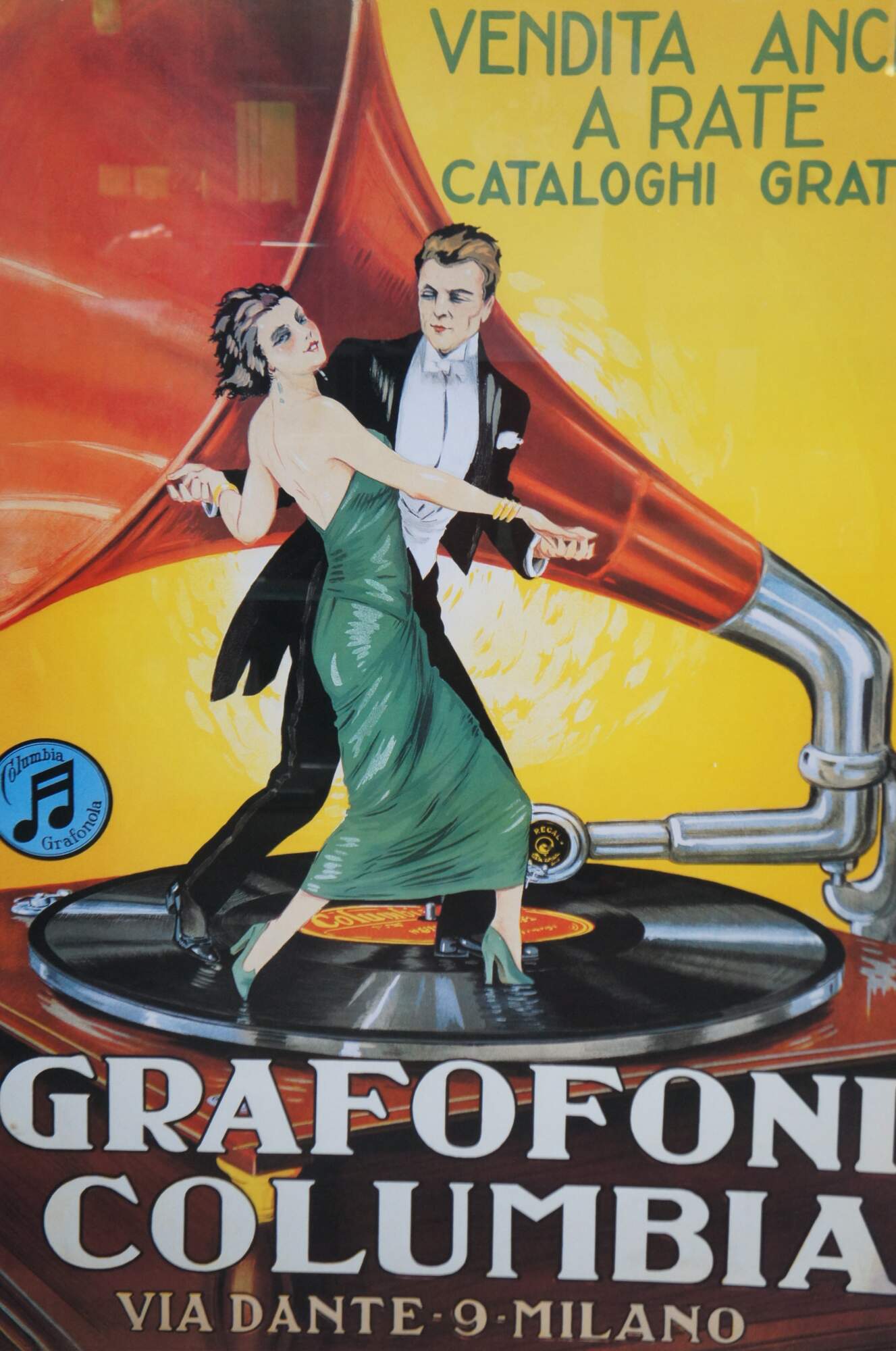 Vintage Leonetto Cappiello advertising poster for Grafofoni Columbia 1920 (Columbia Graphophone Company). It shows a couple dancing on a gramophone player. This poster was groundbreaking in its time because Leonetto Cappiello created an impressive aesthetic effect by painting figures on a monochrome background combined with vividly colored graphics that influences many artists to this day.