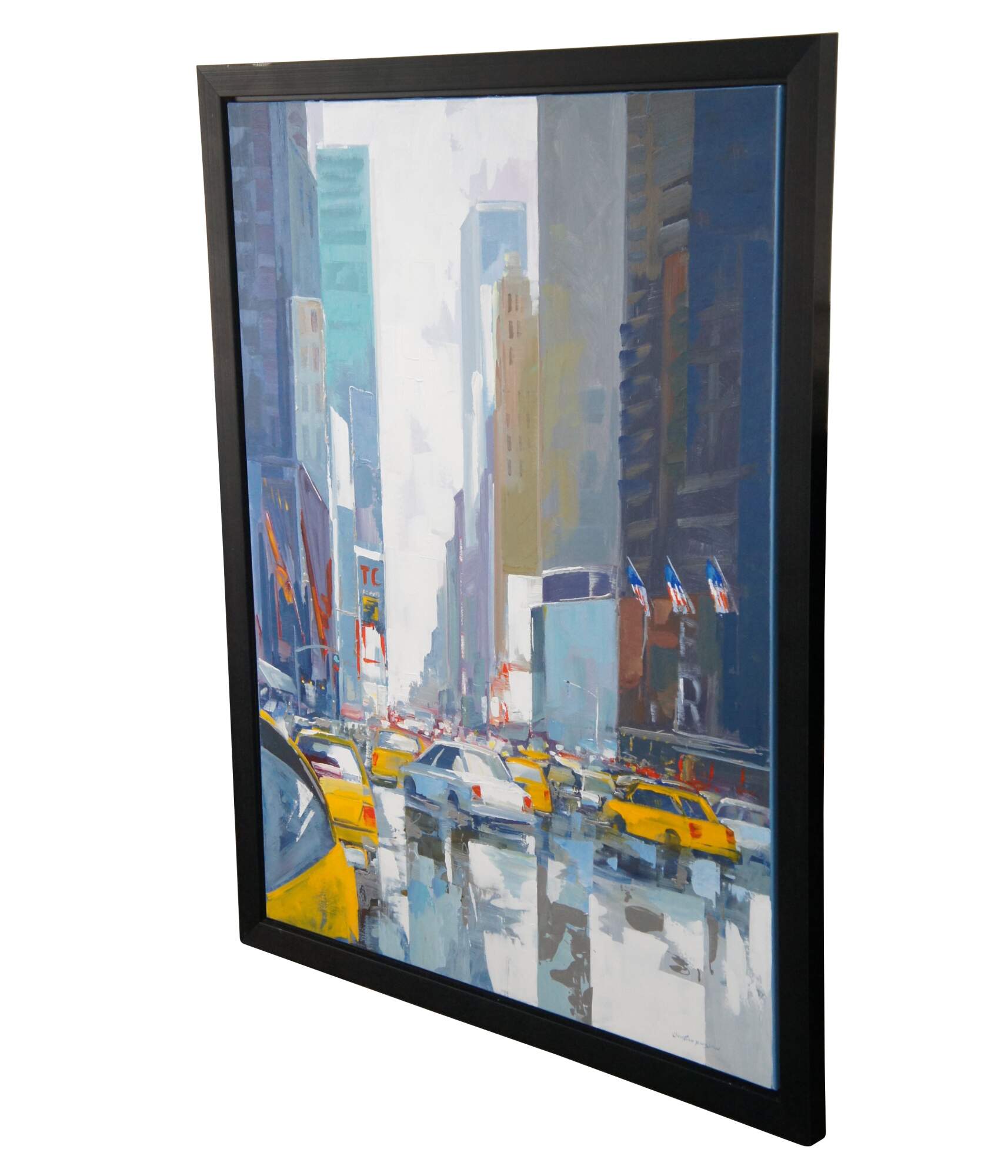 A large and impressive cityscape oil painting by Christian Bergeron featuring New York City. Aptly titled New York New York and featuring a bustling view of cars / taxi cabs and buildings.