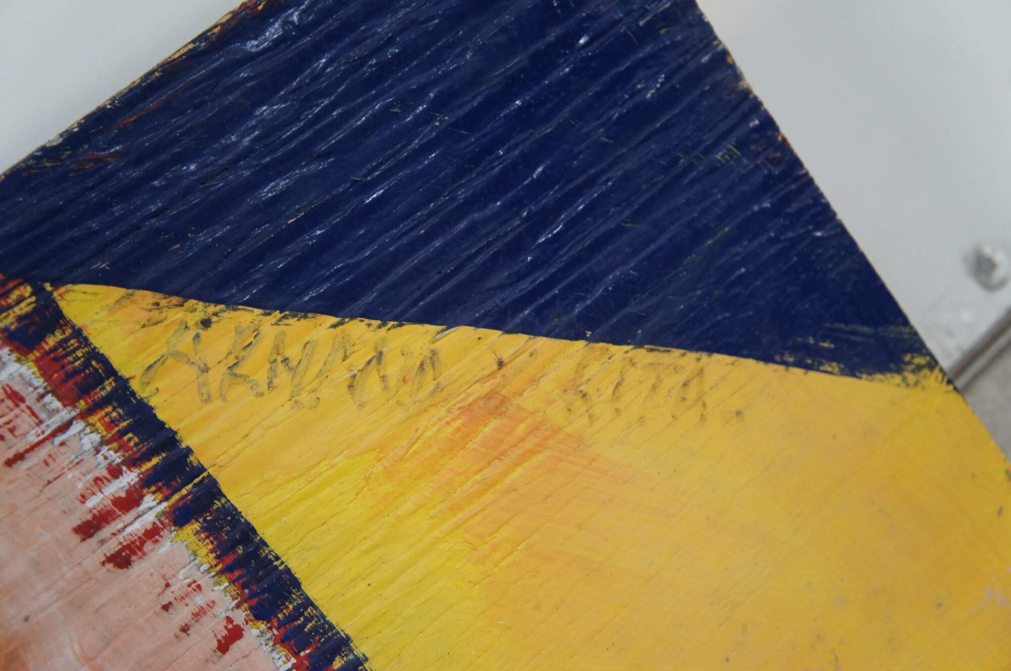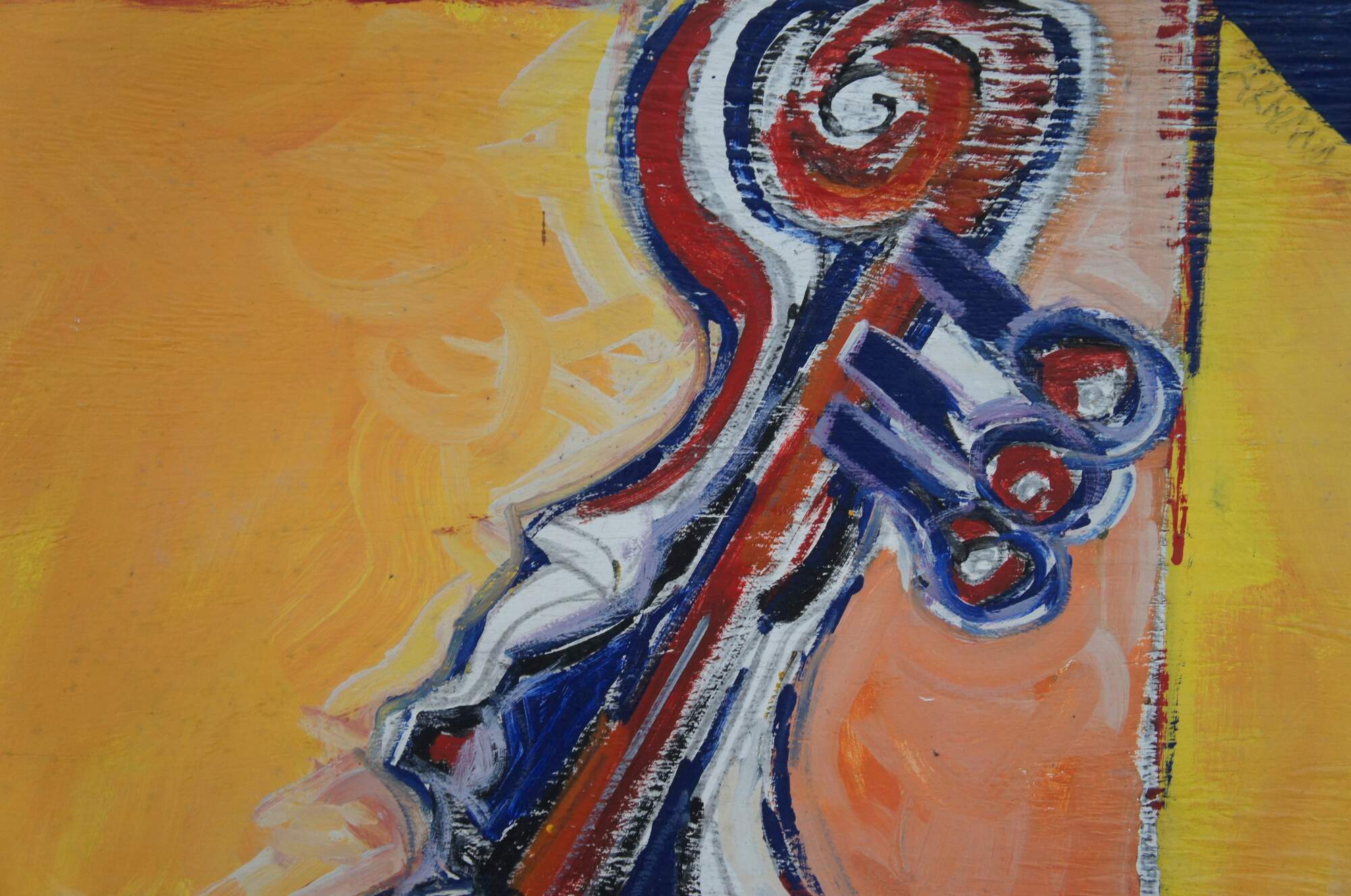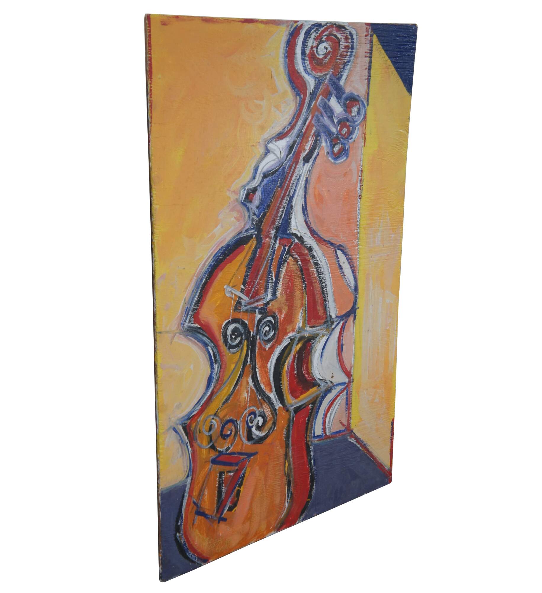 Vintage oil painting on board featuring a colorful Cello. Signed Armand and Rita.