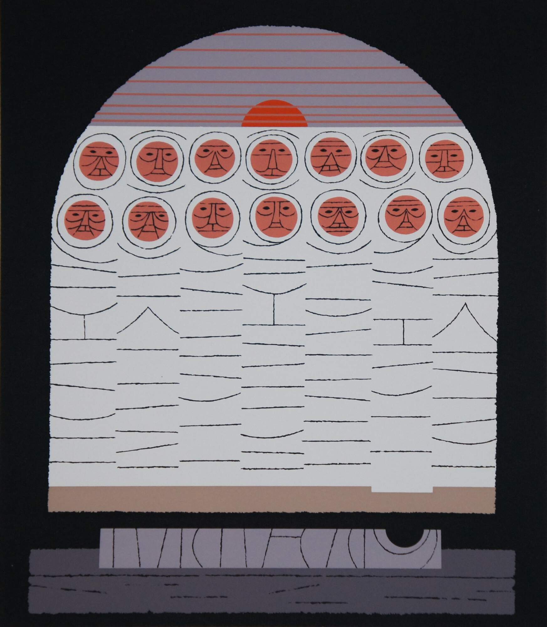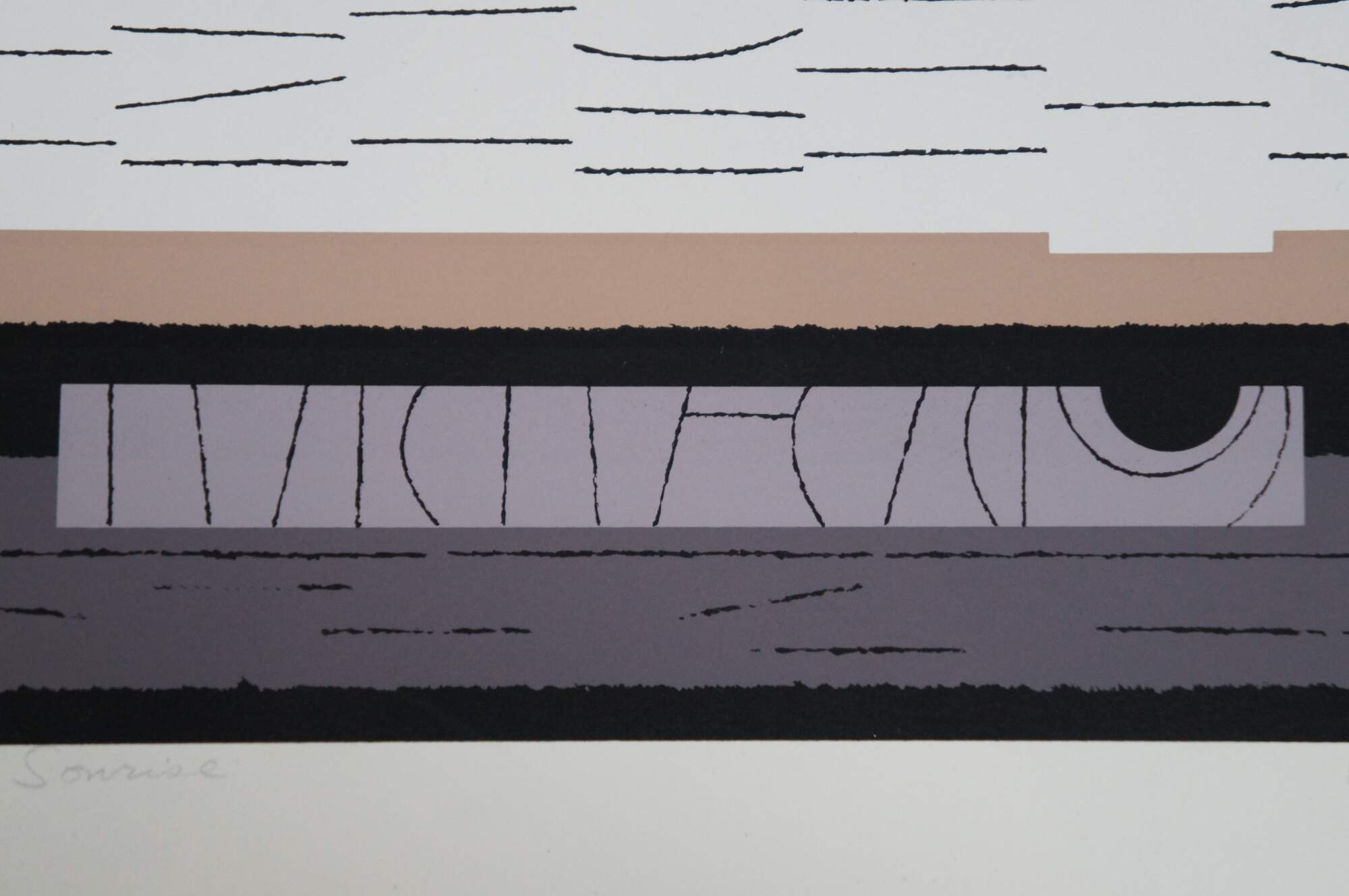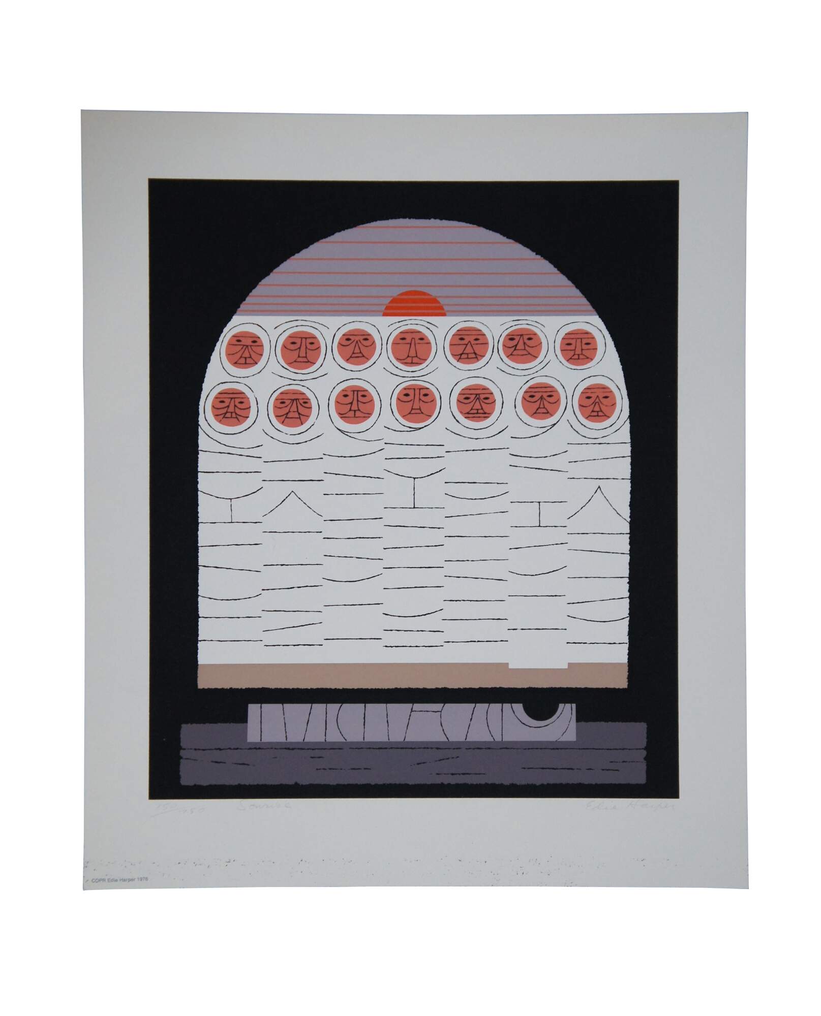 Vintage 1976 Frame House Gallery Limited Edition Collector Print of Sonrise by Edie Harper, showing the Biblical scene of a group of figures observing the empty tomb of Jesus as the sun rises behind them. Serigraph on paper. Pencil signed and numbered 150/750.