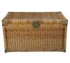 A vintage hand-woven Asian wicker rattan storage chest, 1970s. Ming inspired scalloped brass hardware depicts engraved birds and geometric oriental motif and symbols