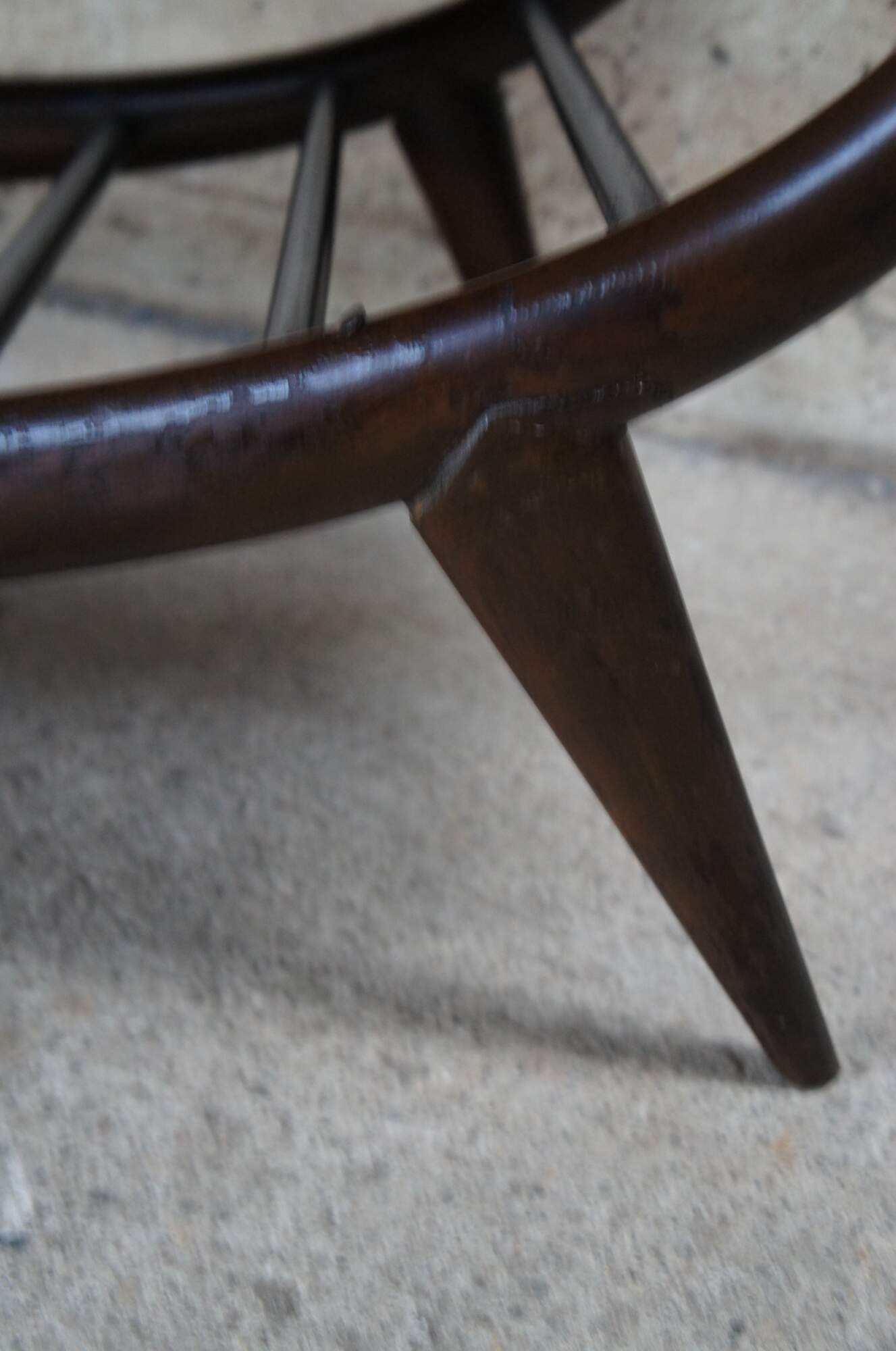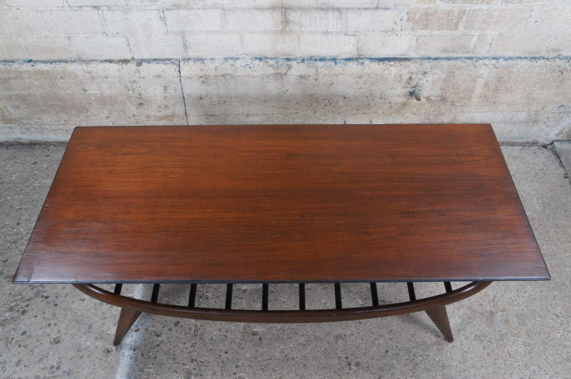 An impressive Mid Century Modern coffee table. Features a sculptural oak form with an open slatted base and tapered peg legs. Marked along underside 20529