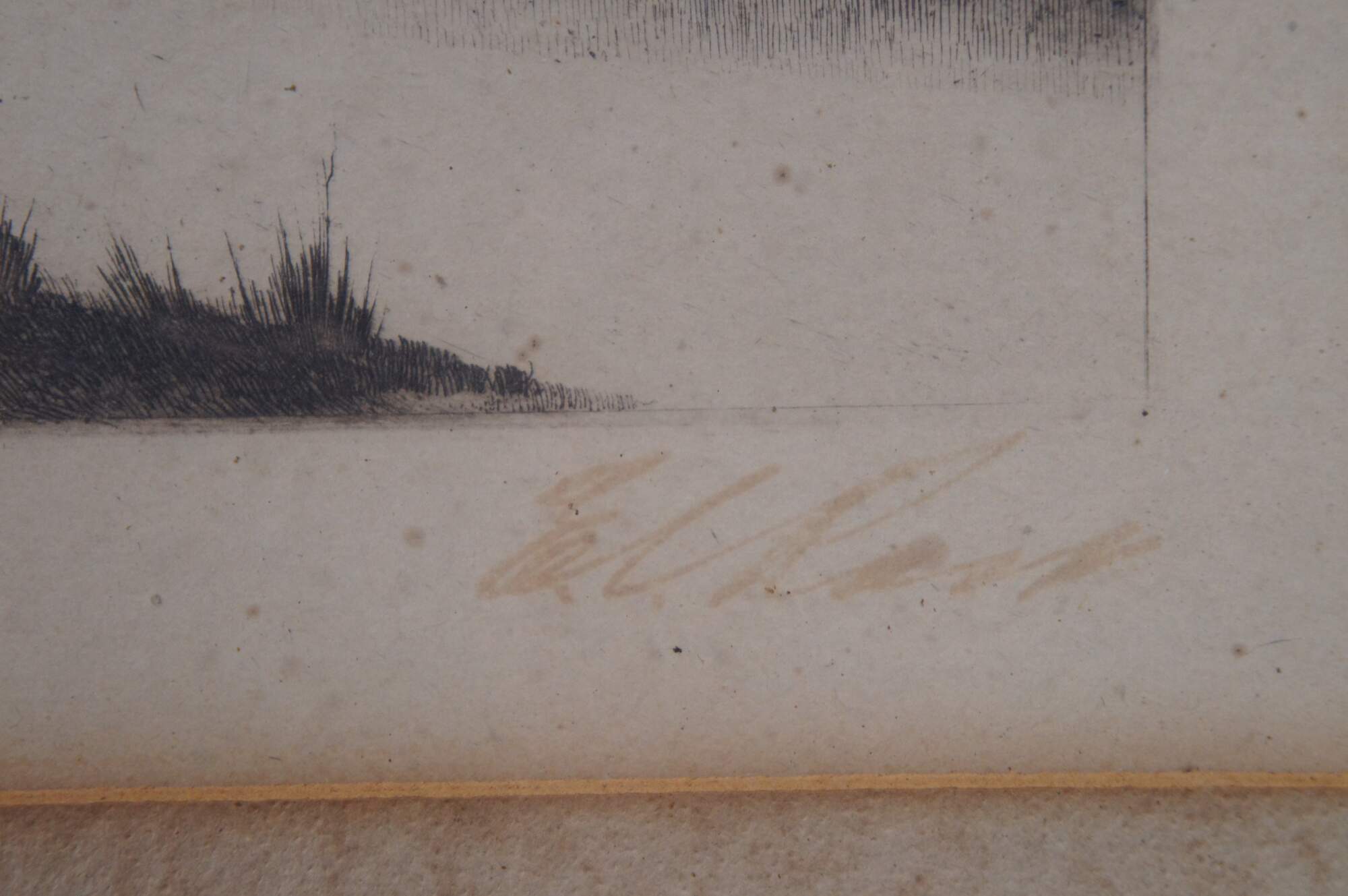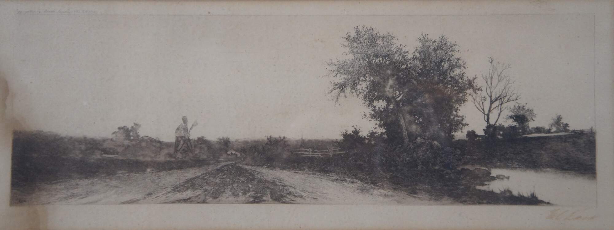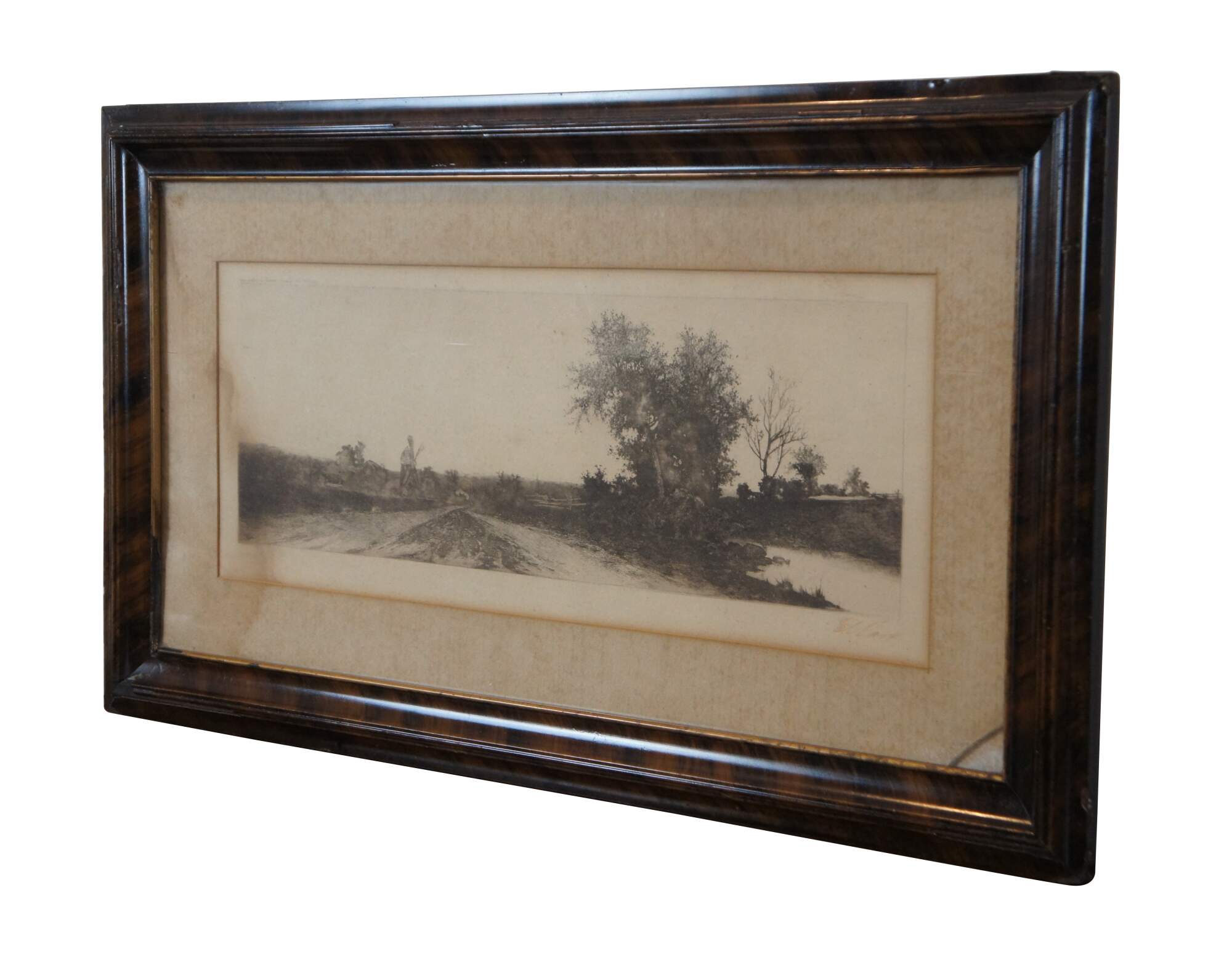 Late 19th century landscape etching by Ernest C. Rost, showing a country road flanked by fields, trees, and a windmill. Copyrighted by Radtke Lauckner & Co, New York, 1893. Signed in plate, lower left. Faded ink signature at lower right.