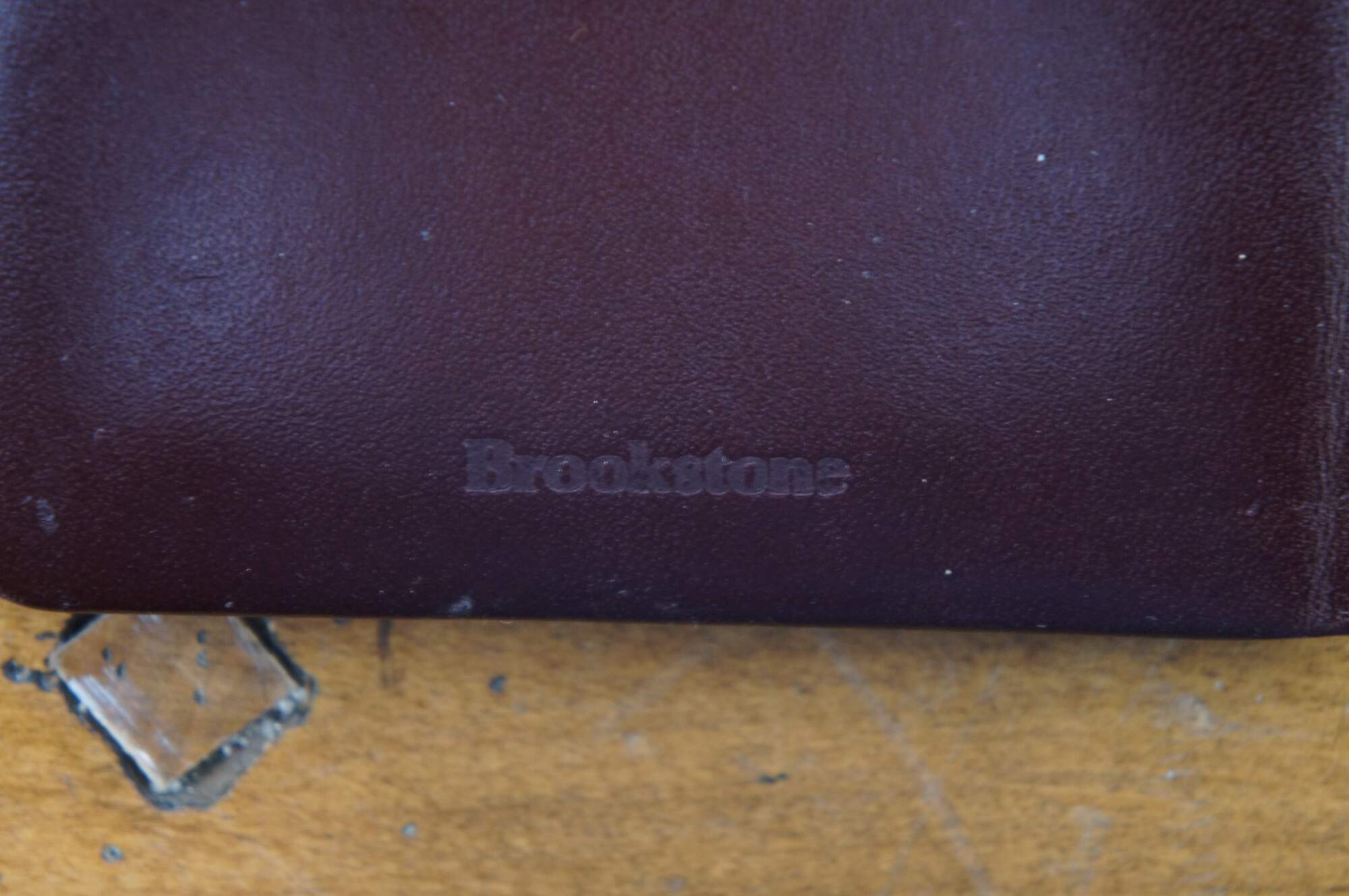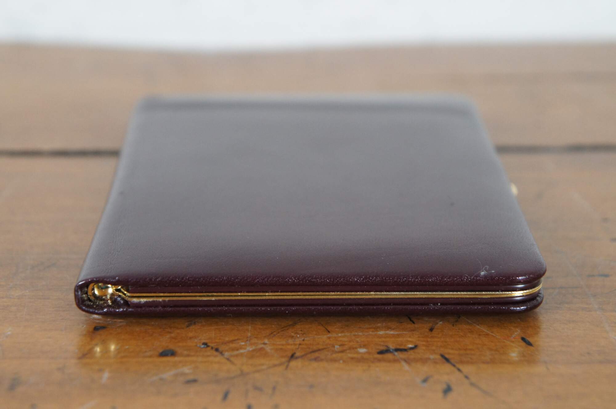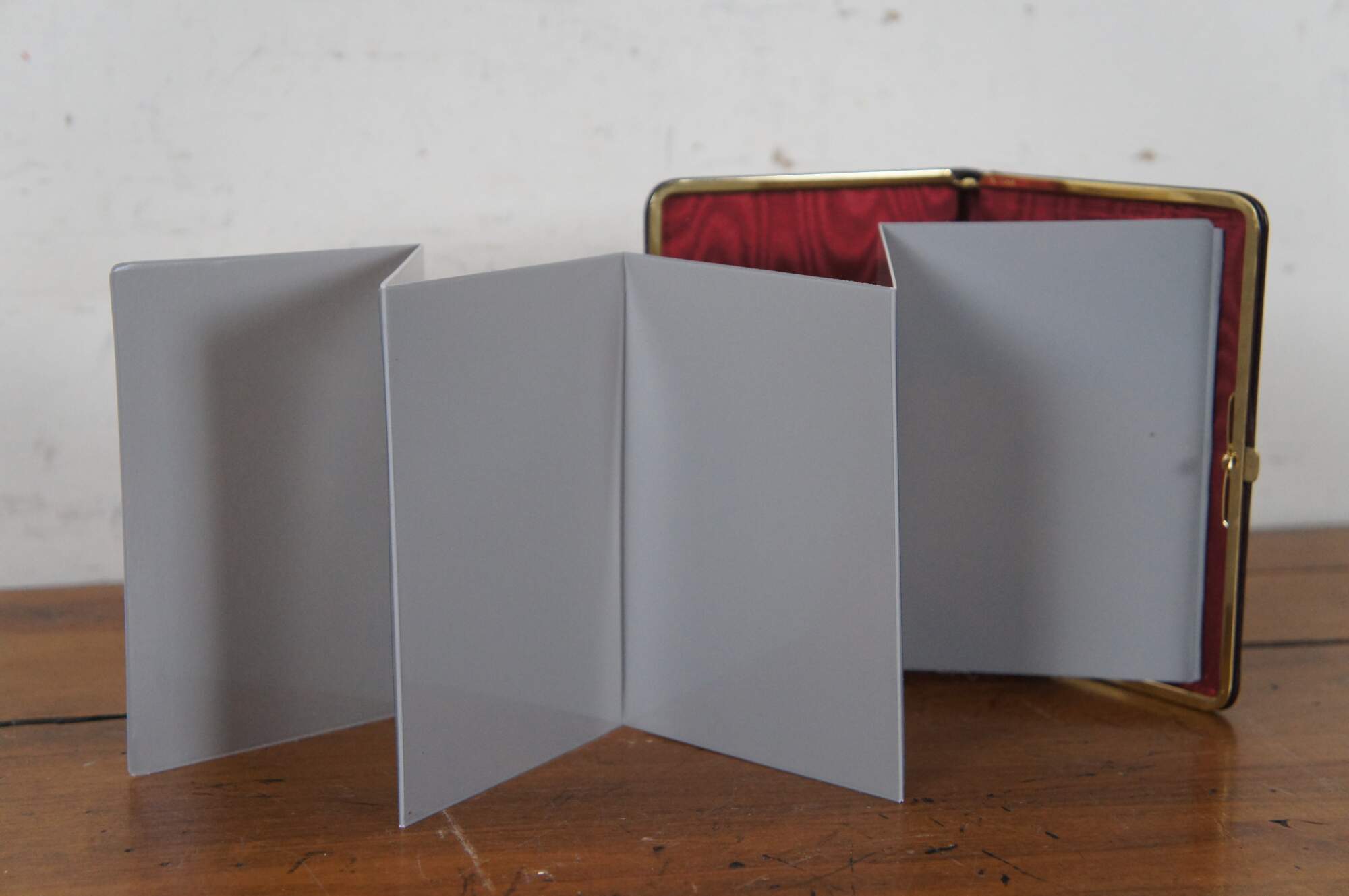 Vintage Brookstone photo album case in burgundy leather with red silk lining and brass clasp (West Germany) and accordion style photo slots with space for 12 pictures.
