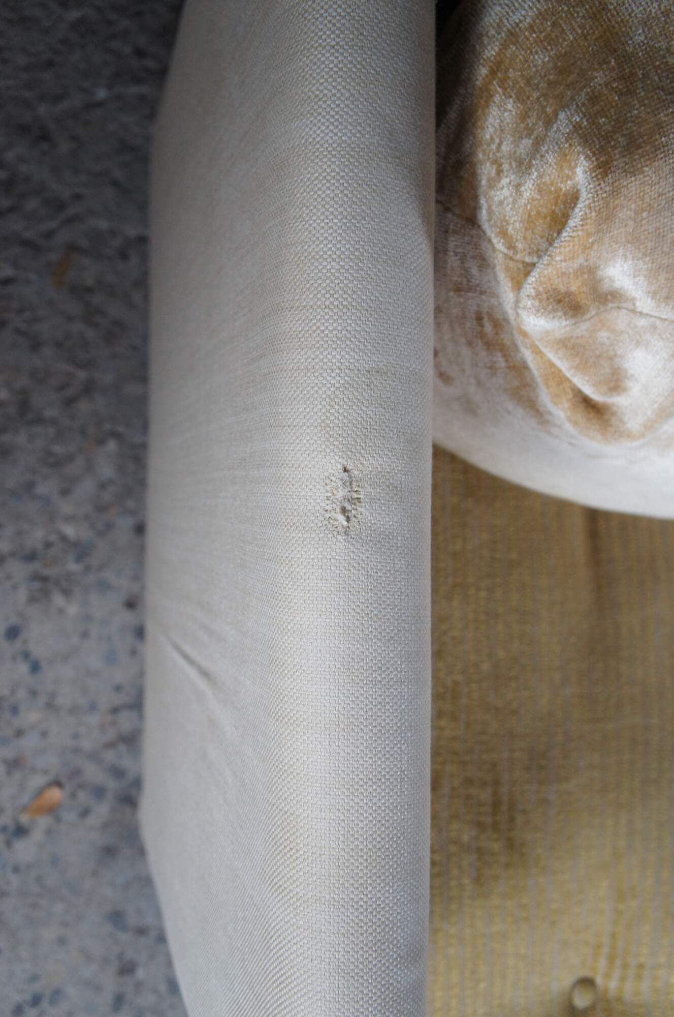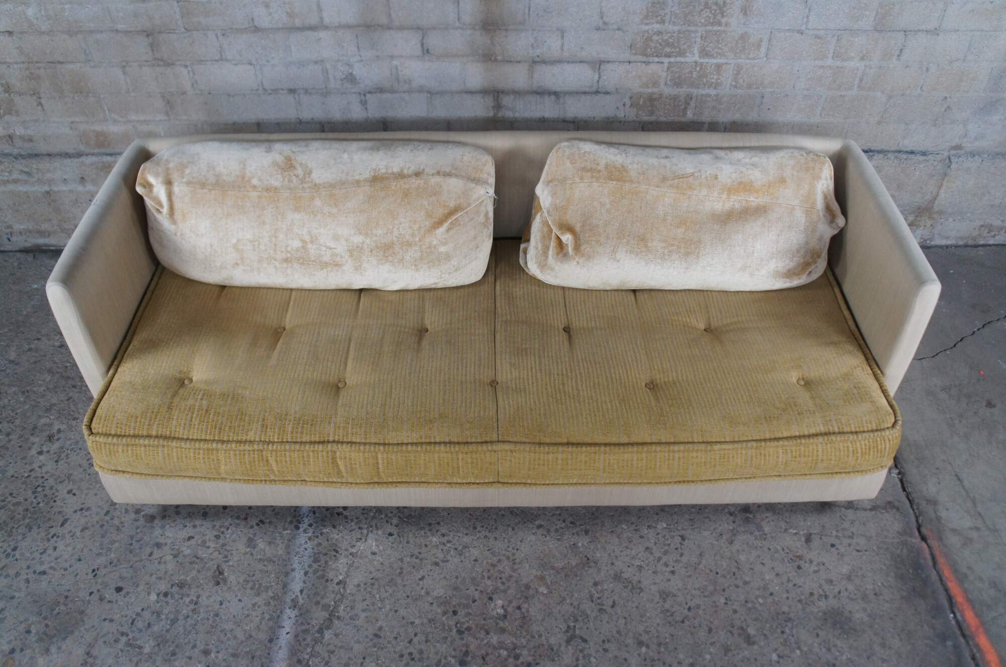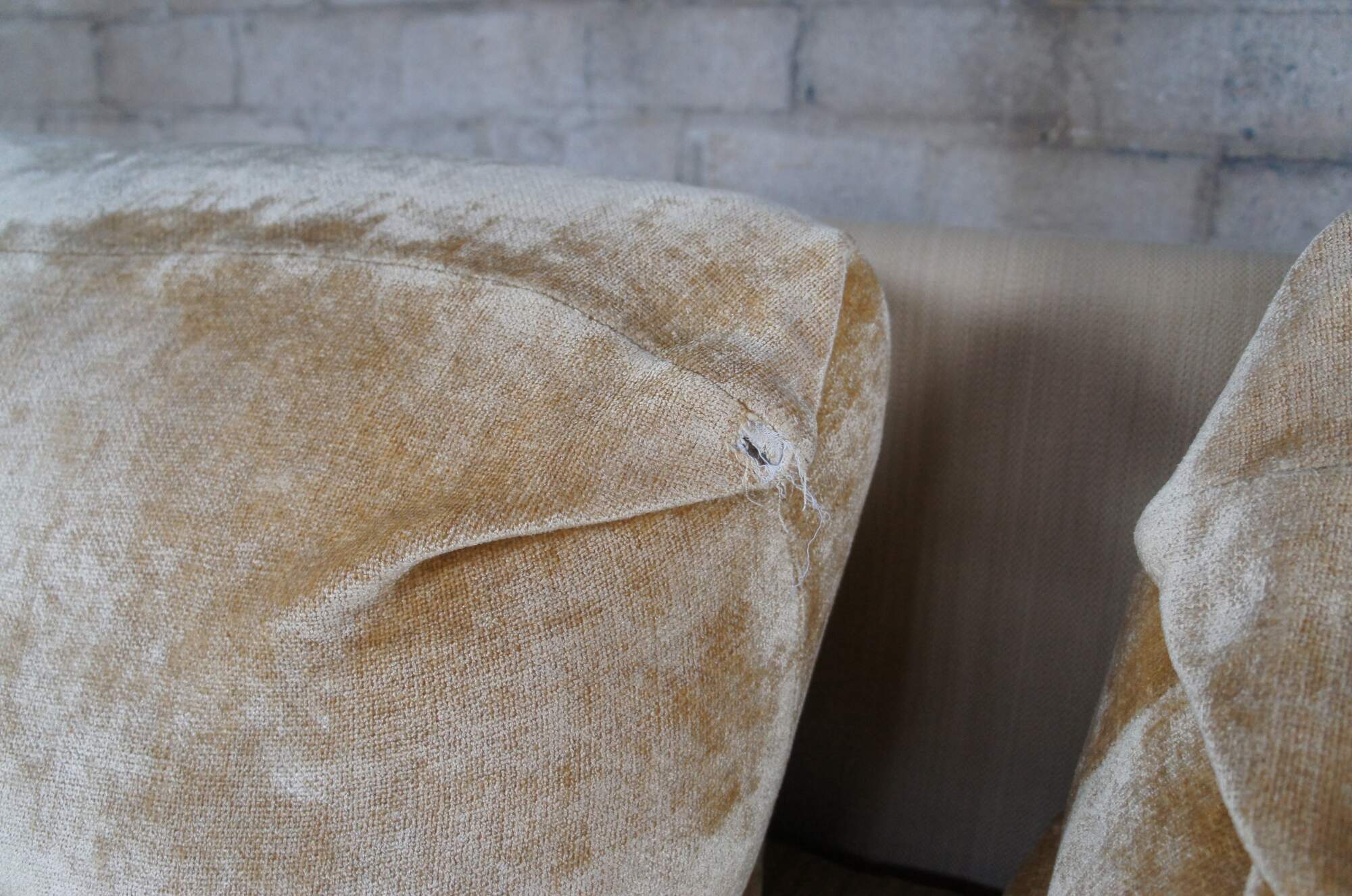 Good Overall; some age and use related wear, small tear to the top of left arm as well as one of the pillows.