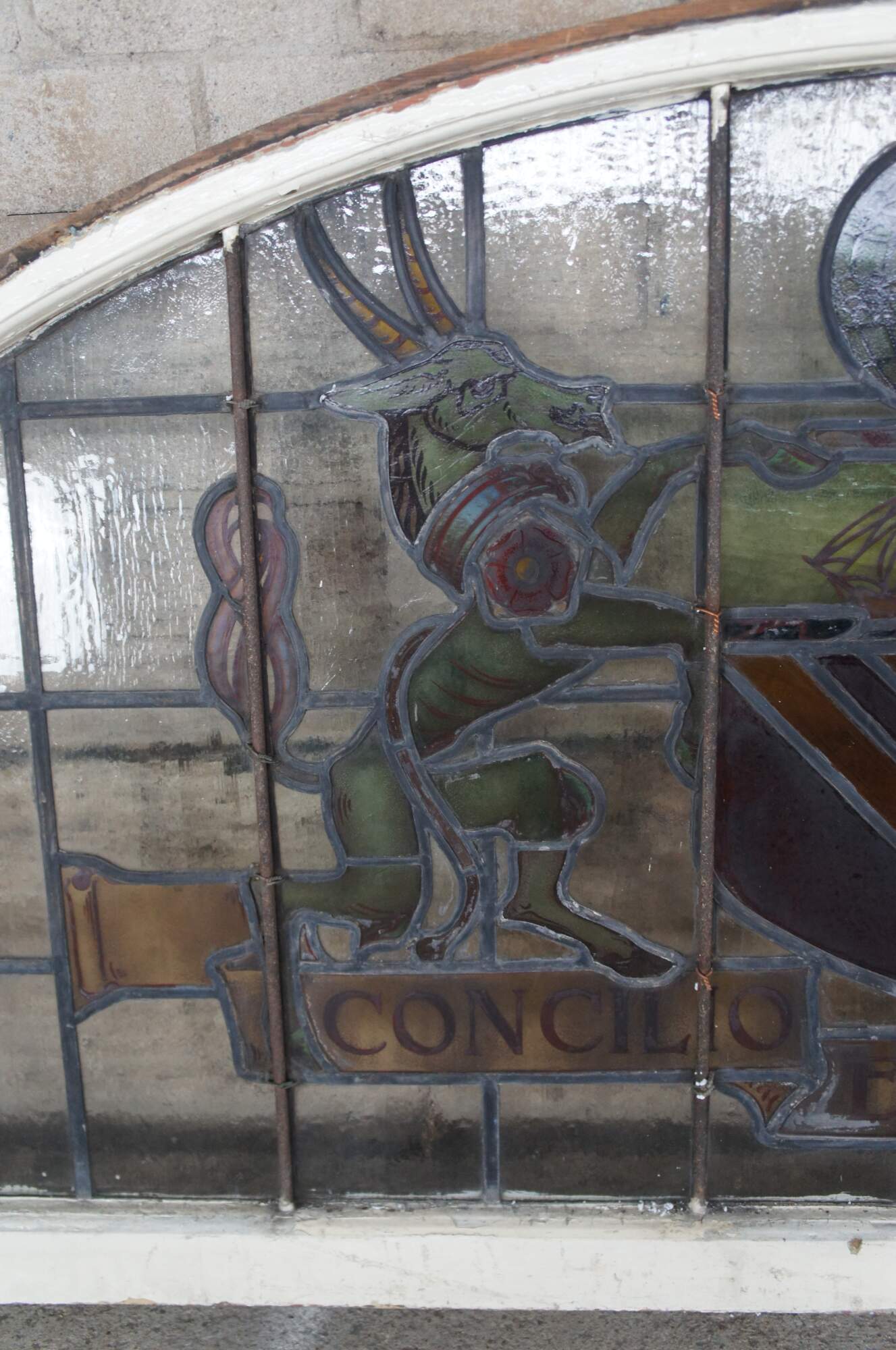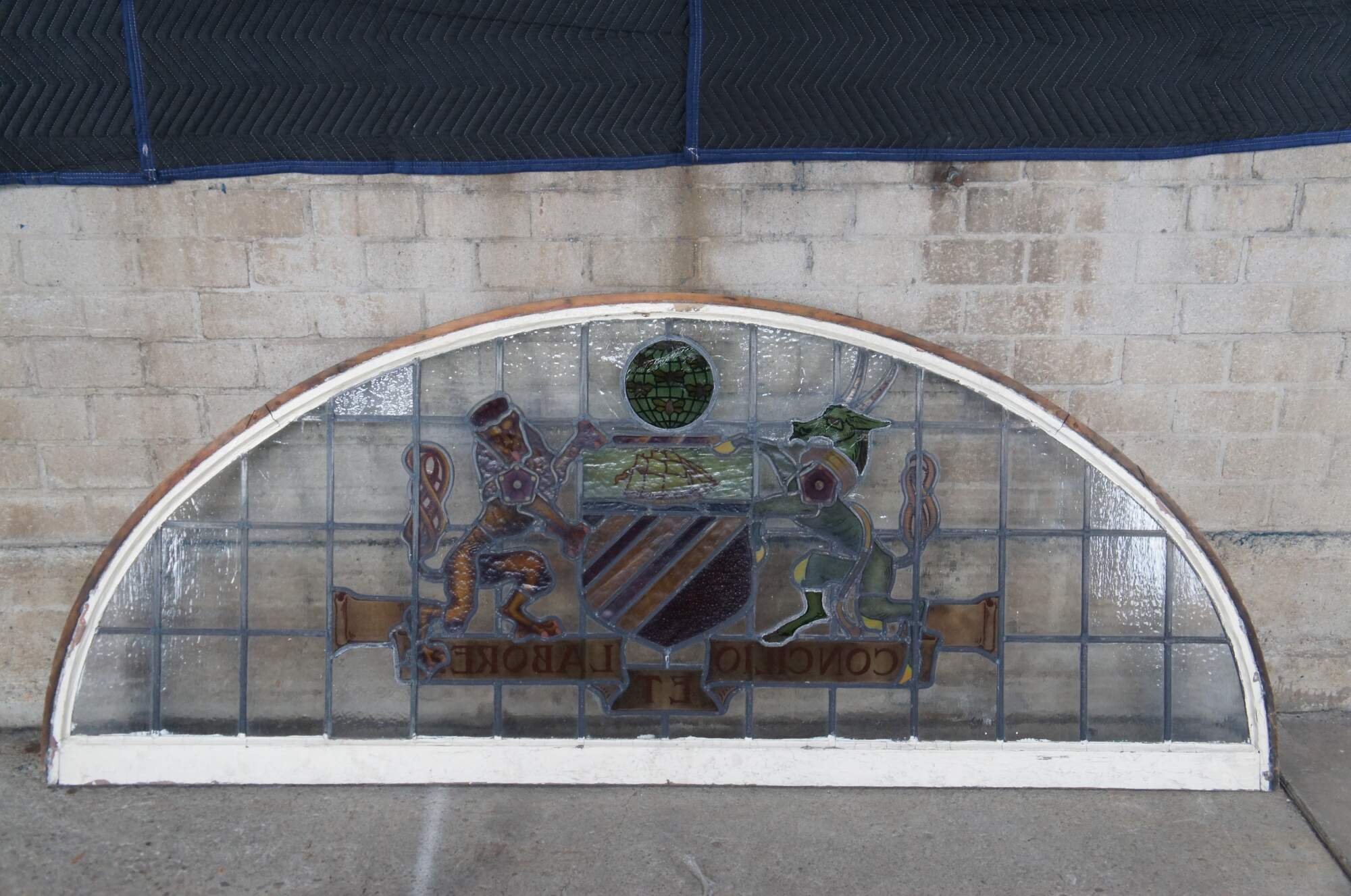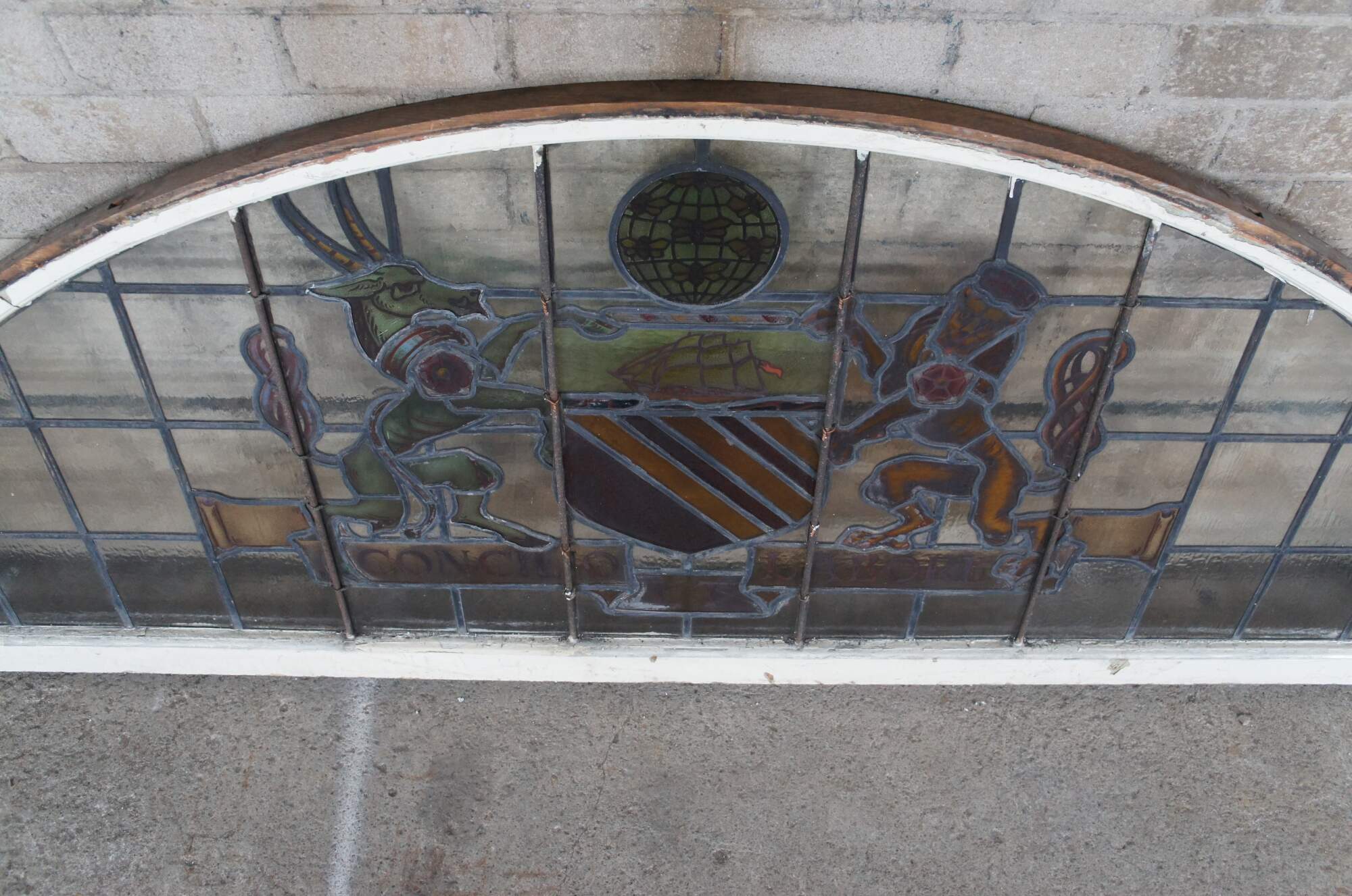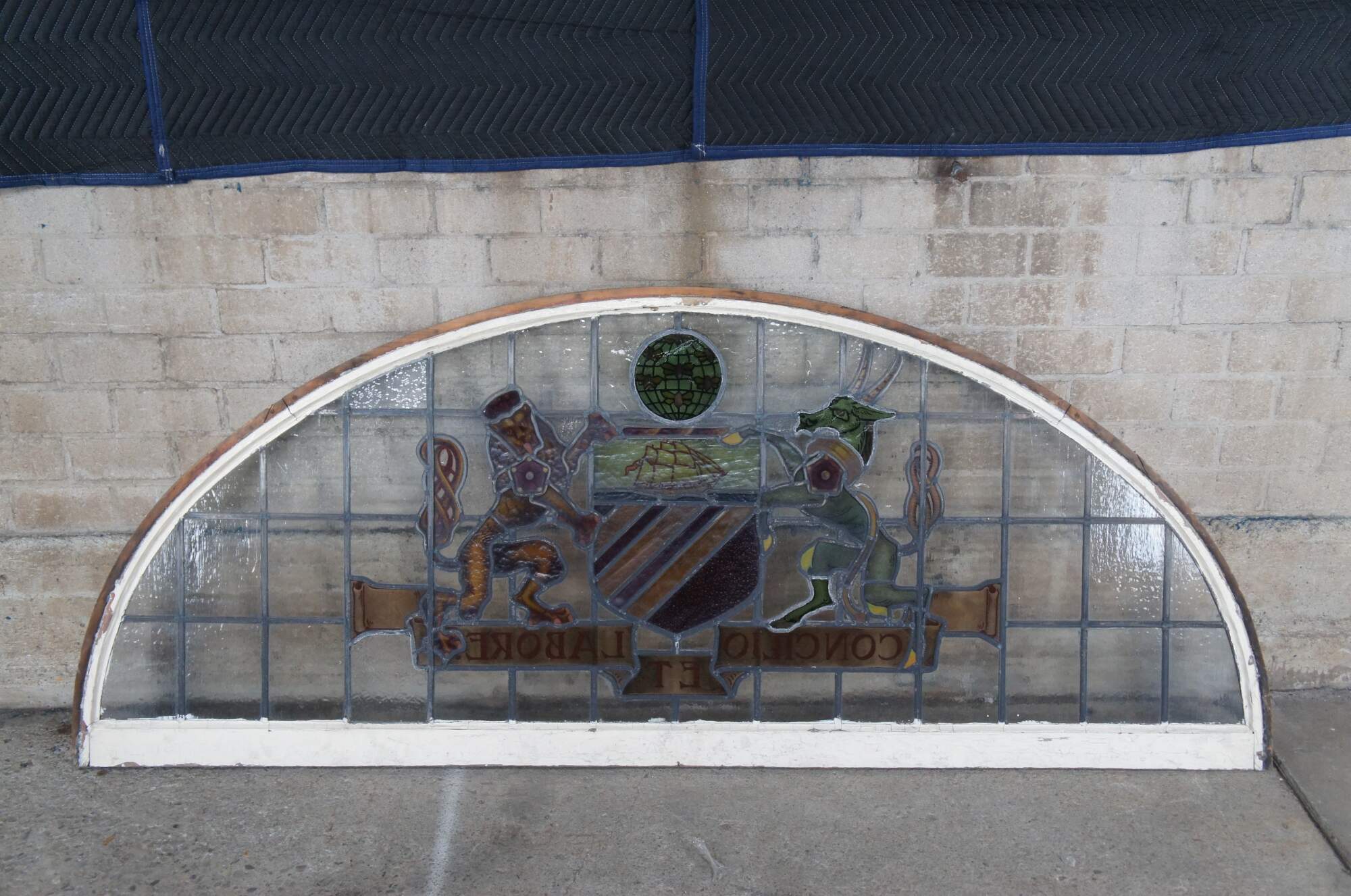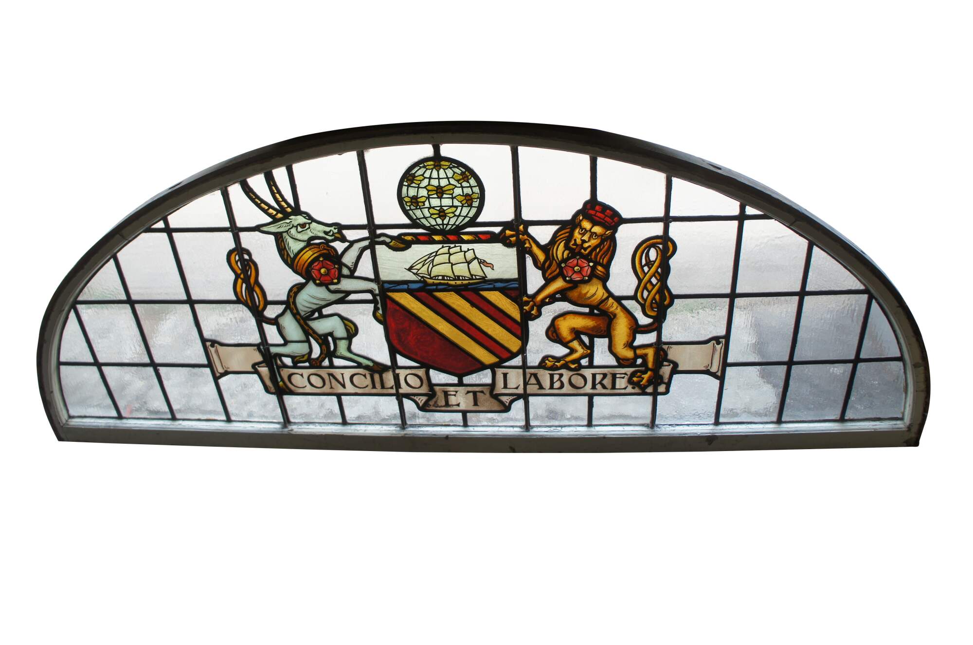 A fantastic very large pair of exceedingly rare leaded stained glass Palladian window panels, circa late 19th century. Features the Manchester England Coat of Arms, aptly titled 'Concilio et Labore' translated to 'By Counsel and Work' or 'Wisdom and Effort'. At the center is a heraldic Antelope and Lion centered around a shield beneath a ship and world globe with bees. The glass is boldly colored and impeccably designed. The coat of arms is centered over a large leaded lattice design and framed wood with an antique white finish. Removed from a prominent municipal building in England. Restored & Professionally Crated.