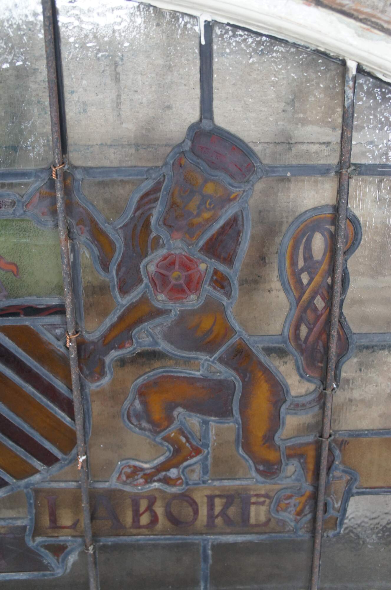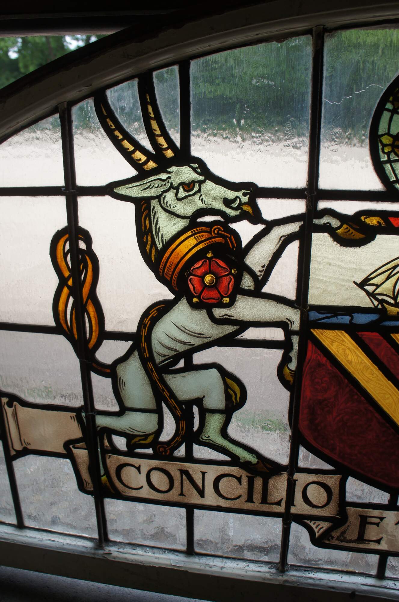 • Either side of the shield are an antelope and a lion, derived from the arms of King Henry IV, which can be seen from the red Lancaster rose on their shoulders