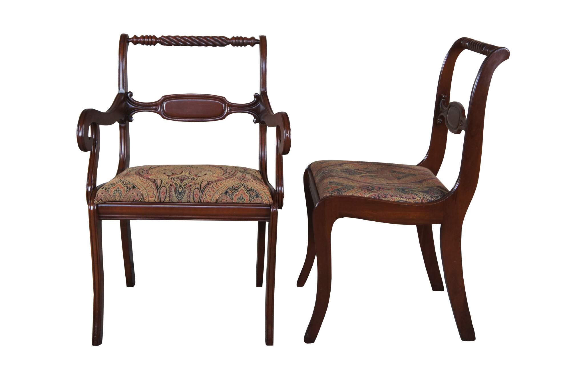 Set of six Antique Styled by Park dining chairs. Made of cherry featuring an open back design with barley twisted and fluted accents and paisley seat.