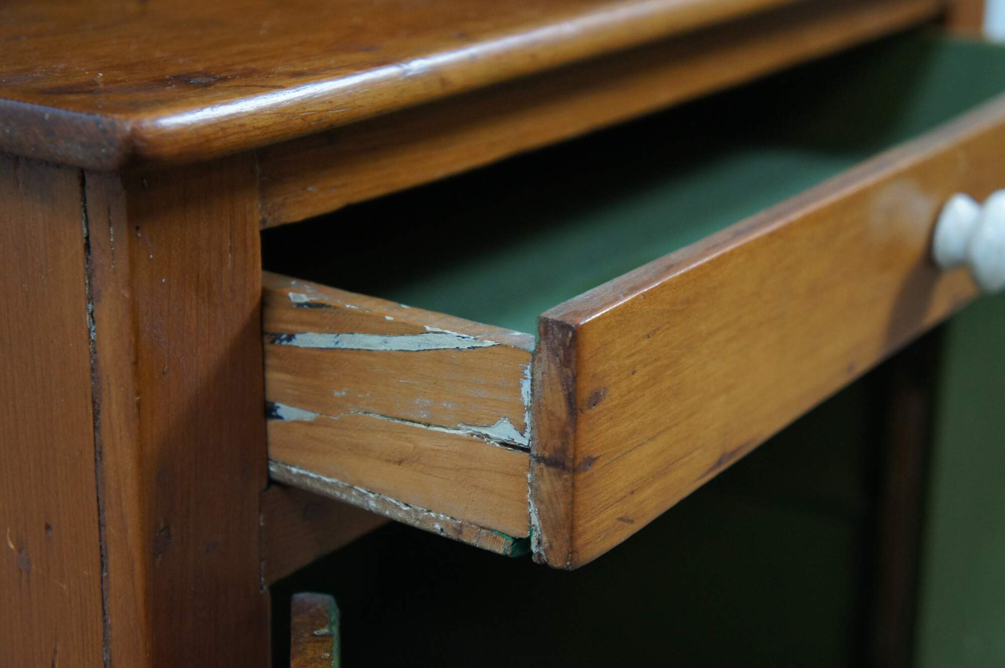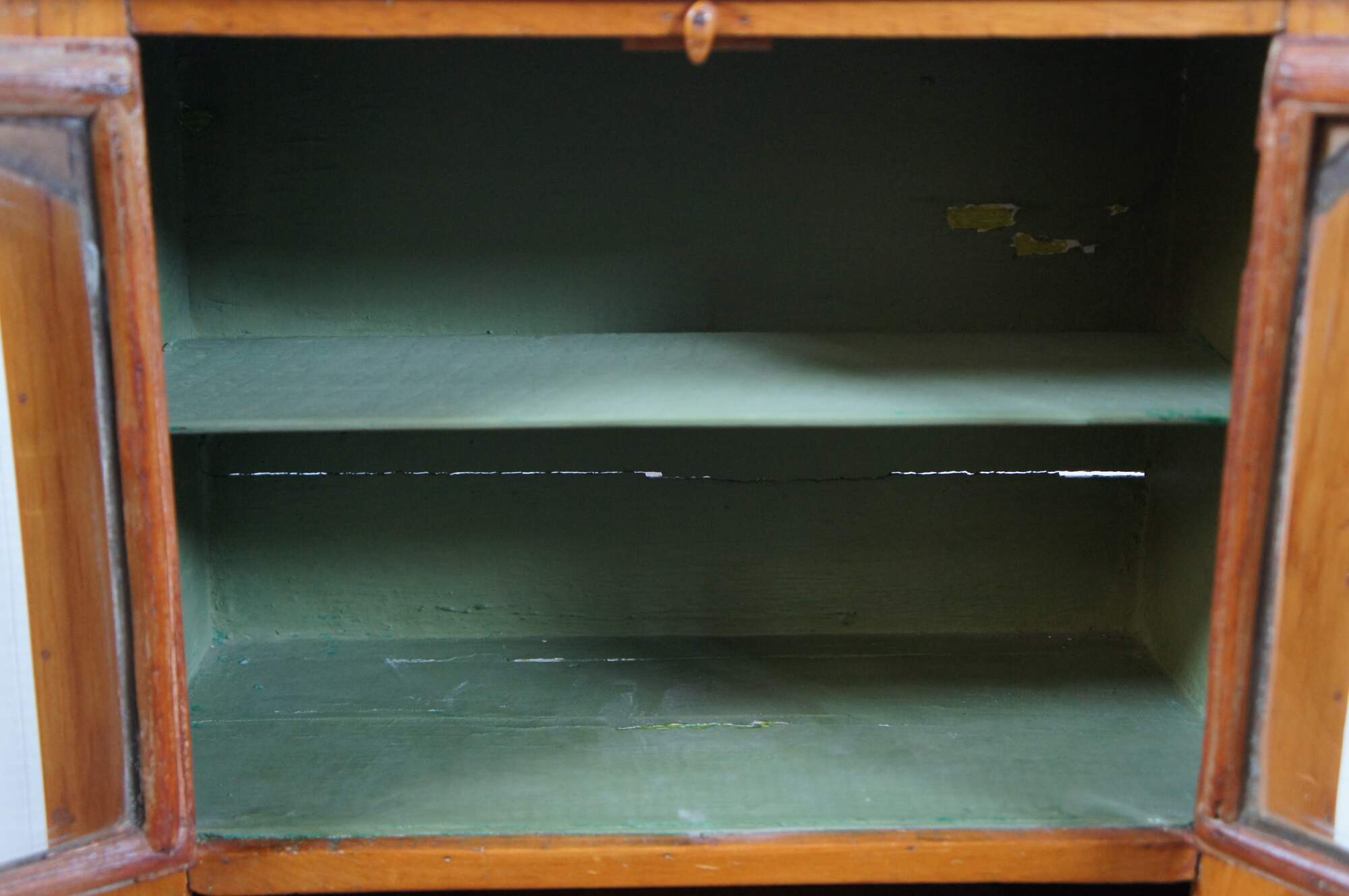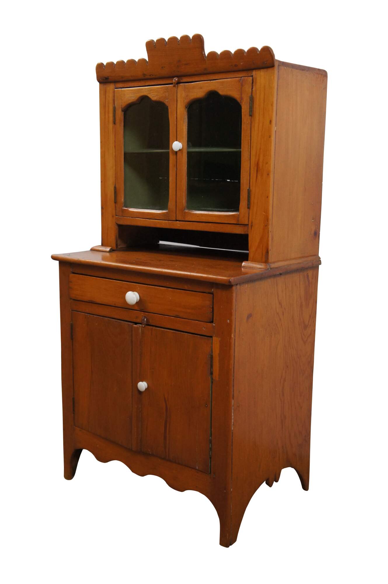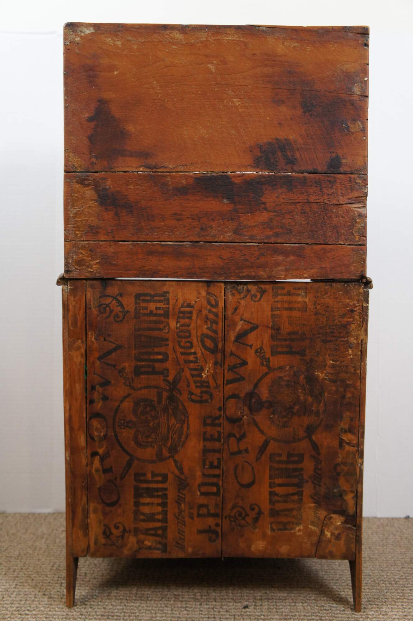 Antique salesman sample two part cupboard / cabinet / china hutch. Made of pine featuring scalloped pediment and skirt, glass front doors on the upper cabinet, and white porcelain knobs. Interior painted olive green. Lower portion of cabinet backing repurposed from a Ohio Crown Baking Powder crate.