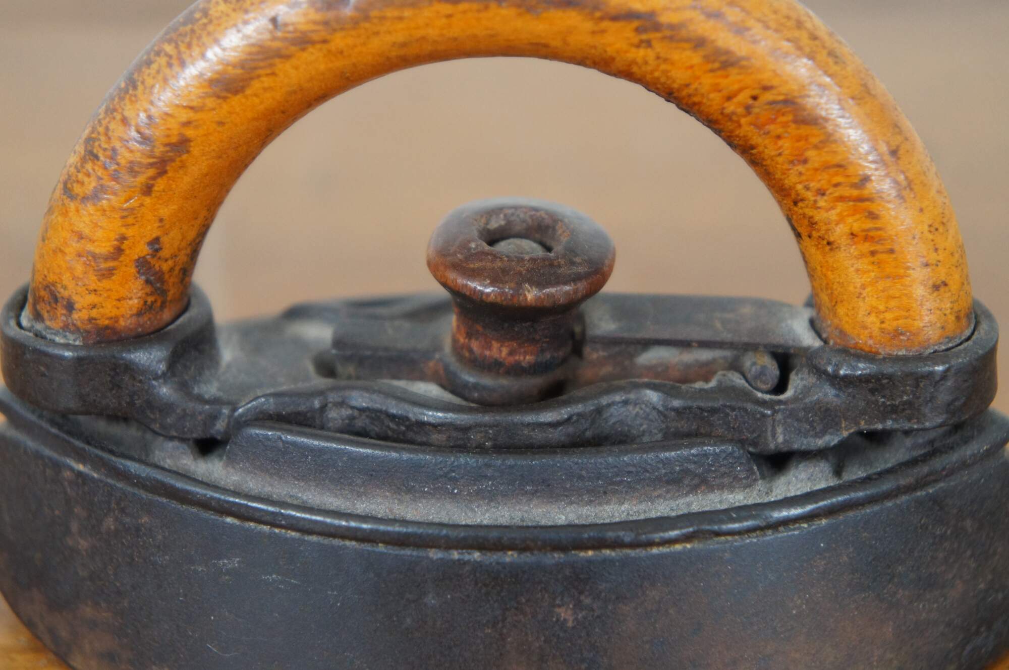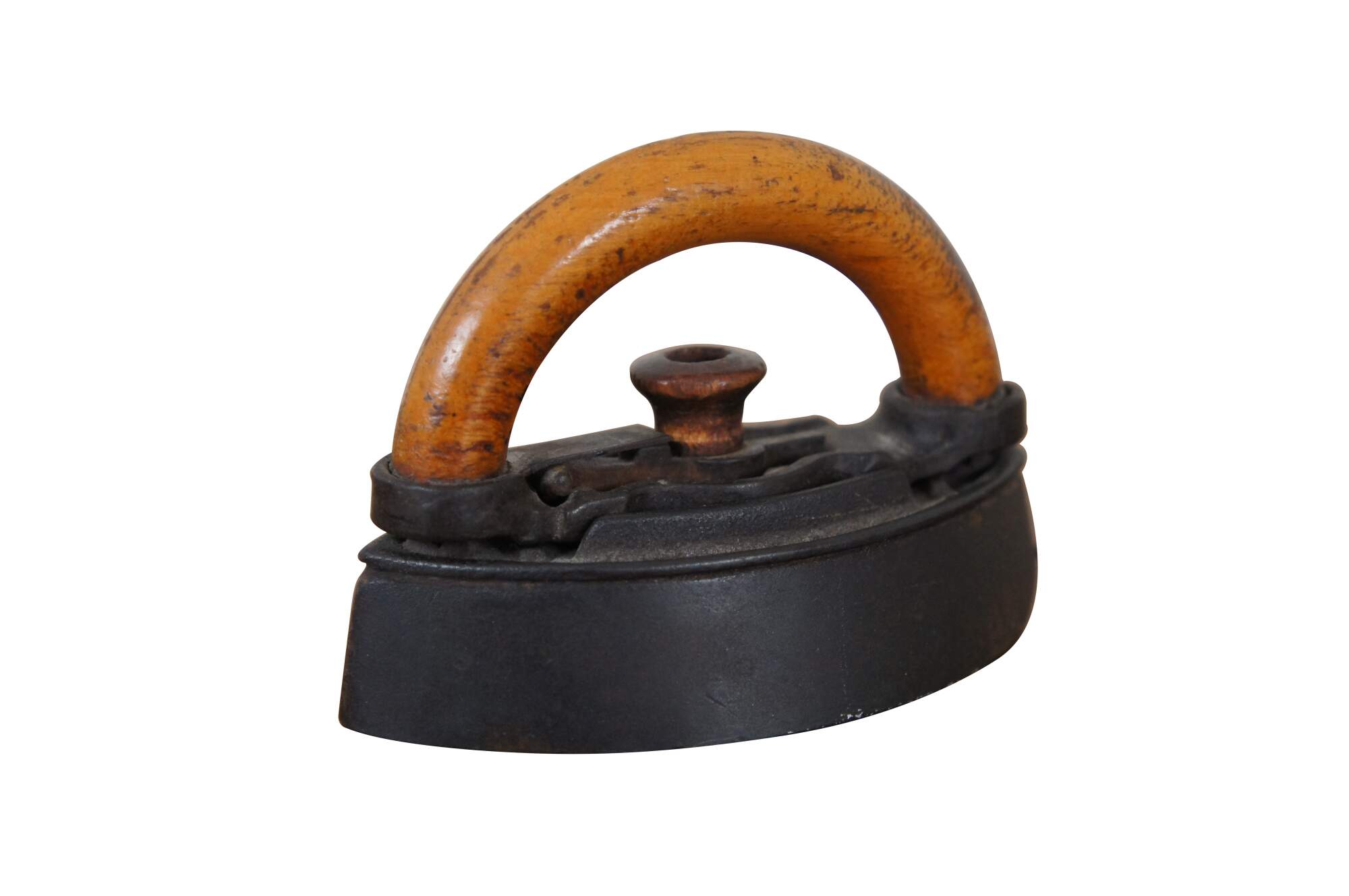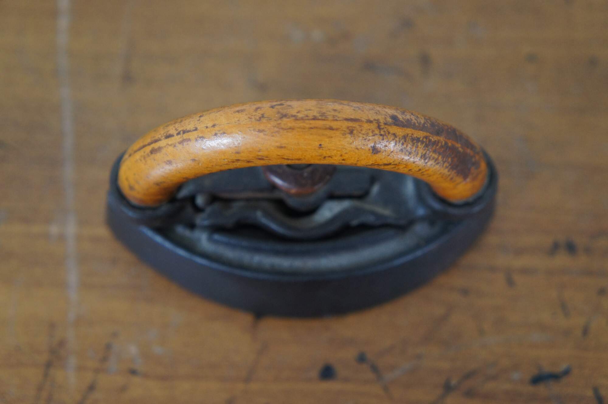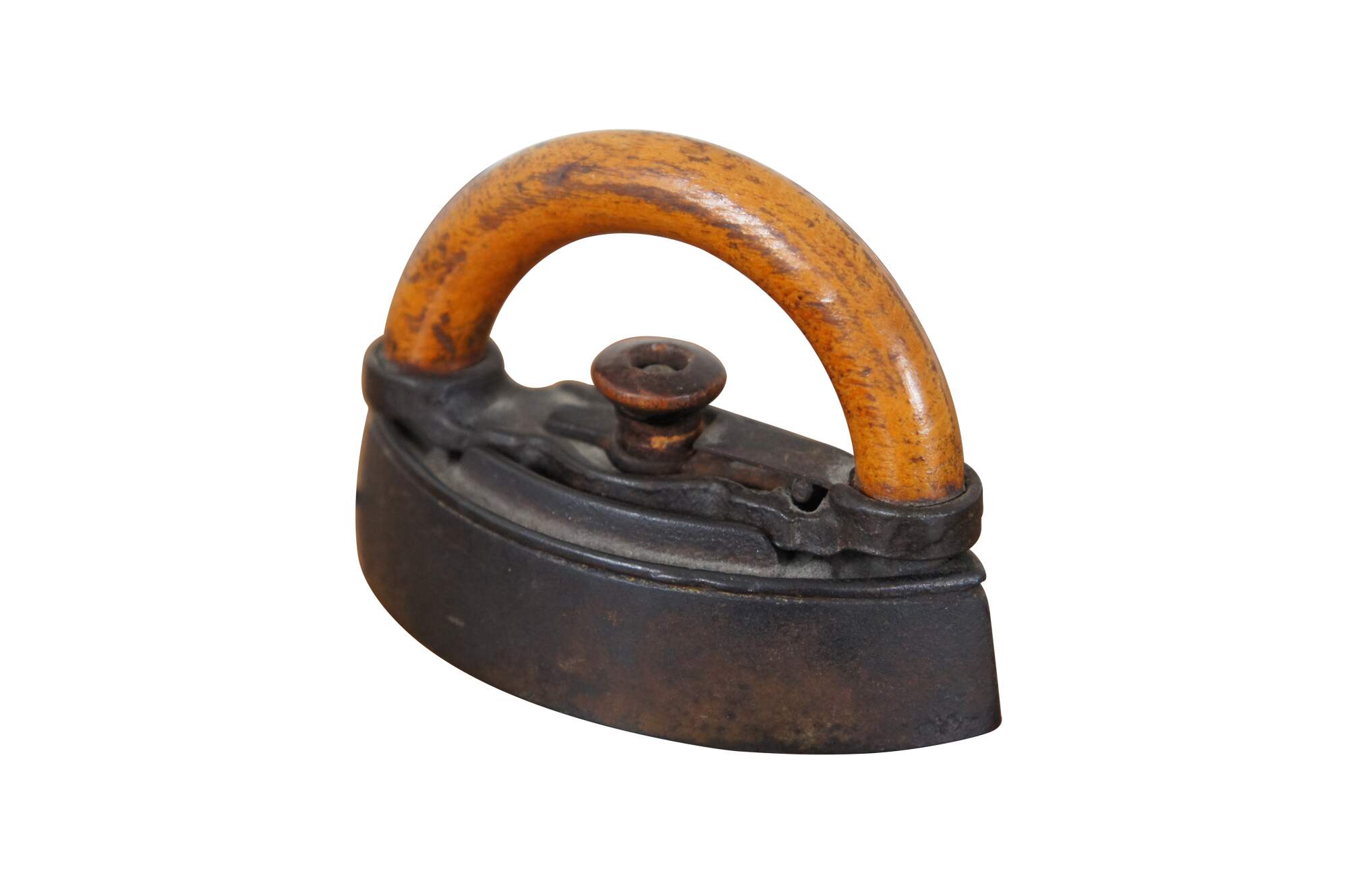 Late 19th century salesman sample / miniature charcoal sad iron / clothes press with arch shaped wooden handle and and finial. Top lifts off for access to interior.