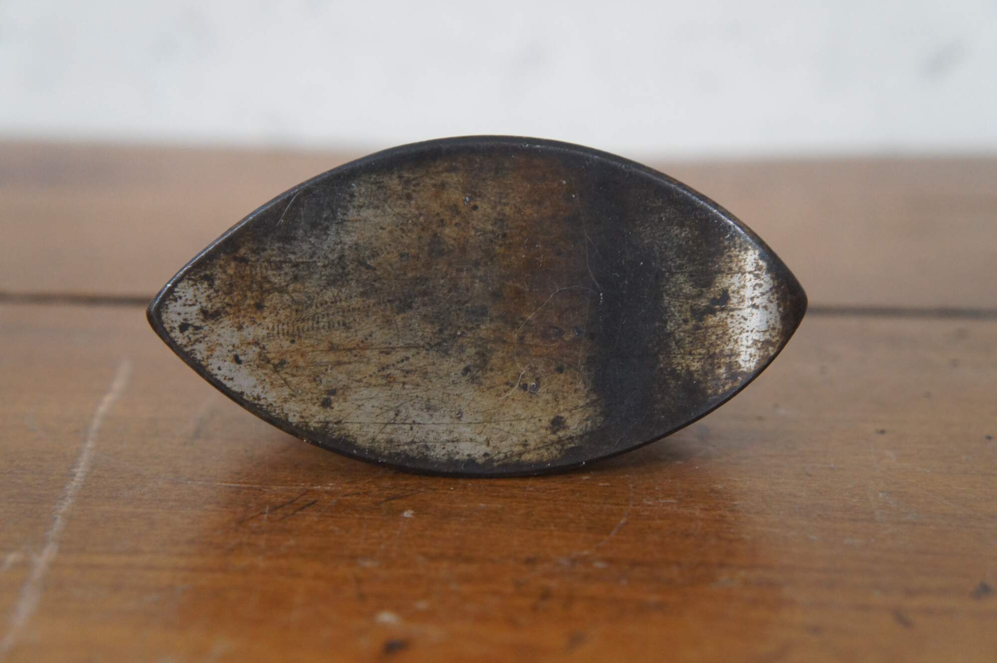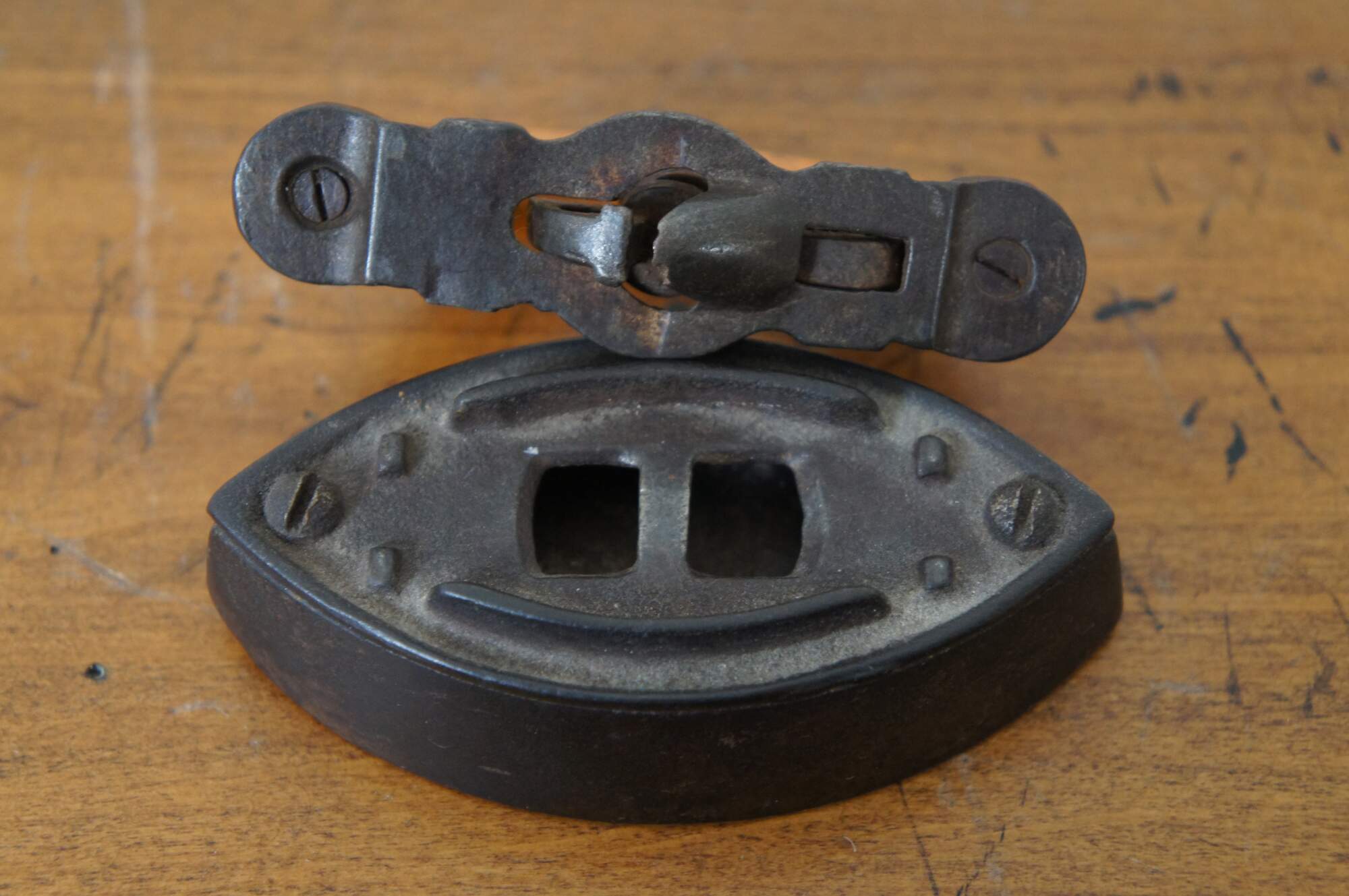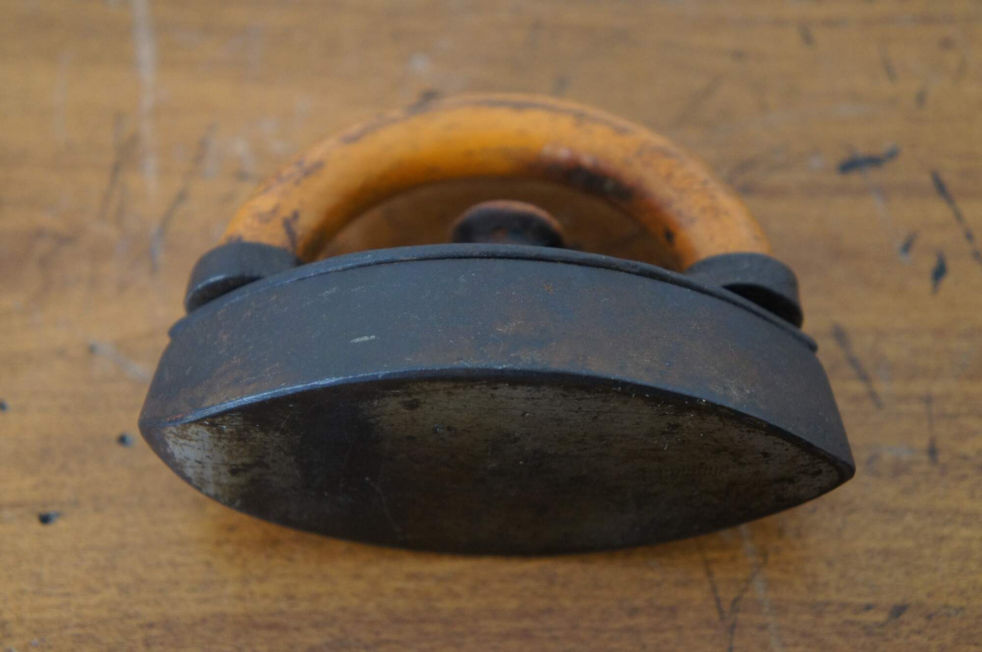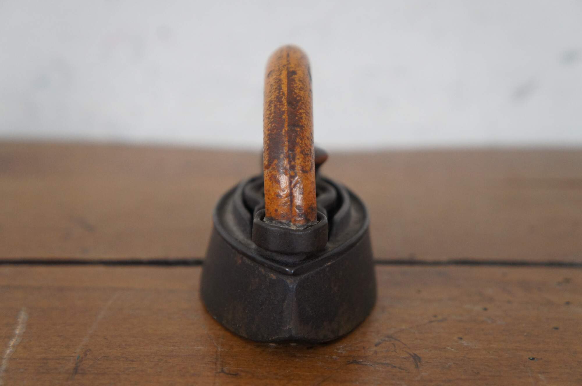 Late 19th century salesman sample / miniature charcoal sad iron / clothes press with arch shaped wooden handle and and finial. Top lifts off for access to interior.