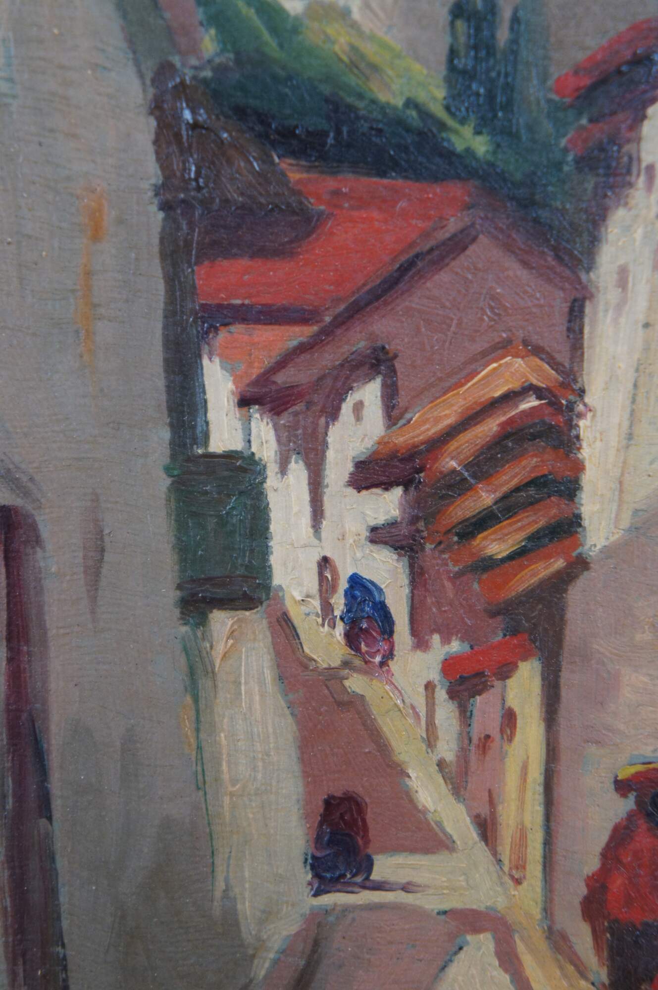 Antique Peruvian impressionist oil painting on board by folk artist Sr. Manual Vera depicting a street scene from Cusco Peru in 1936. The scene features a narrow stucco street lined with buildings and figures. It is painted on a ply wood tea box lid and mounted in carved wood frame. Cuzeo (Cusco), Partorsino 176 (Abijo de Puent) Lima, Peru, South America.