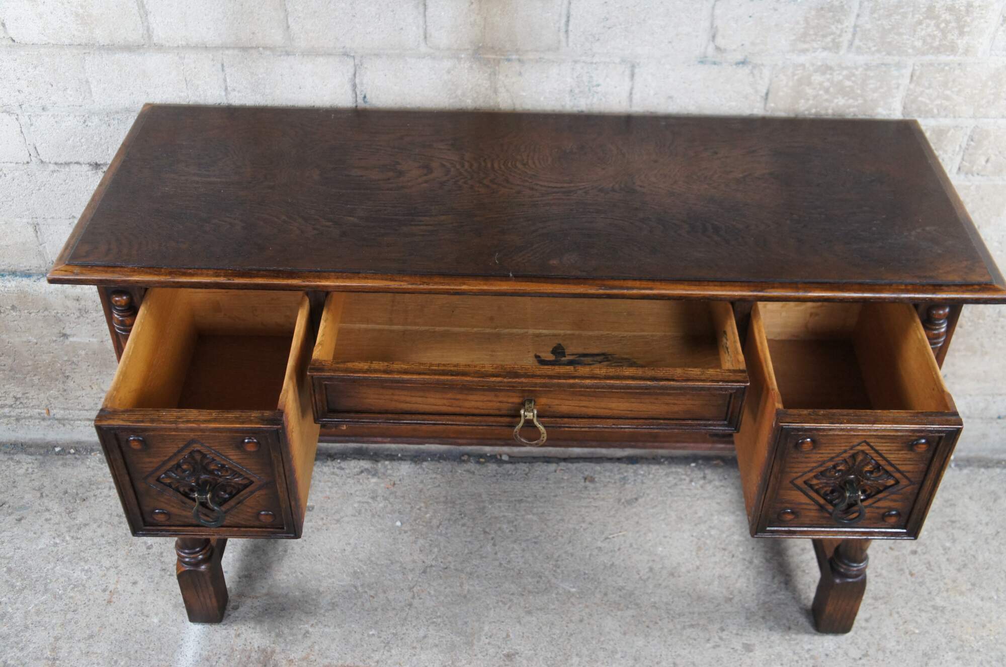 An impressive Spanish Revival dressing table by Saginaw Furniture, circa late 1930s to early 40s. Made from oak with three dovetailed drawers. Features a rectangular frame with intriguing diamond pattern acanthus carved accents with matching spandrels. The stiles are accented by quarter cut turned and applied spindles and raised diamonds over turned legs. Drawer pulls are made from iron with a rustic gold toned finish.