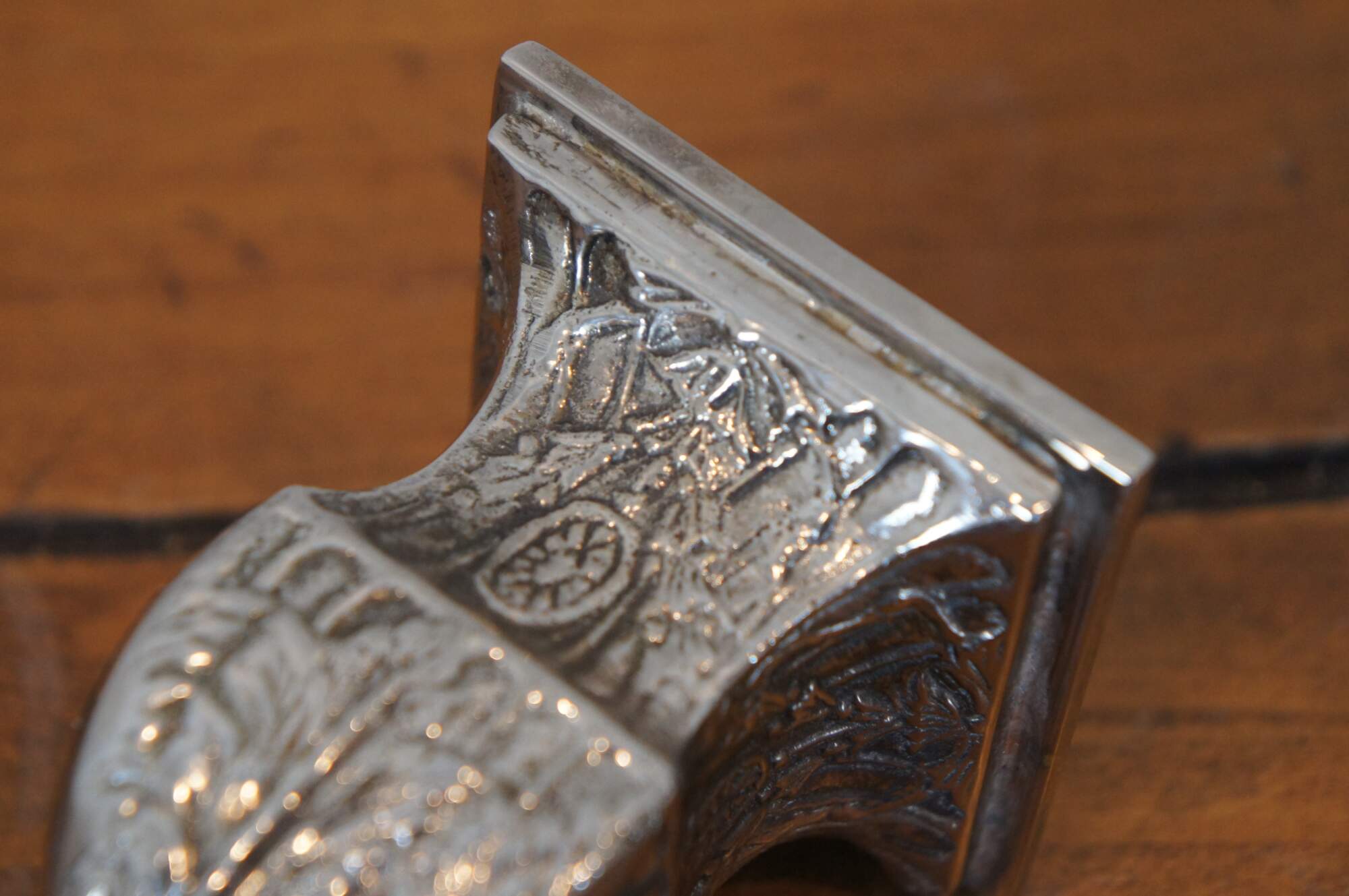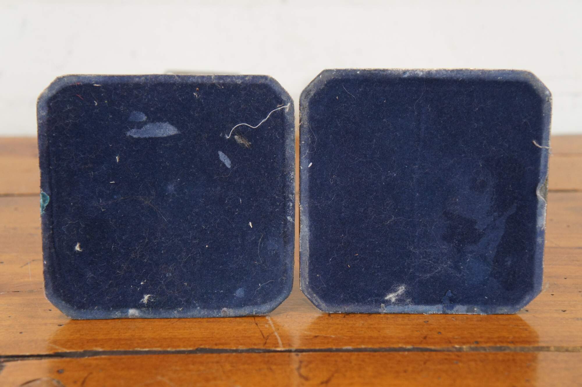 Pair of heavy, antique Georgian style repousse silver plate candlesticks / taper candle holders. Square cut corner base and tapered column with planter-urn shaped top, ornately decorated with swags of foliage, flowers and Neoclassical vases. Bottom of base covered in blue velvet.