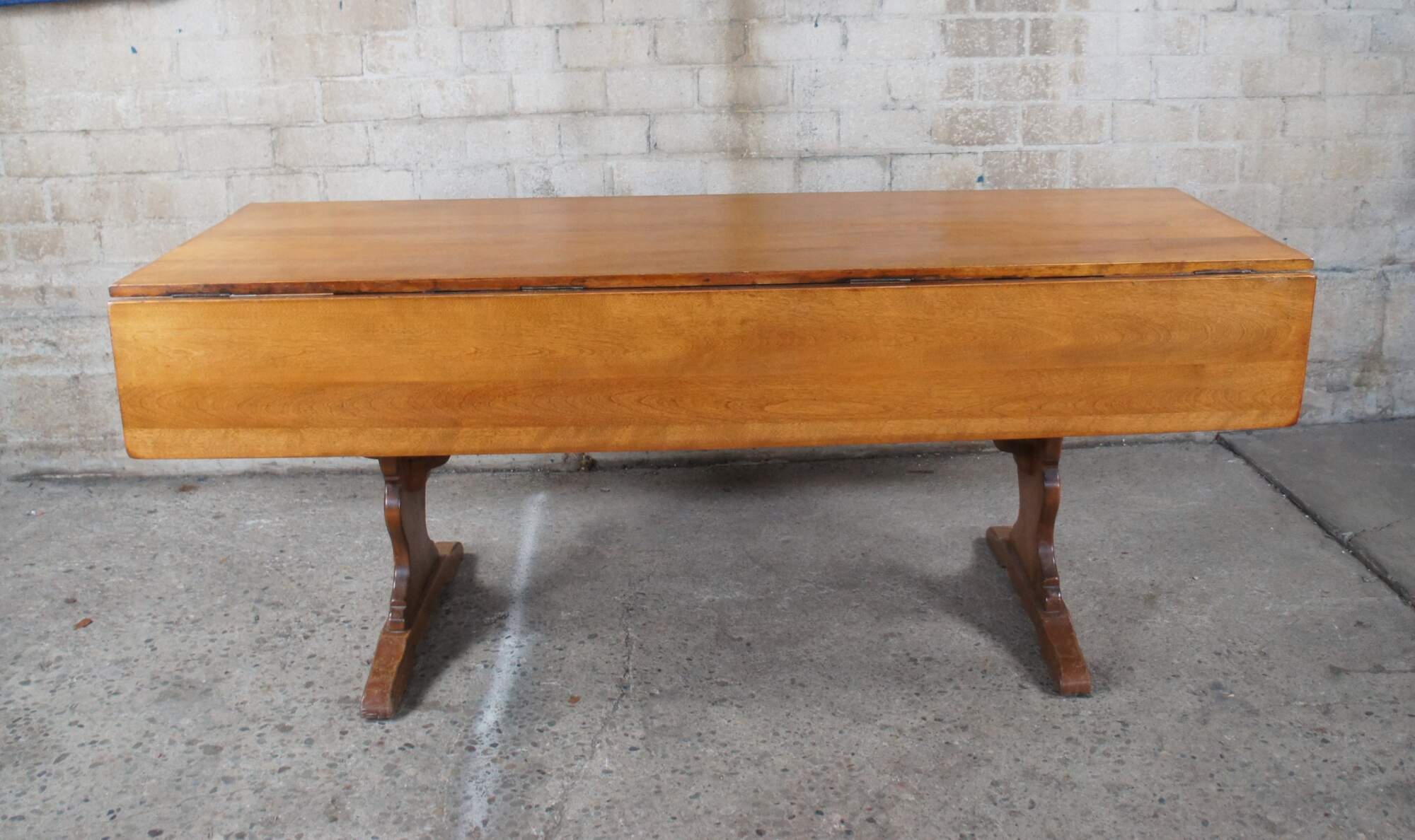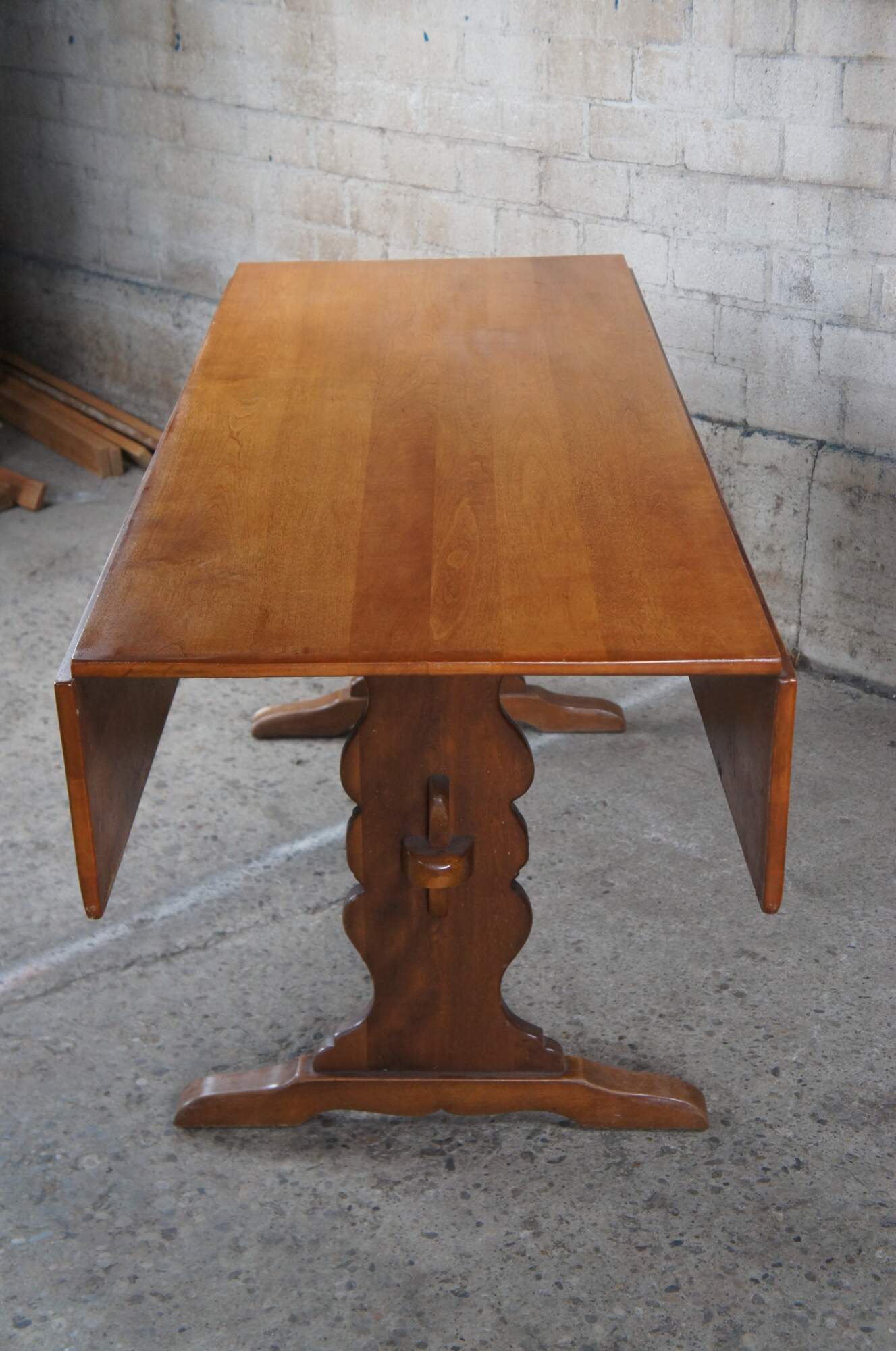 Vintage Cushman Colonial Creation drop leaf country farmhouse dining table. Made of rock maple featuring rectangular form with two large long drop leaves over a serpentine trestle base. A Genuine Cushman Colonial Creation made in Bennington Vermont.