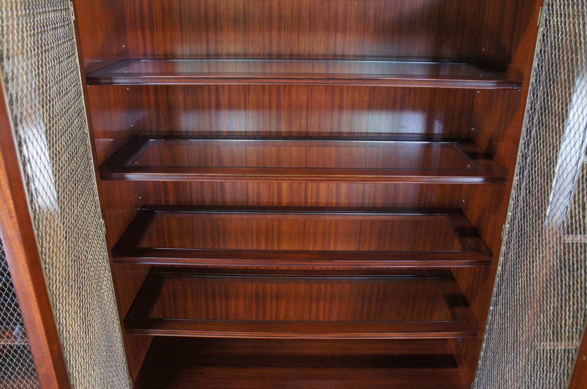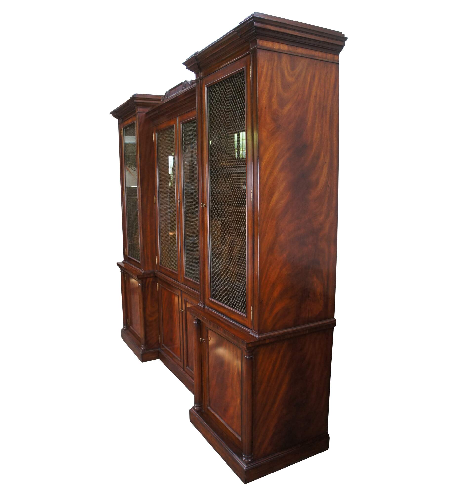 Ralph Laurens Noble Estate Bunching China 1840-22 , circa last quarter 20th century. An exceptional display cabinet drawing inspiration from English Georgian and Chippendale styling. Made from mahogany with two outer cabinets that break forward from the central unit adding depth and dimension. Features an illuminated interior with brass lattice covered doors and wooden shelves with glass inserts. The lower cabints showcase flame mahogany doors flanked by beautifully turned columns. Opens to shelving for additional storage and a silverware drawer. Interior lighting is adjusted to one of three settings by the touch of a button. Lattice brass hinges open for ease of cleaning the glass.