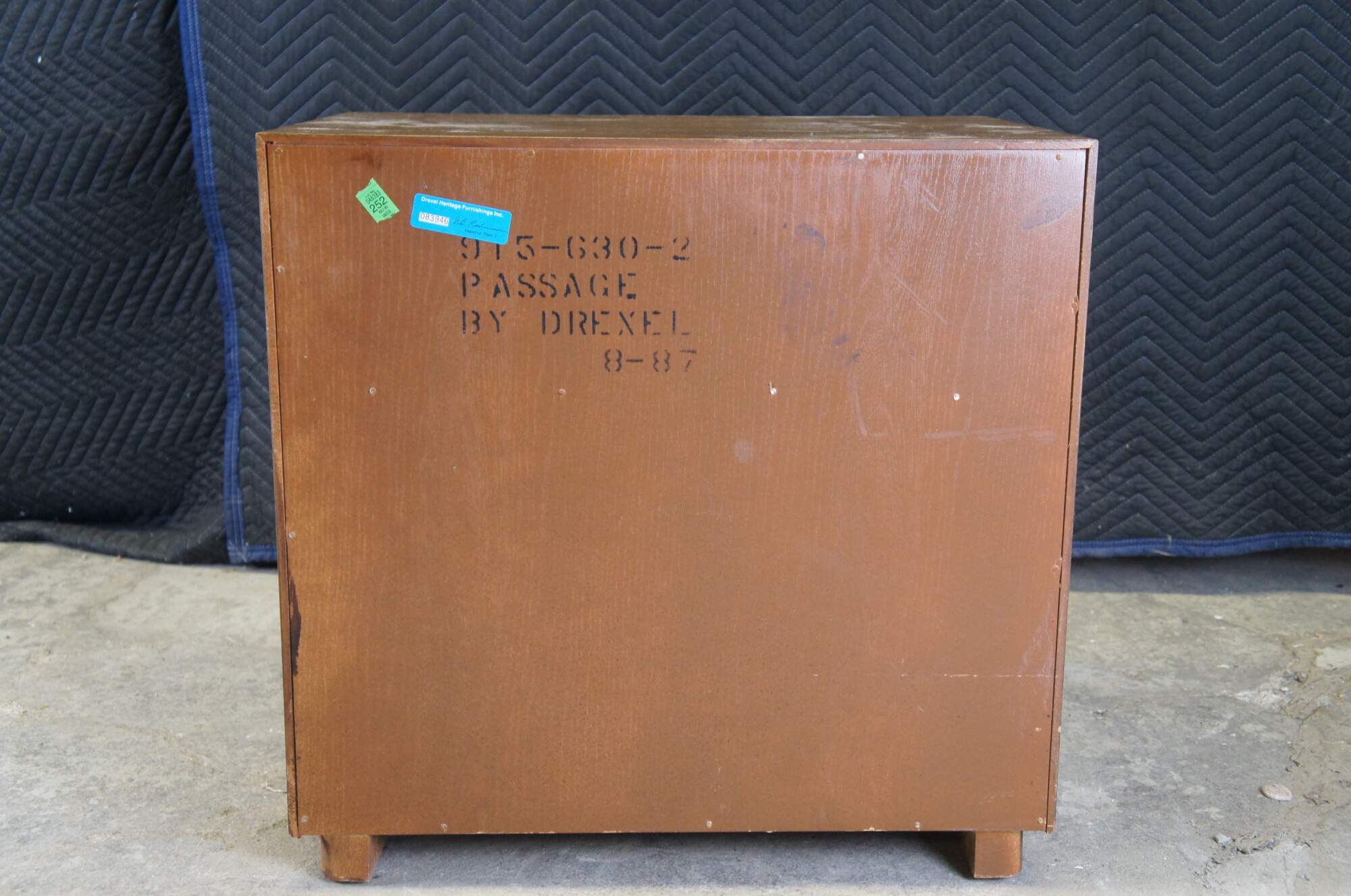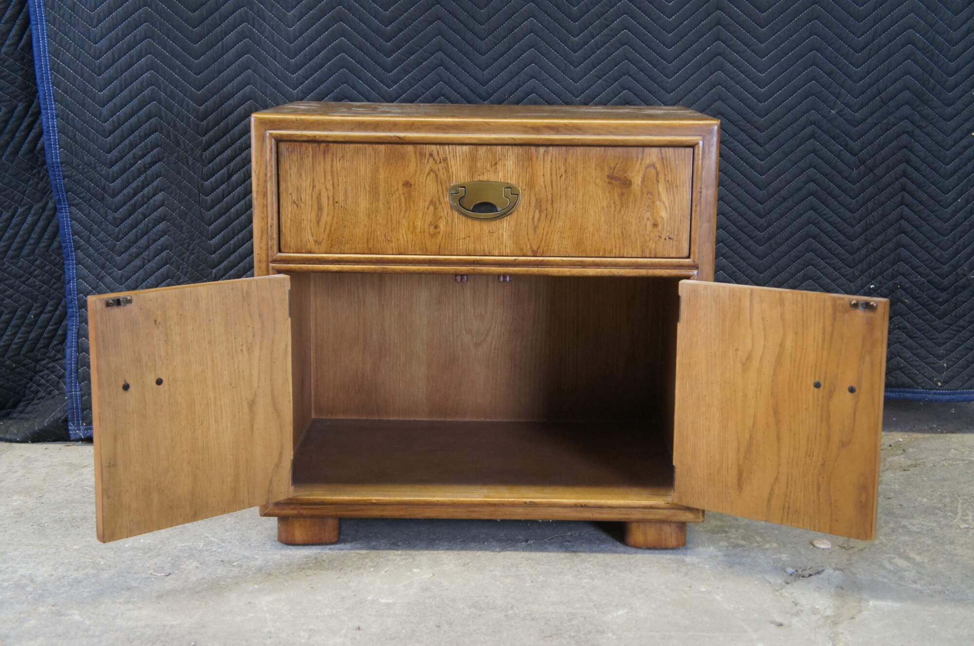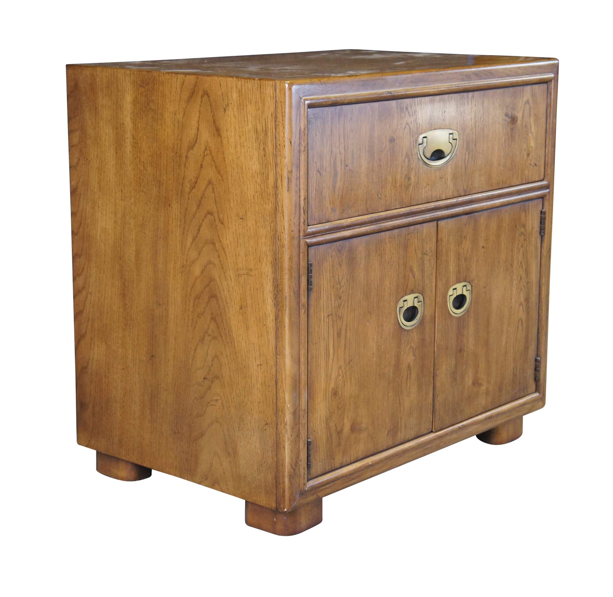 Drexel Heritage Passage Collection nightstand or end table, circa 1987, no 915-630-2. Features a rectangular frame made from oak with a dovetailed drawer over lower cabinet with inset brass drawer pulls. A great addition to any mid century modern space.