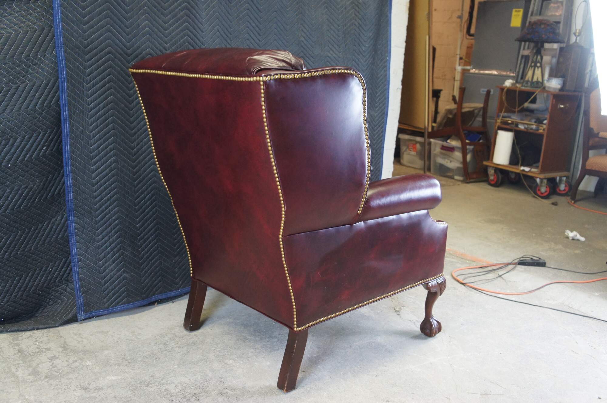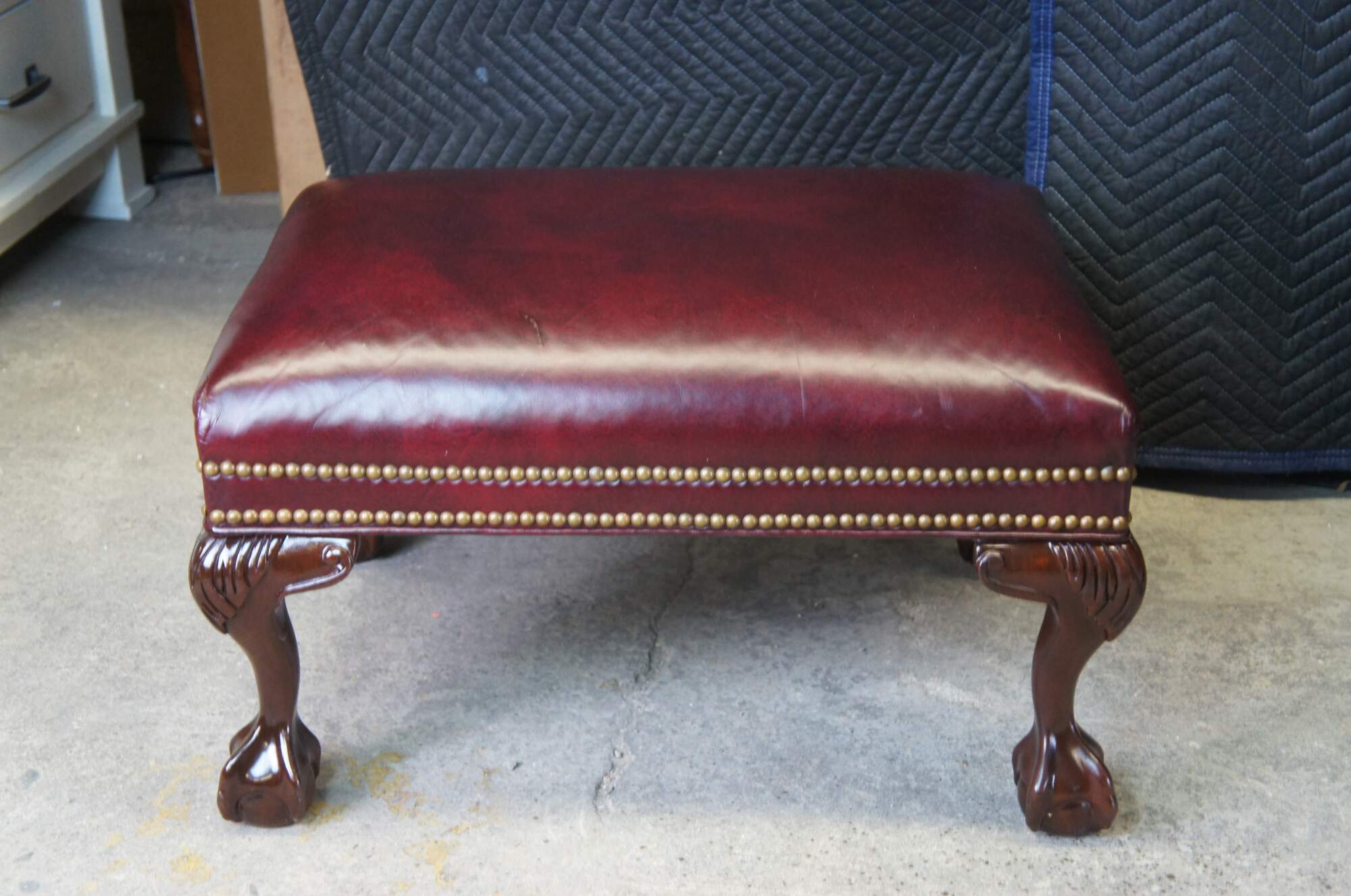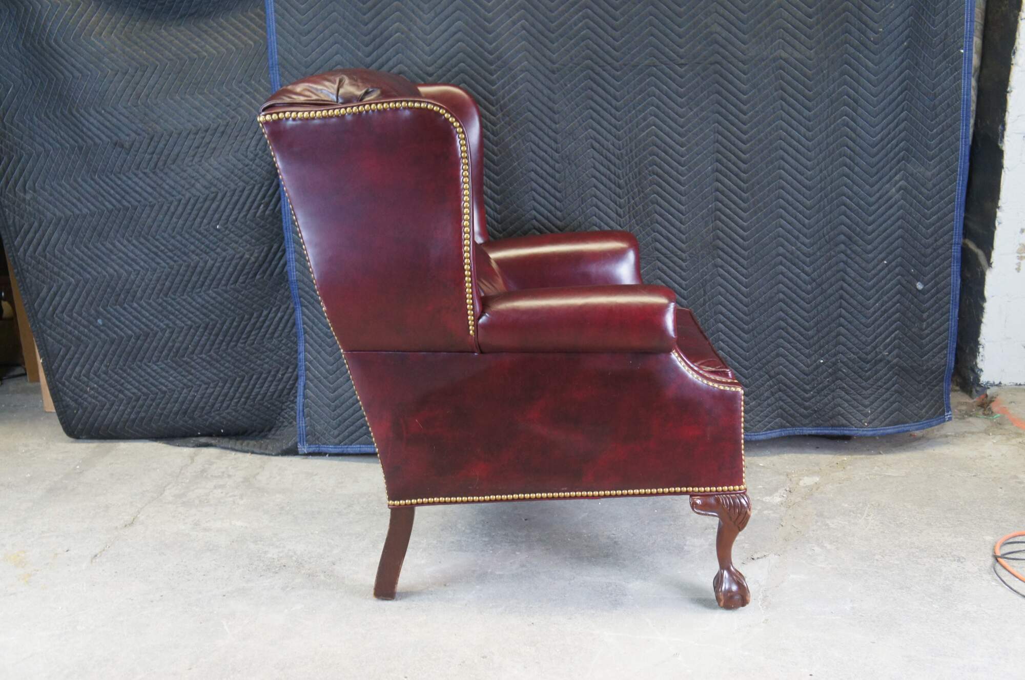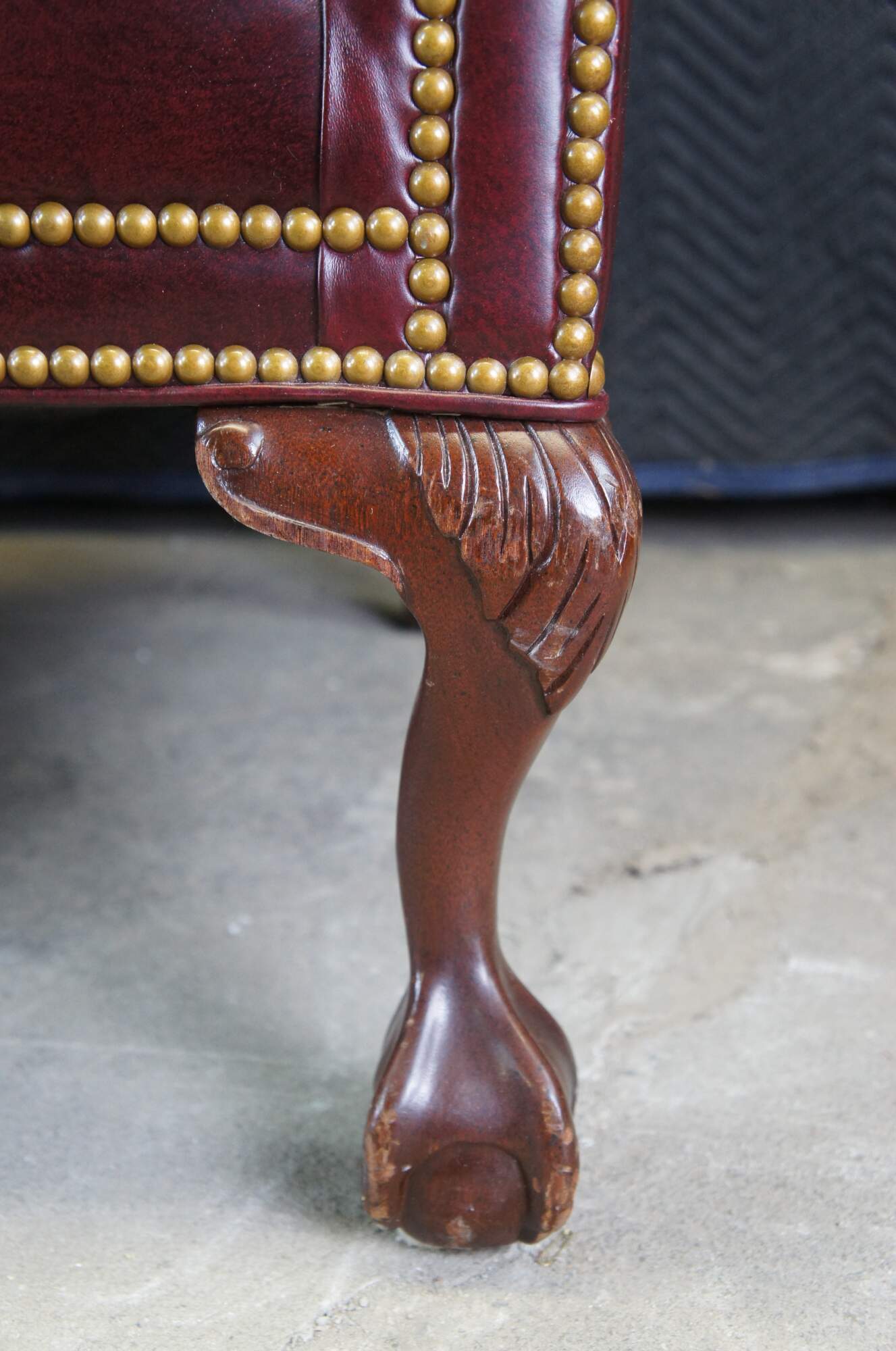An eye catching wingback chair and ottoman by Hancock & Moore, circa last quarter 20th century. Inspired by classic English Georgian styling. Features a hooded back with rolled arms and brass nailhead trim. The chair is supported by carved mahogany ball and claw feet with acanthus accents. A plush comfy seat that will make a great addition to any space. Includes matching ottoman.