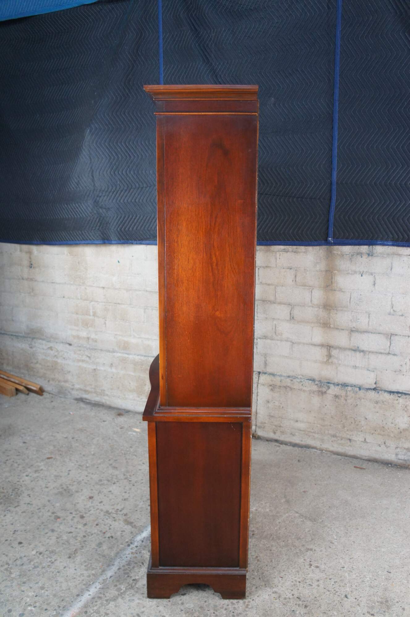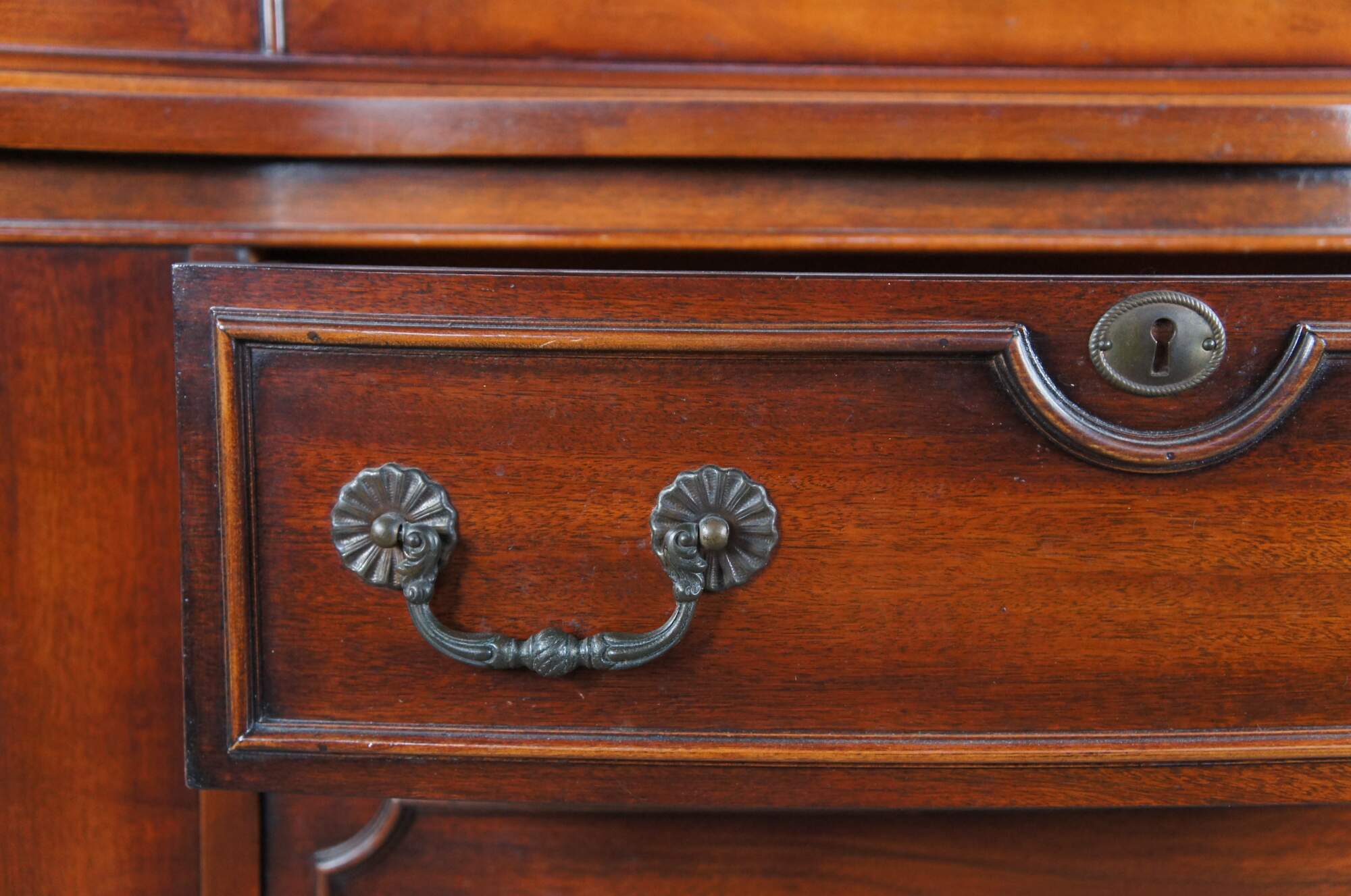 Mid century china cabinet or cupboard. Made of mahogany featuring upper curio cabinet with three plate groove shelves and lower cabinet and drawer over bracket feet.