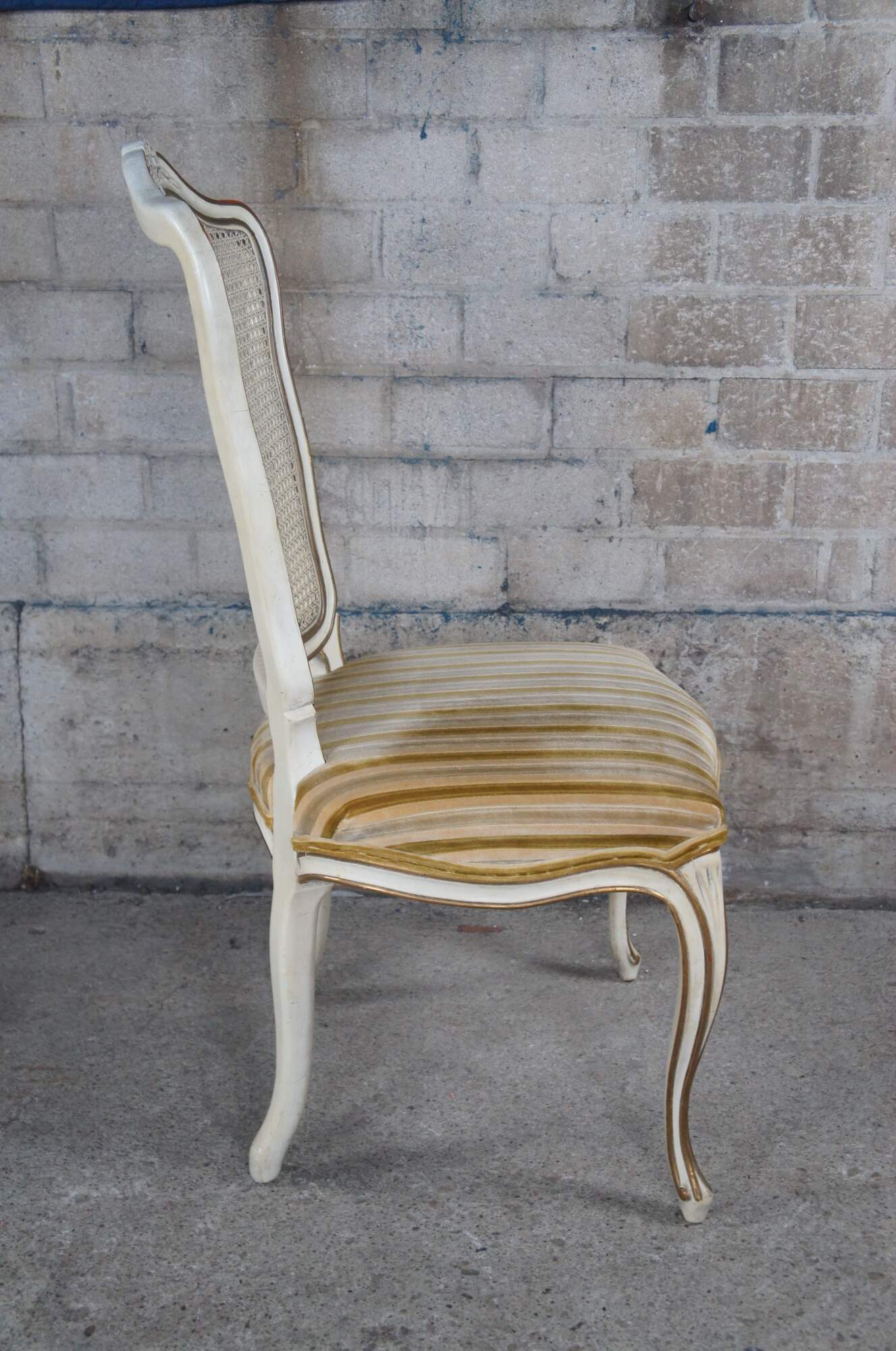 Vintage set of six Kindel Furniture Co. french provincial dining chairs featuring serpentine form with caned back, fauteuil arms, white and gold painted accents and striped velvet fabric. Made by Michigan Chair Co of Grand Rapids, circa 1978.