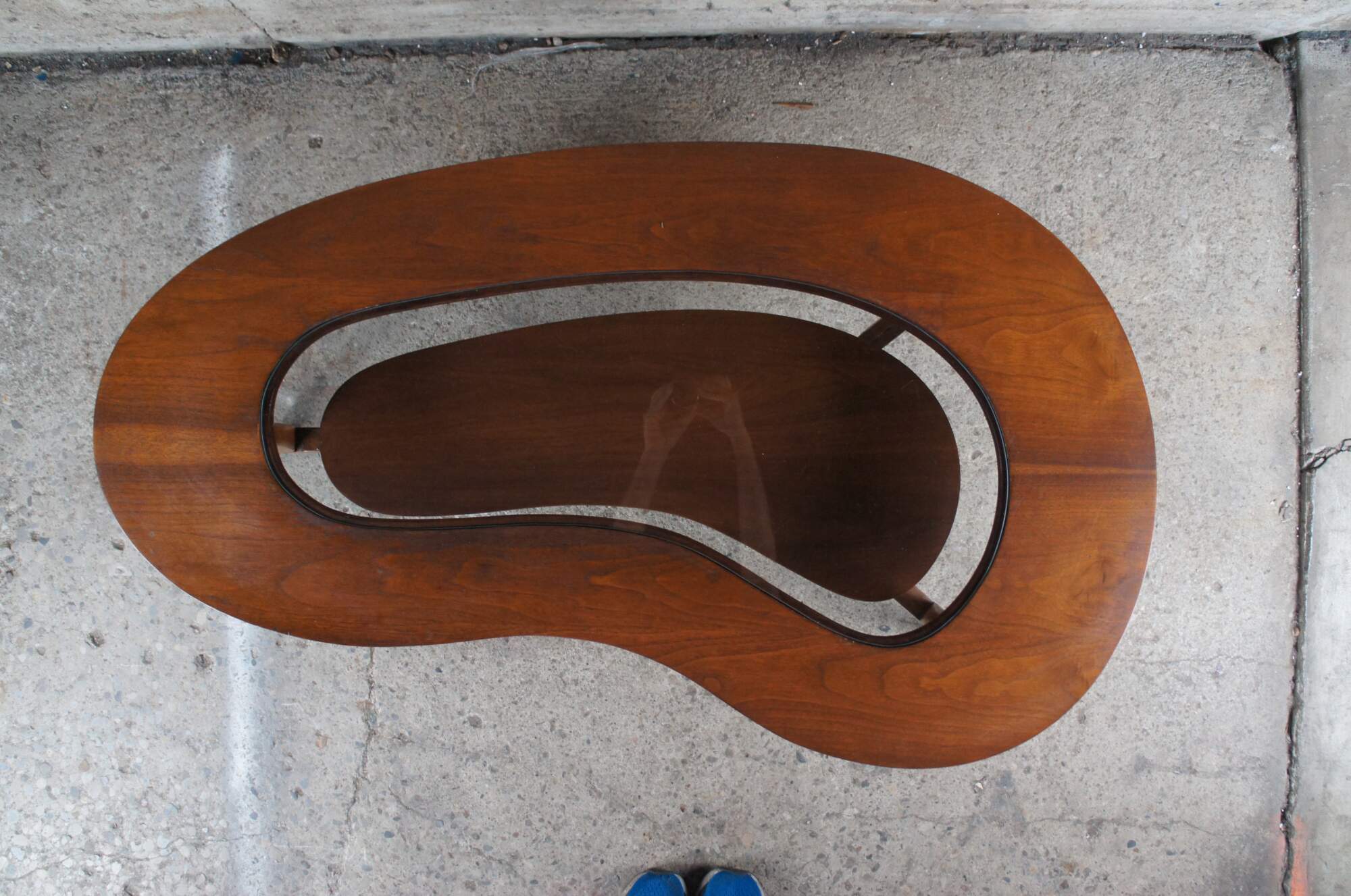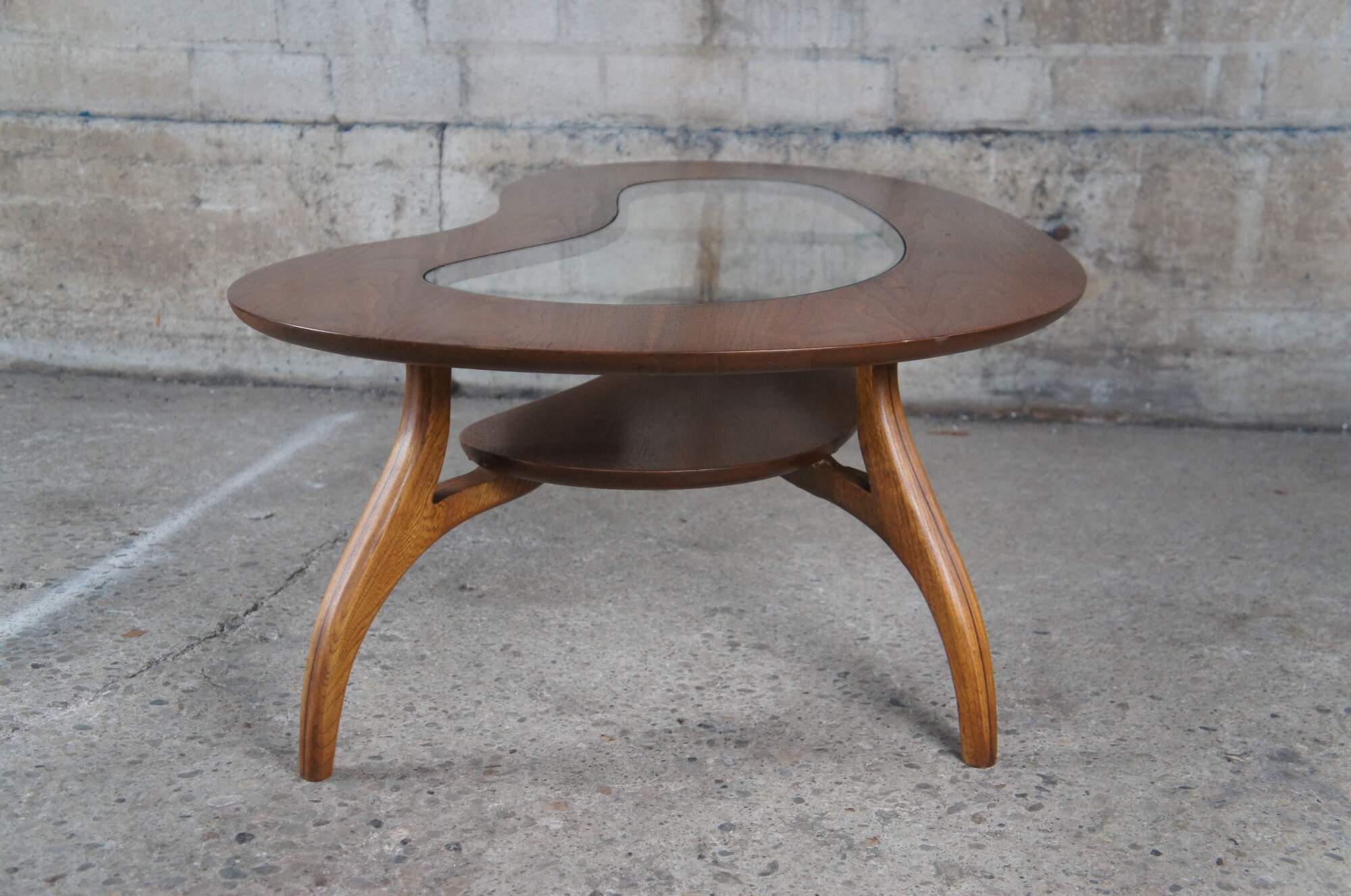 Mid century modern sculptural free form kidney bean shaped coffee table. Made of walnut featuring tiered design with glass top and three legs.