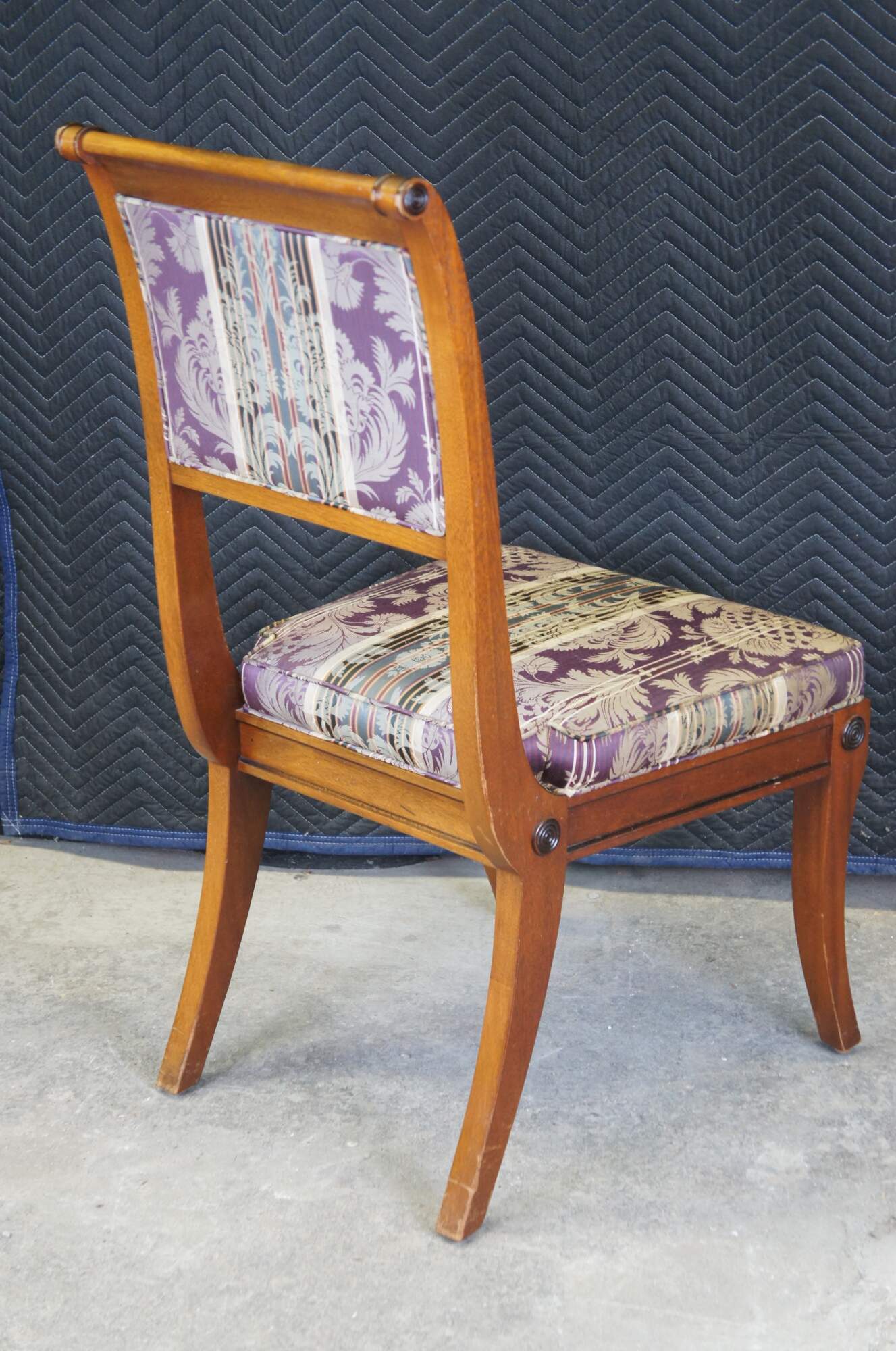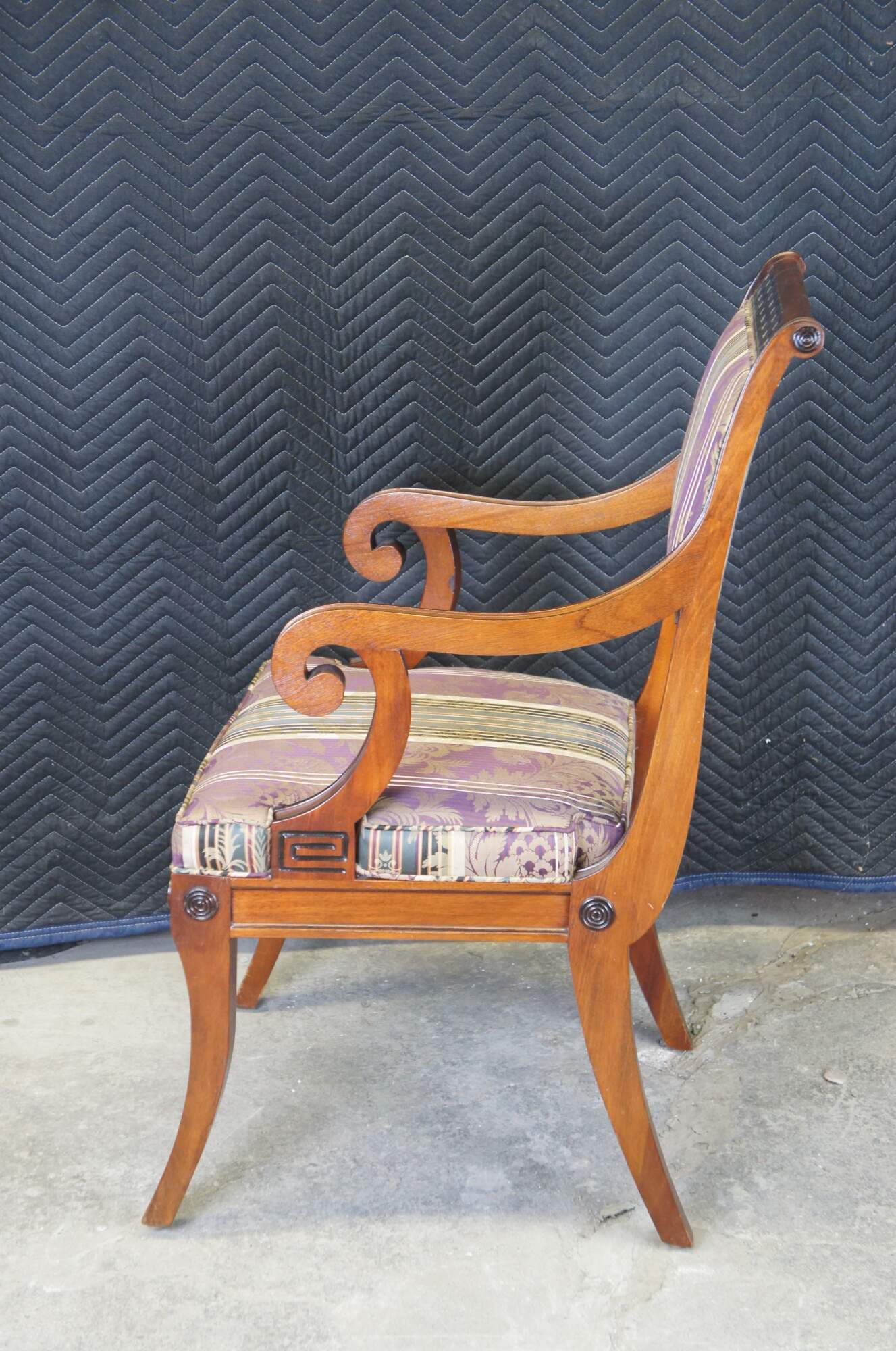 Beautiful set of 6 dining chairs by Baker Furniture, circa last quarter 20th century. Inspired by English Regency and Klismos styling. Features a mahogany frame with carved ebonized Greek key accents and rounded medallion embellishments. The chairs are supported by flared saber legs. Includes striped floral upholstered padded seat and back. Five Side chairs and one scrolled Arm. Marked via metal tag along underside.