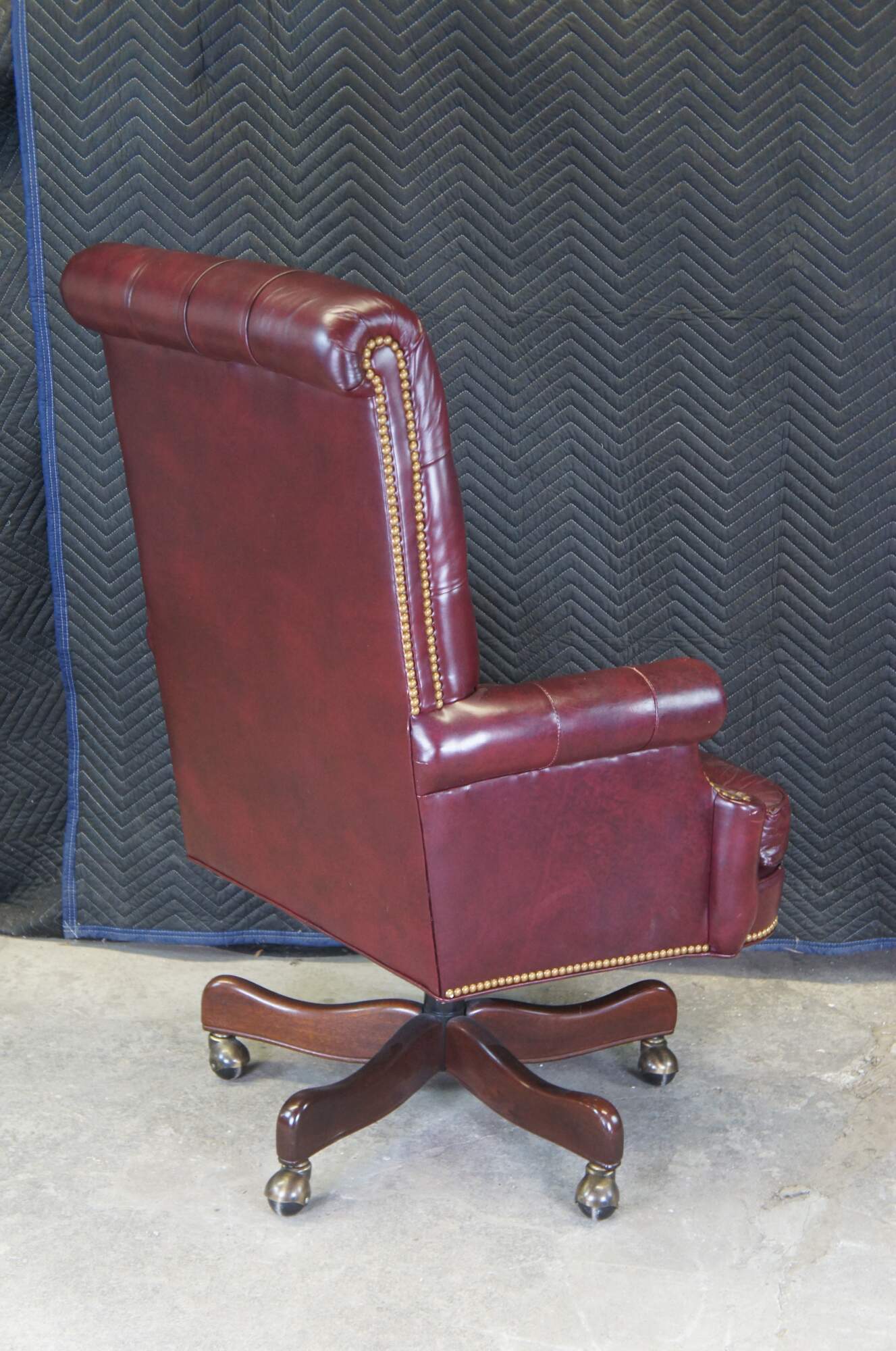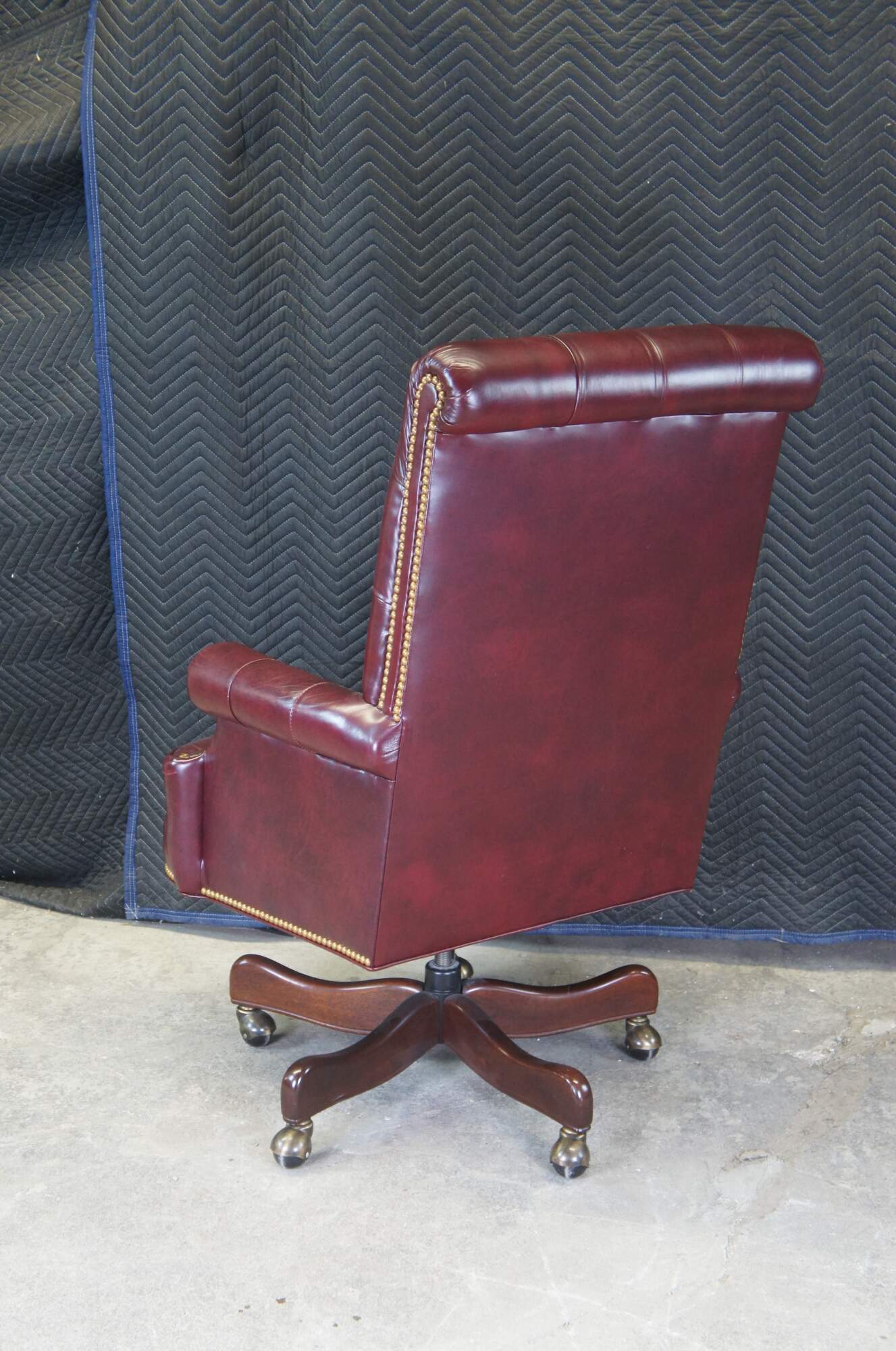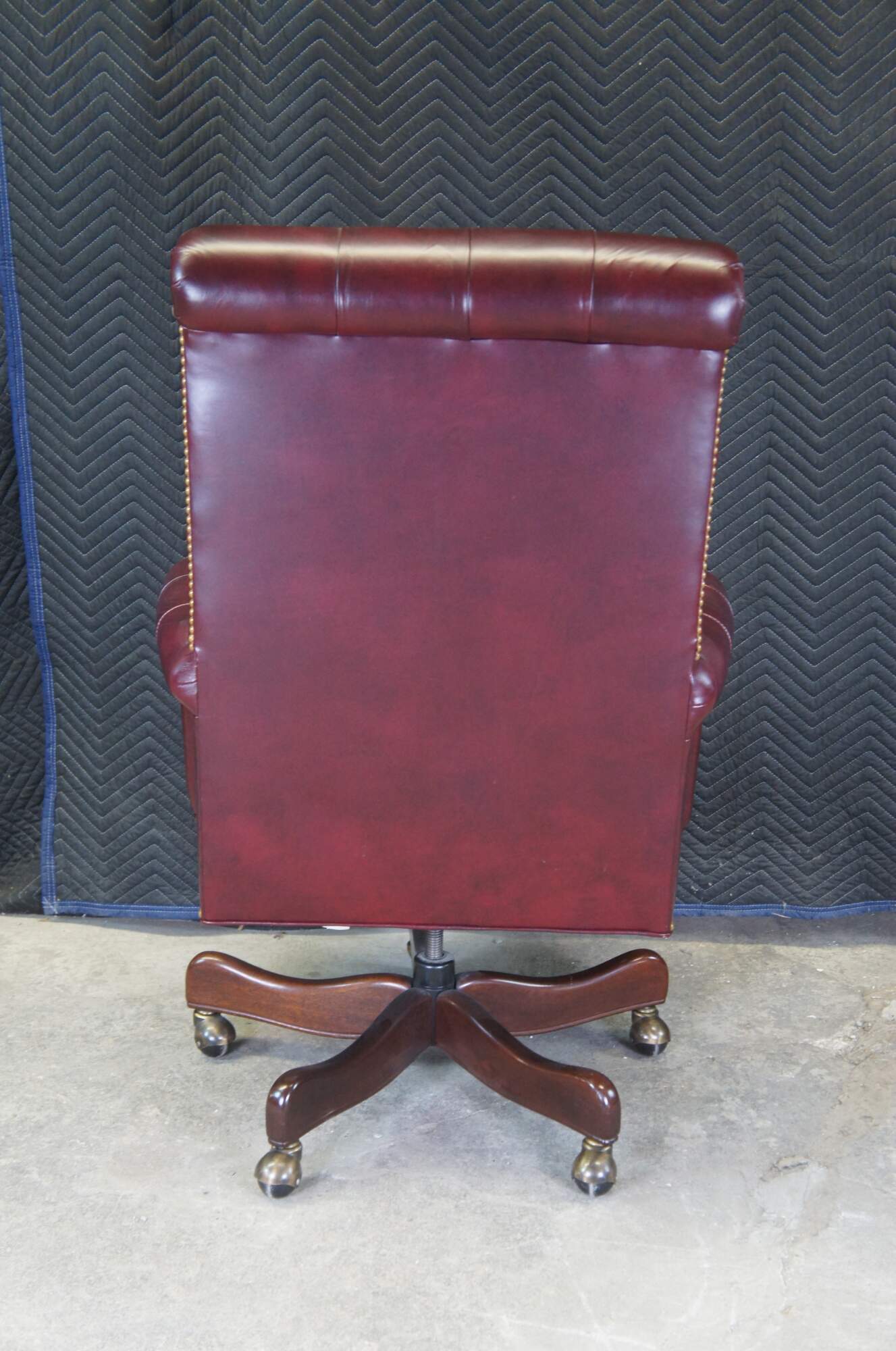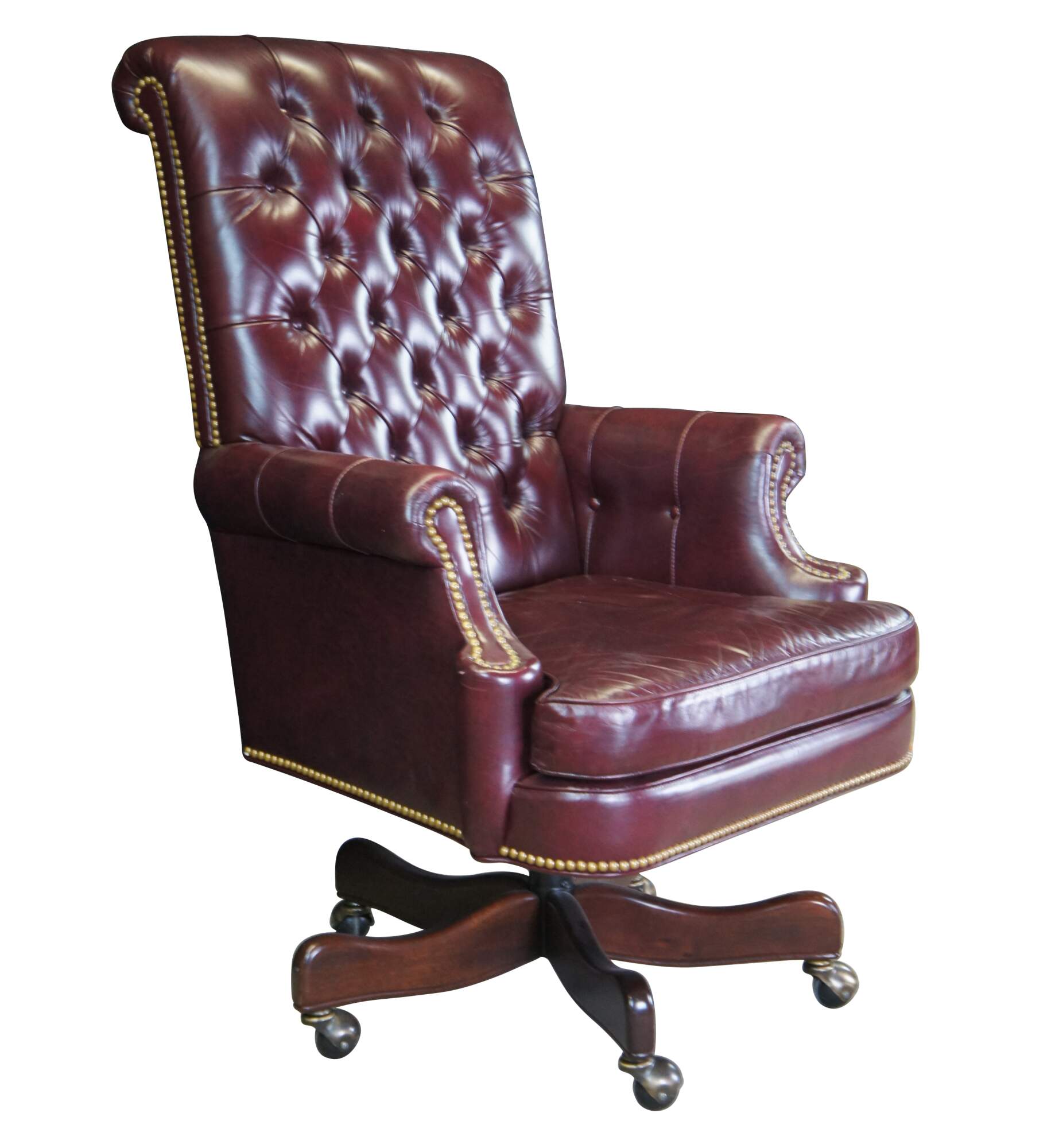An exceptional leather executive office desk chair by Hancock & Moore. Features a red leather tufted frame with scrolled arms and back. Includes brass nailhead trim and removable cushion. The chair supported by a 5 leg mahogany finished base with brass covered casters. The Chair tilts, swivels and is adjustable.