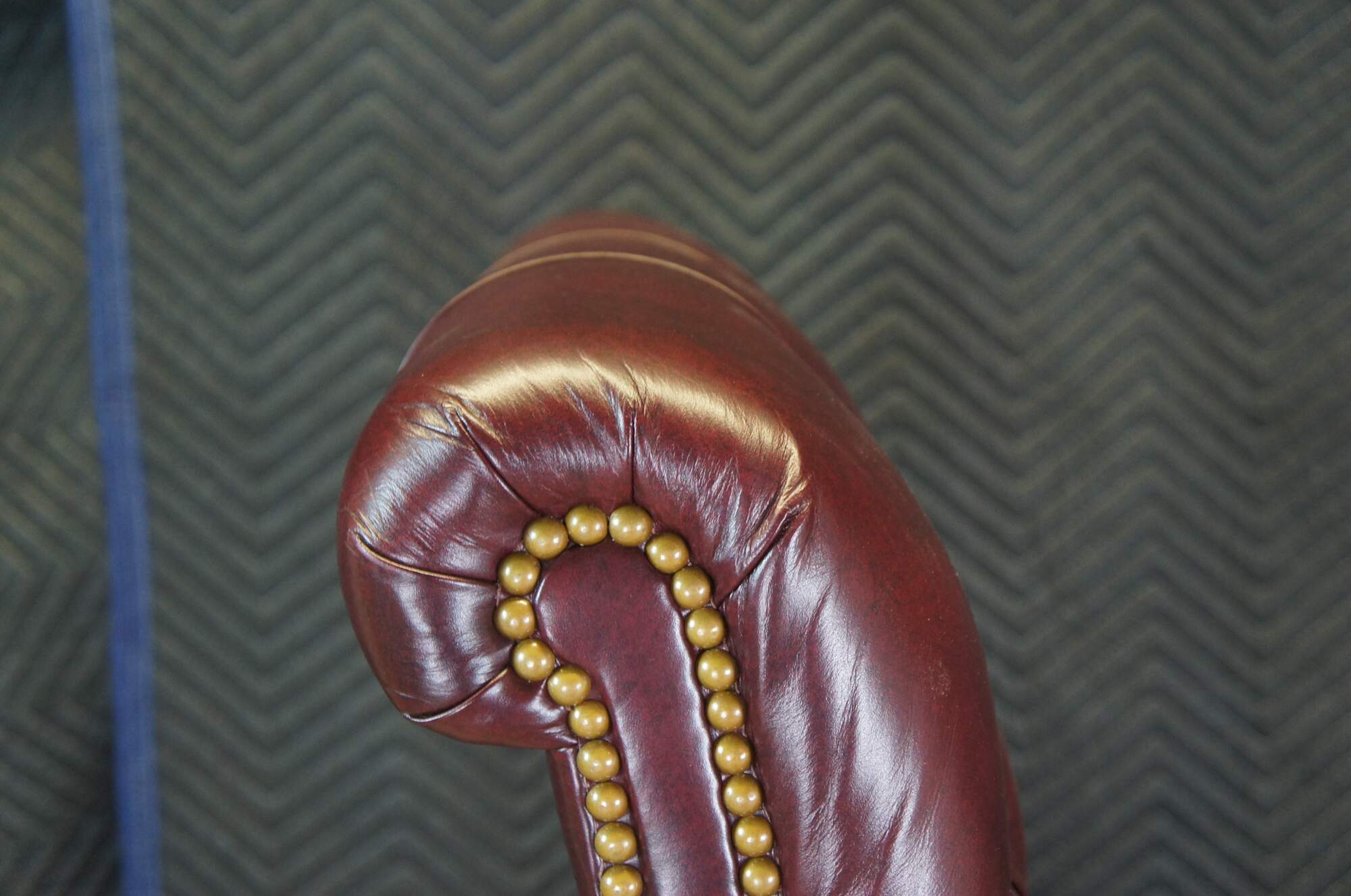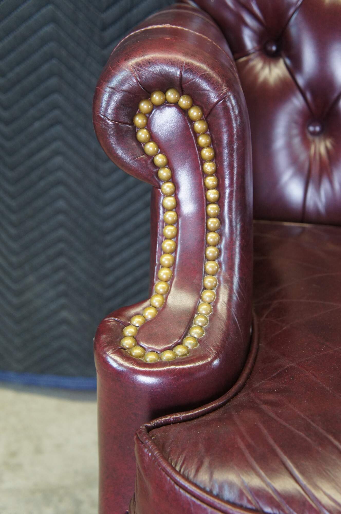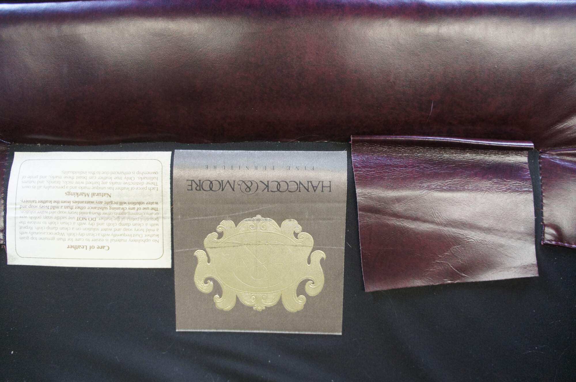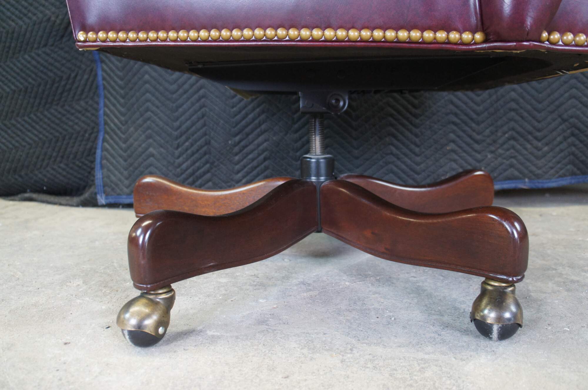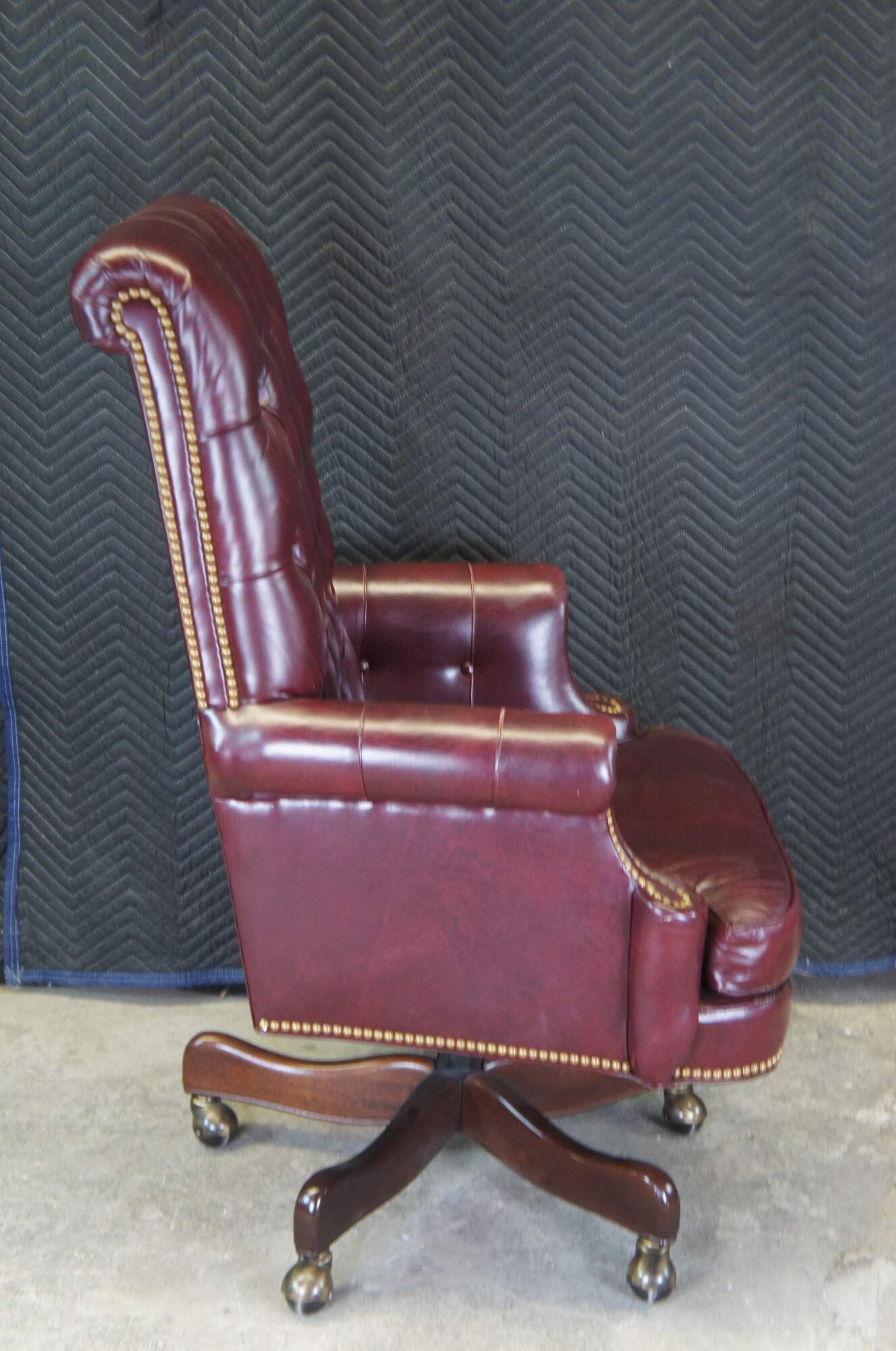 An exceptional leather executive office desk chair by Hancock & Moore. Features a red leather tufted frame with scrolled arms and back. Includes brass nailhead trim and removable cushion. The chair supported by a 5 leg mahogany finished base with brass covered casters. The Chair tilts, swivels and is adjustable.