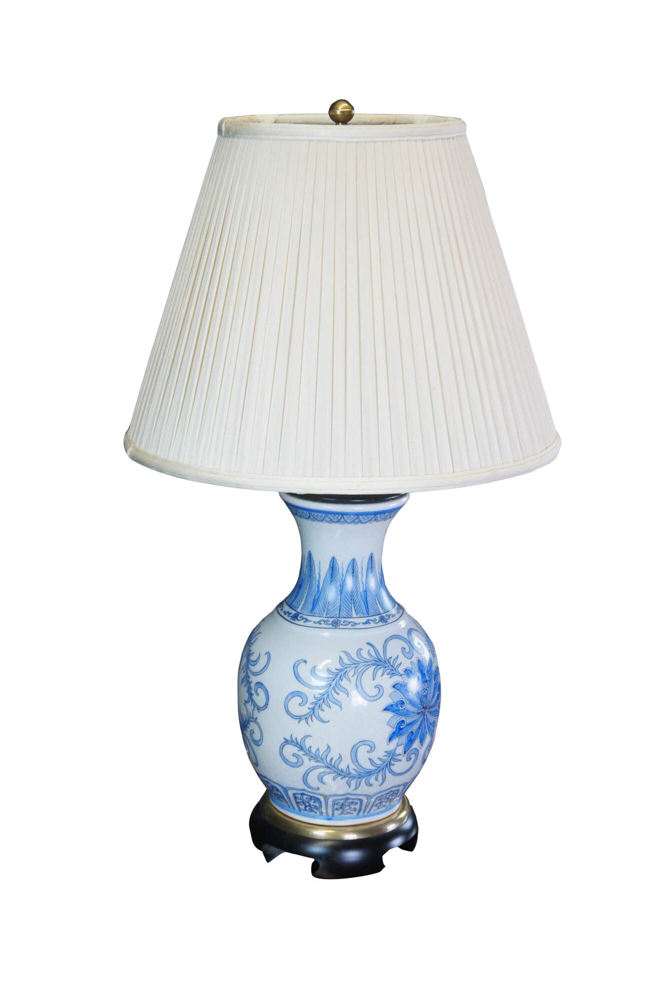 Vintage Frederick Cooper blue and white porcelain table lamp featuring a floral chinoiserie designed vase / urn / jar