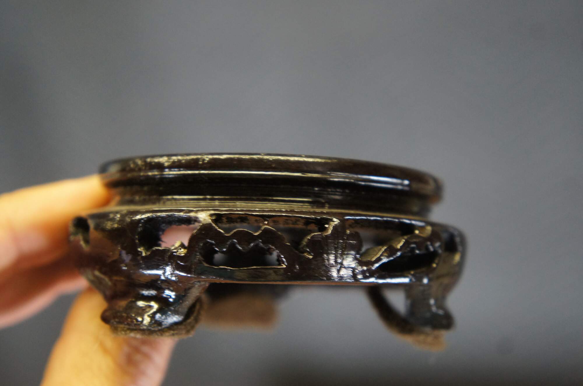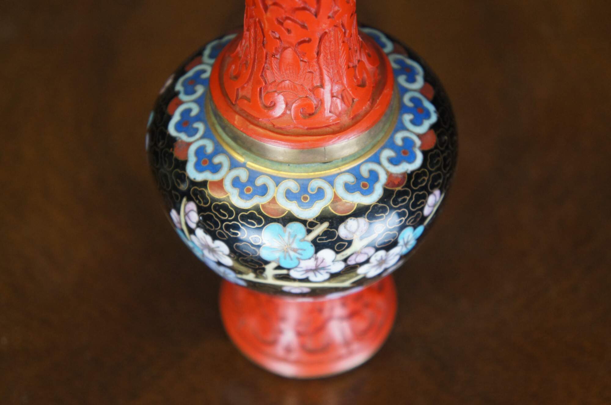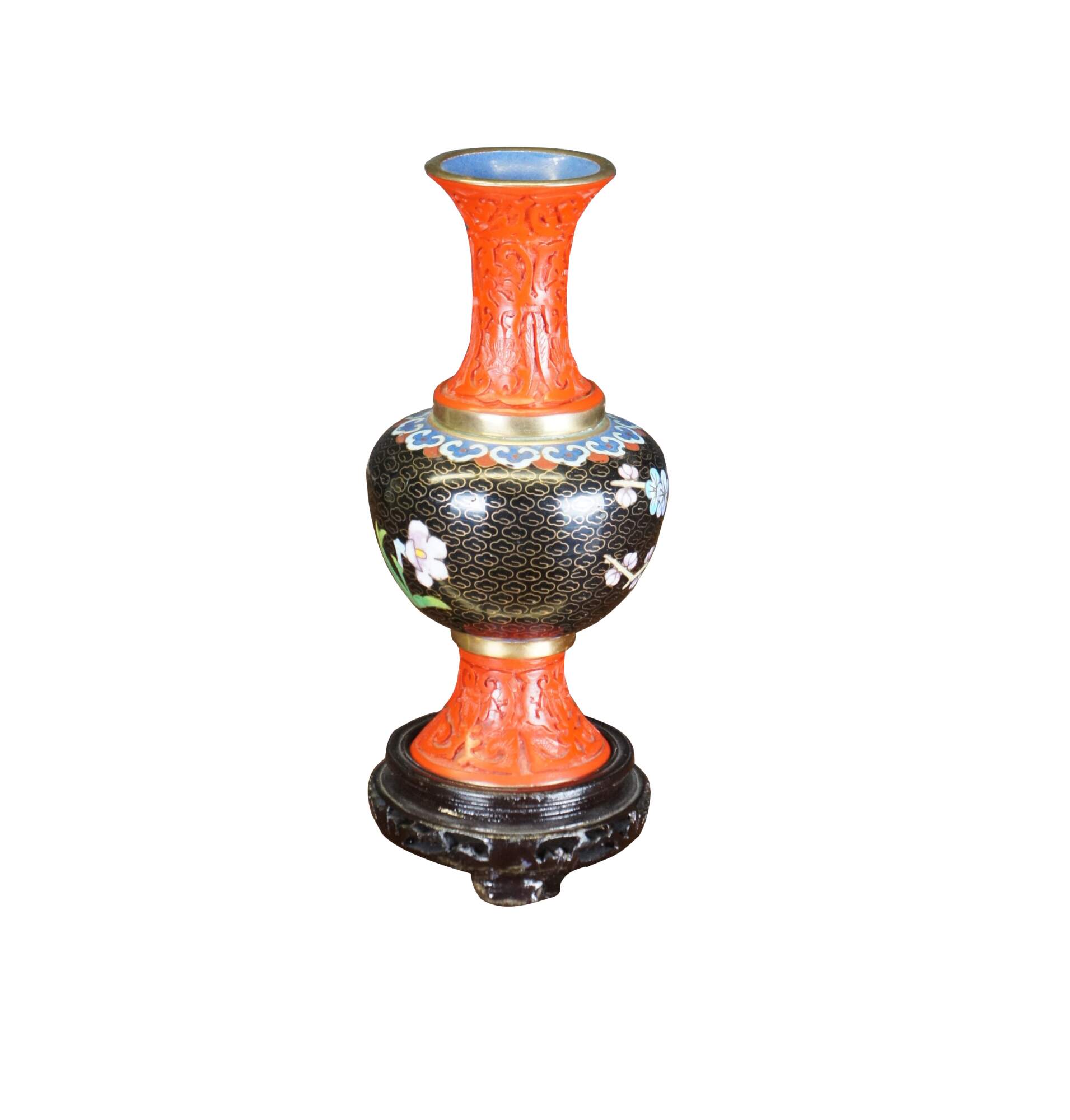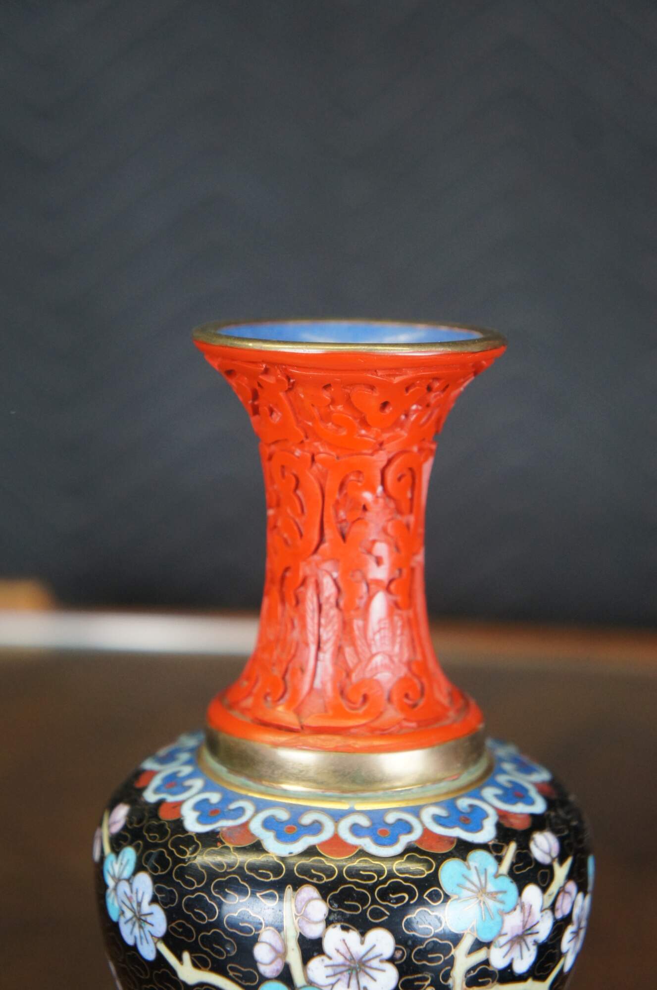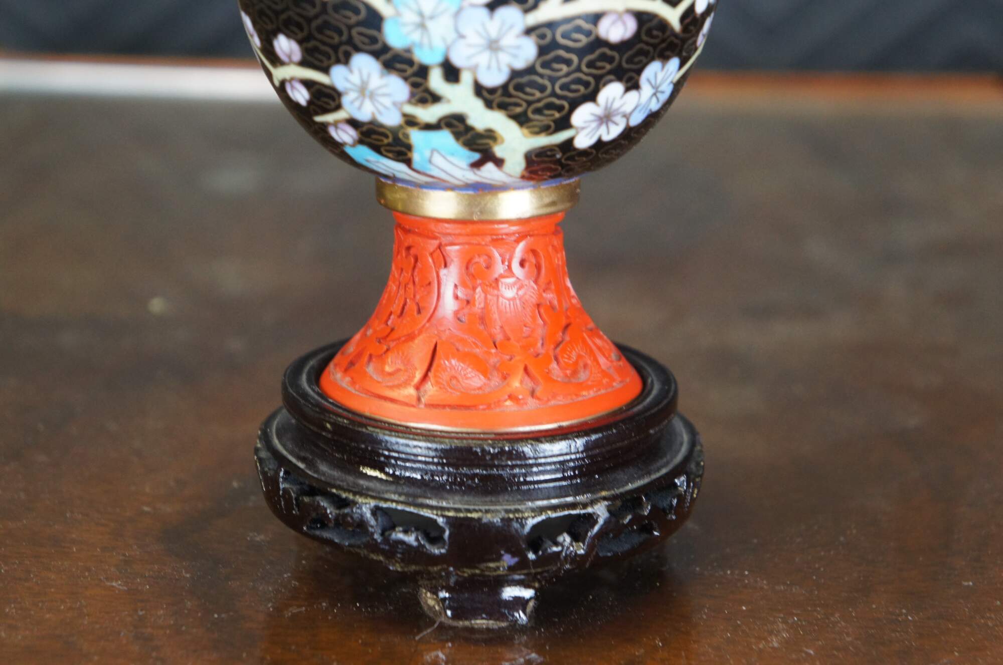 Antique Chinese Chinoiserie vase featuring carved Cinnabar with brass accents and enameled Cherry Blossoms on a field of black clouds. Includes footed base stand.
