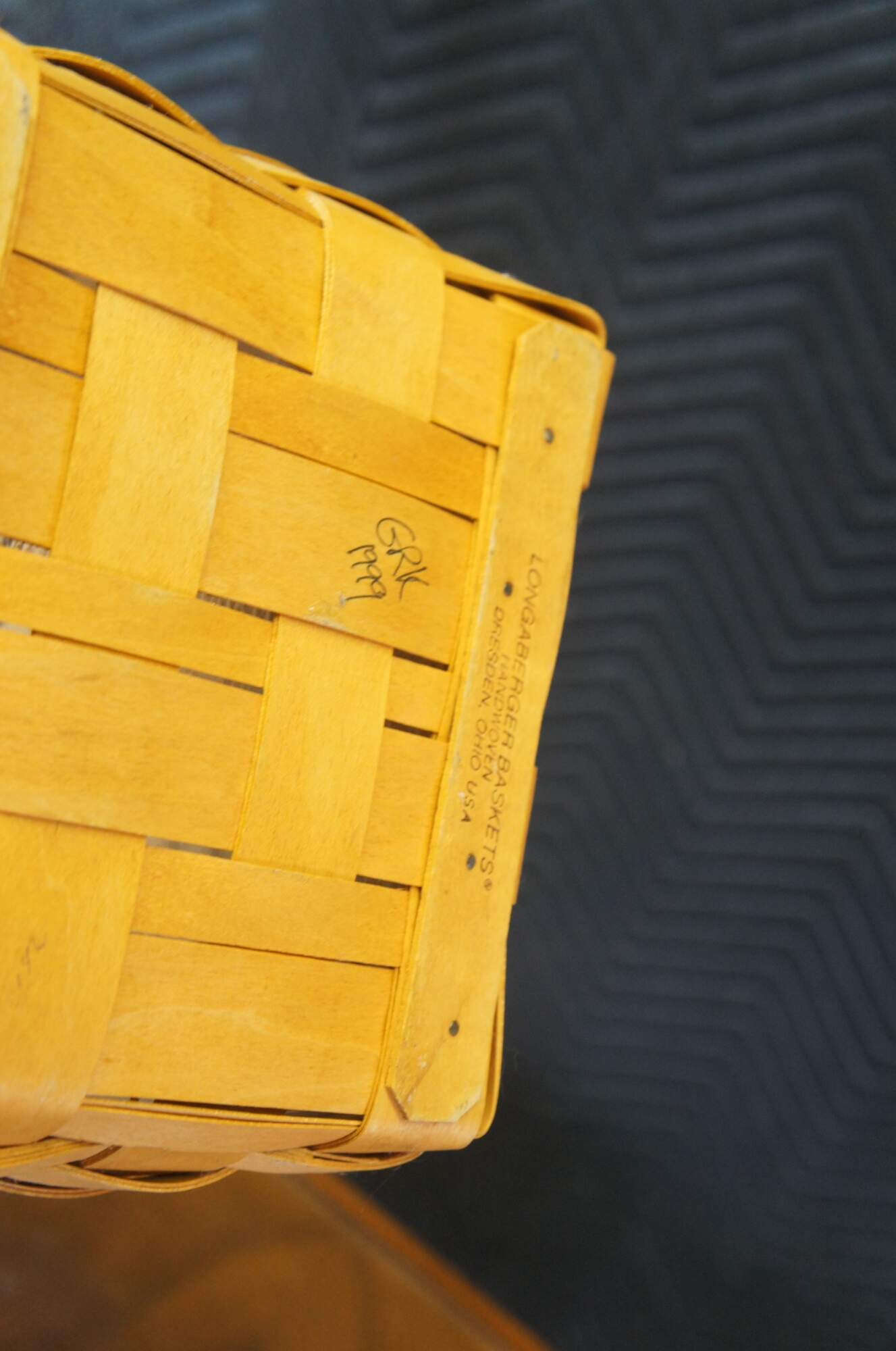 Longaberger woven trash can, circa 1999. Features a plastic insert and lid.