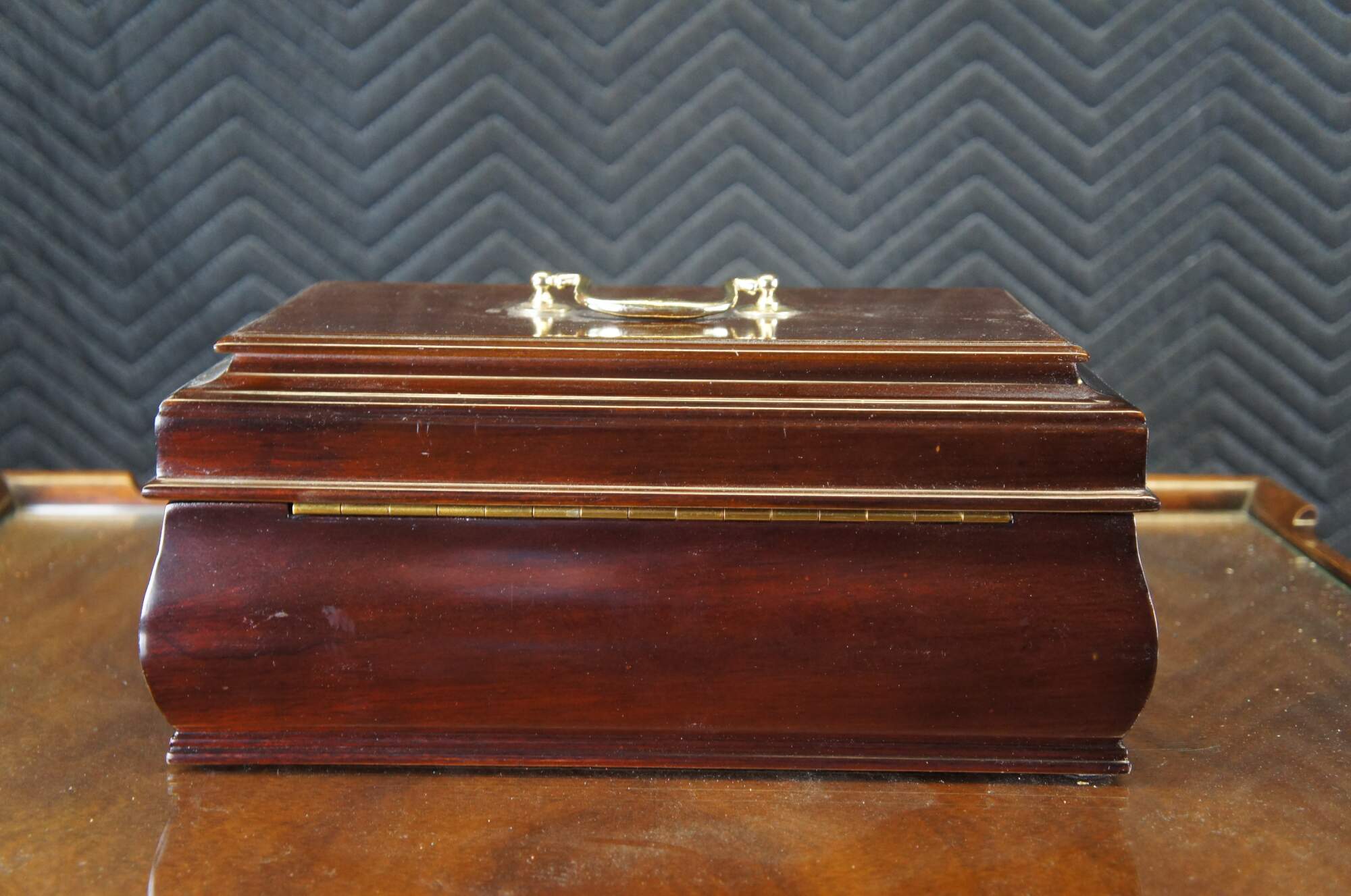 Late 20th century bombe form jewelry box. Features a felt liner with compartments for rings and accessories. includes brass bale handle along the top and ornate escutcheon plate along the front. No Key