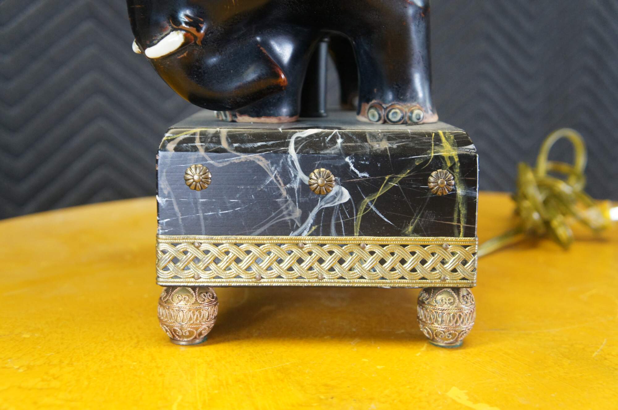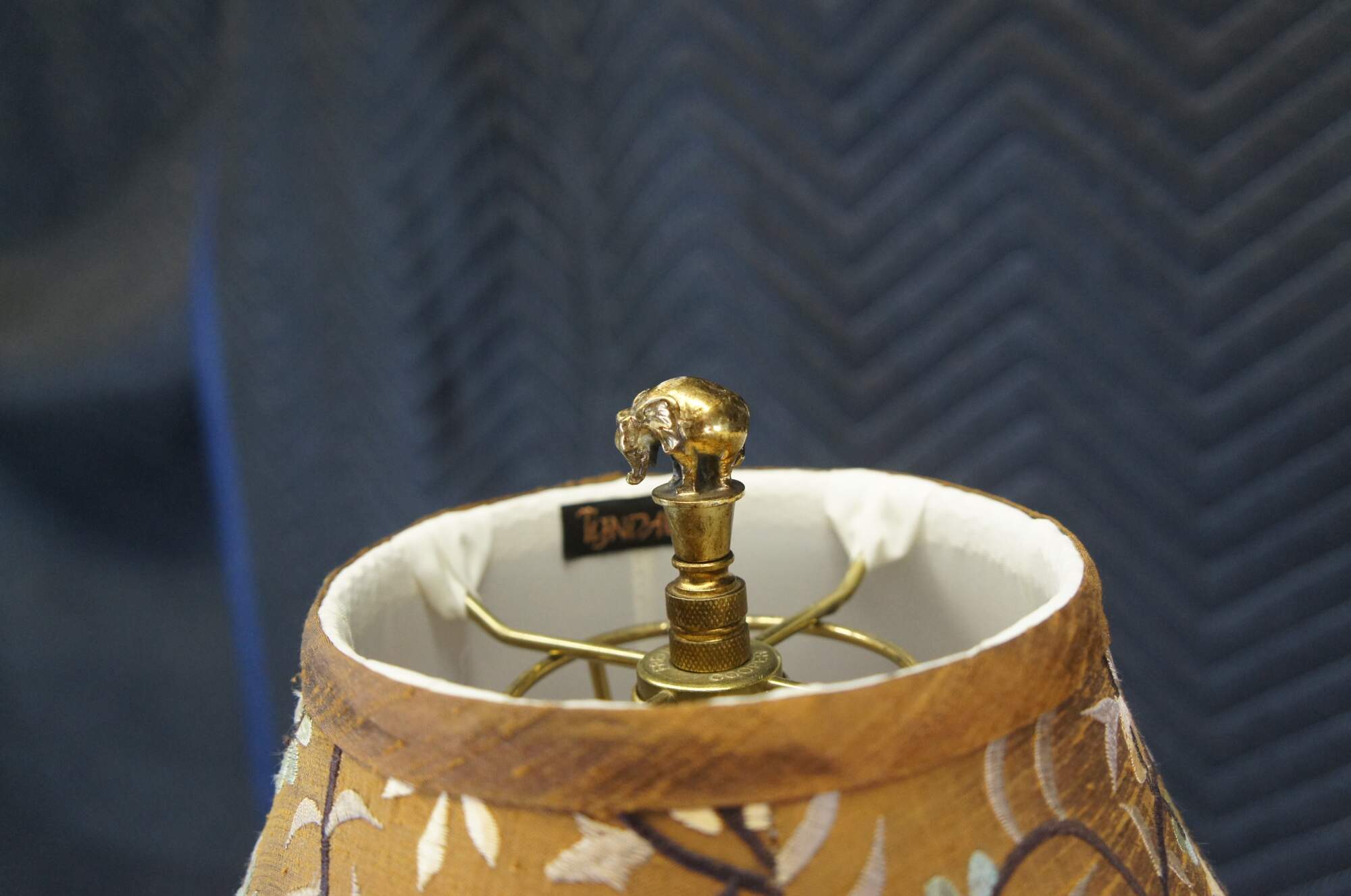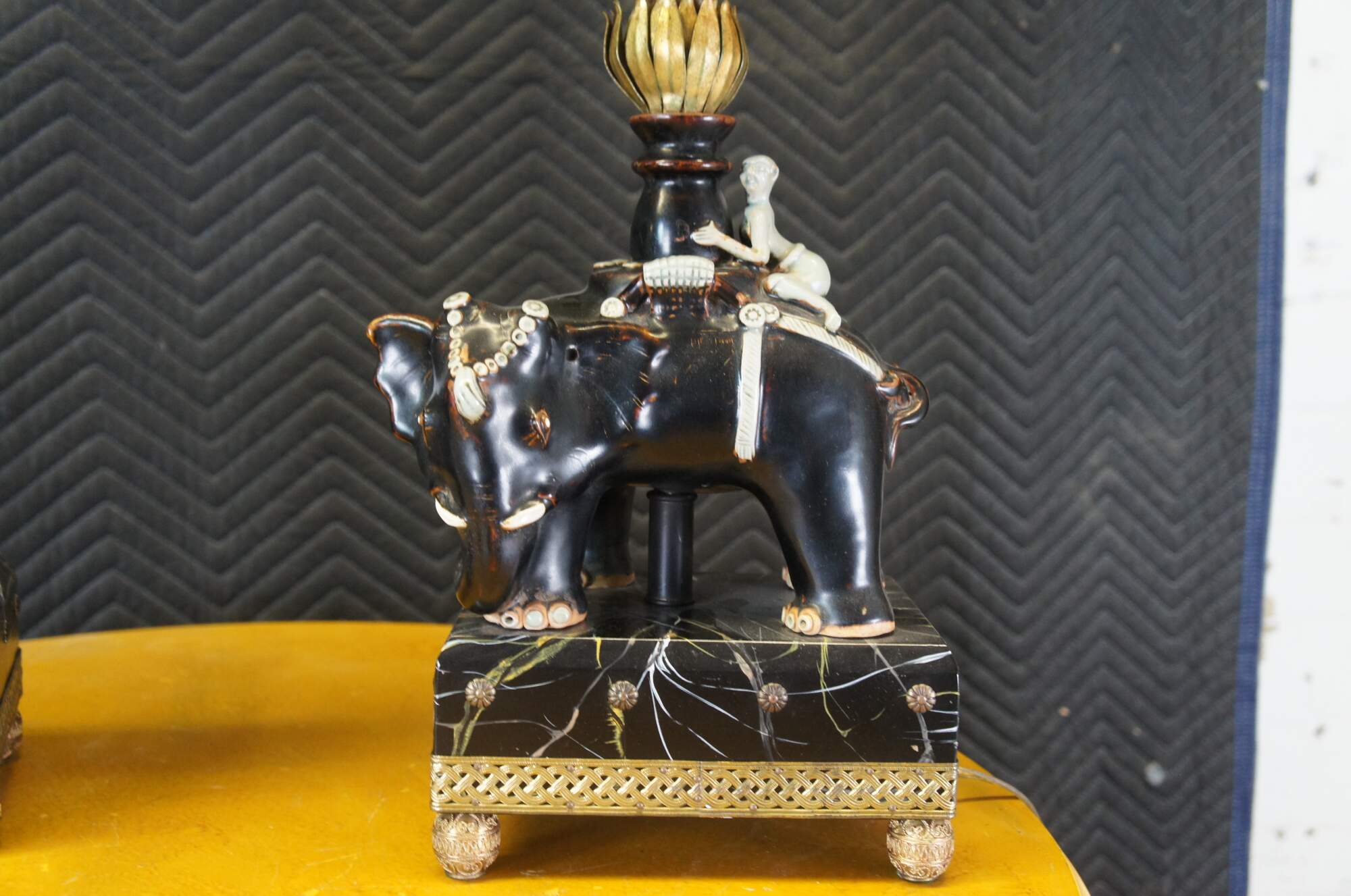2 Raymond Waites For Tyndale (a division of Frederick Cooper) Oriental Table Lamps. Features a true pair, (facing or apposing) Asian glazed elephants saddled with riders over a faux marbled beveled and filigree brass footed base. Column is in the form of a bamboo shoot leading to metal branched palm leaves. Includes a single socket and silk floral shades.