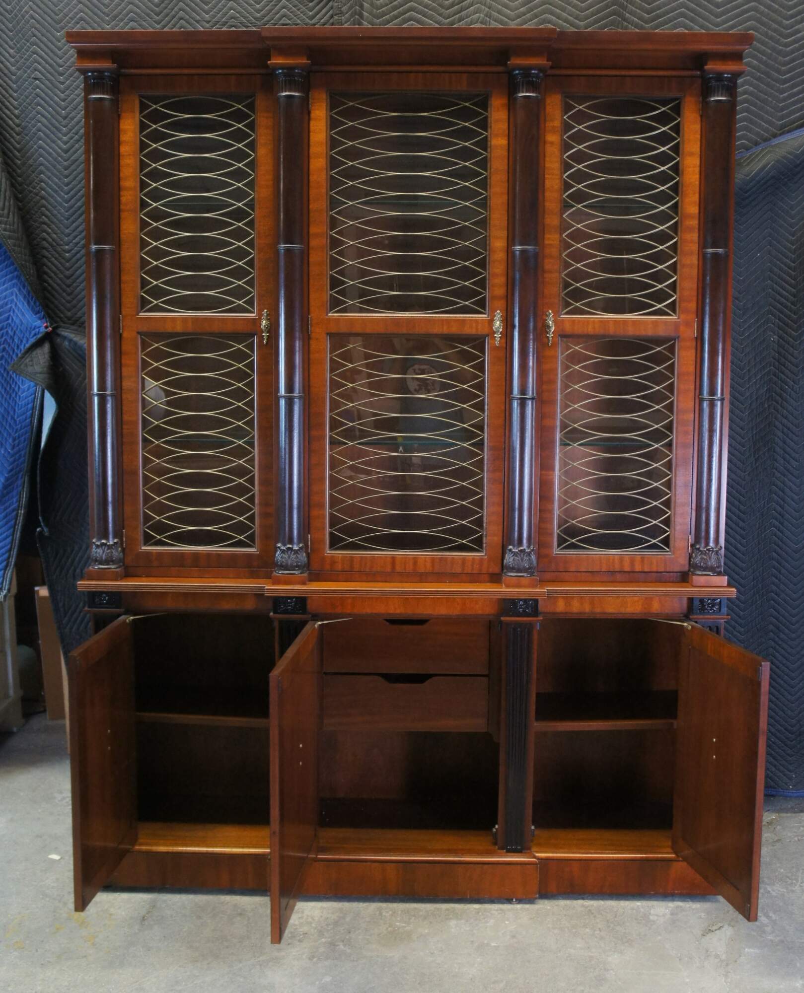 Exceptional Baker Furniture Company China Cabinet, circa early 2000s. Inspired by English Regency, Neoclassical and French Empire styling. A rectangular form with breakfront design made from mahogany with flame (crotch) mahogany lower door fronts. The hutch has three glass doors with beautiful geometric brass lattice covering centered between crossbanded mahogany and quarter cut bamboo form columns with fluted capitals and acanthus bases. Opens to an illuminated interior with three polished glass shelves and plate grooves. Base features ebonized French carved medallions over tapered and fluted columns. Opens via brass lione head knockers to ample storage with two center drawers and accessory storage. An eye catcher for any dining room or library. Baker tag along back as well as metal plate to the left side of center drawer.