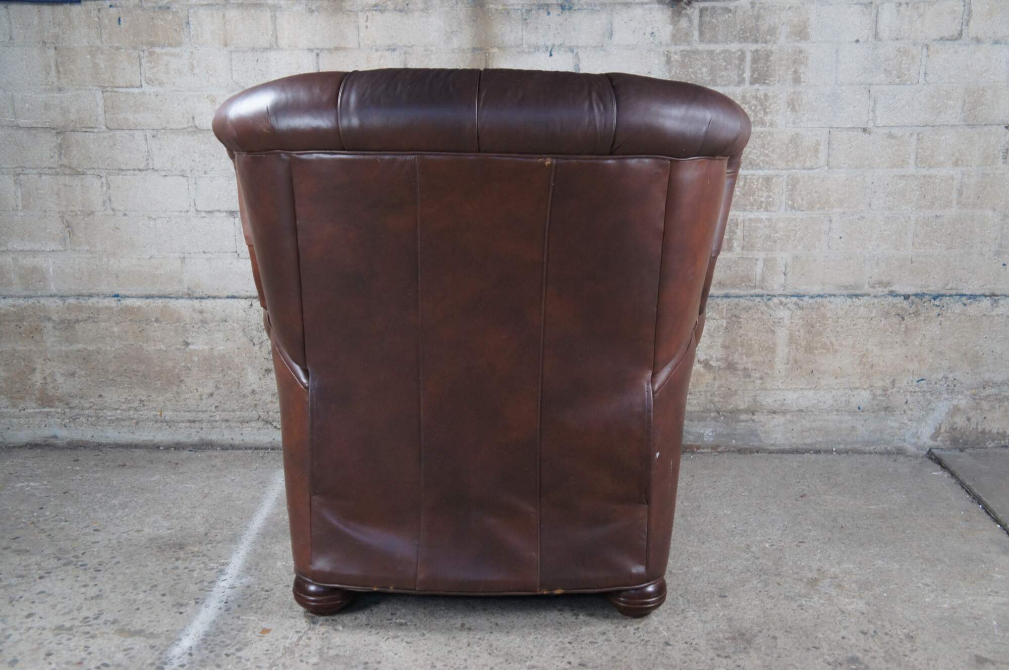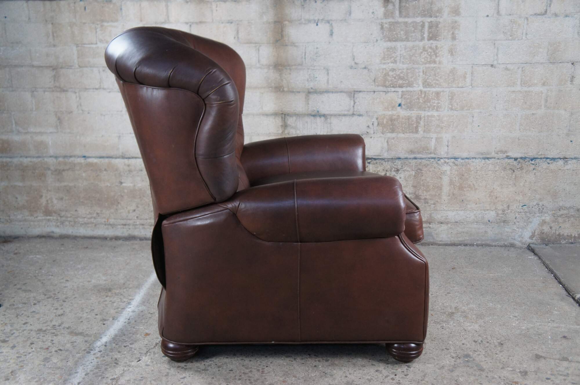 Vintage Ethan Allen brown leather Cromwell recliner featuring tufted back, rolled arms, wingback and bun feet.