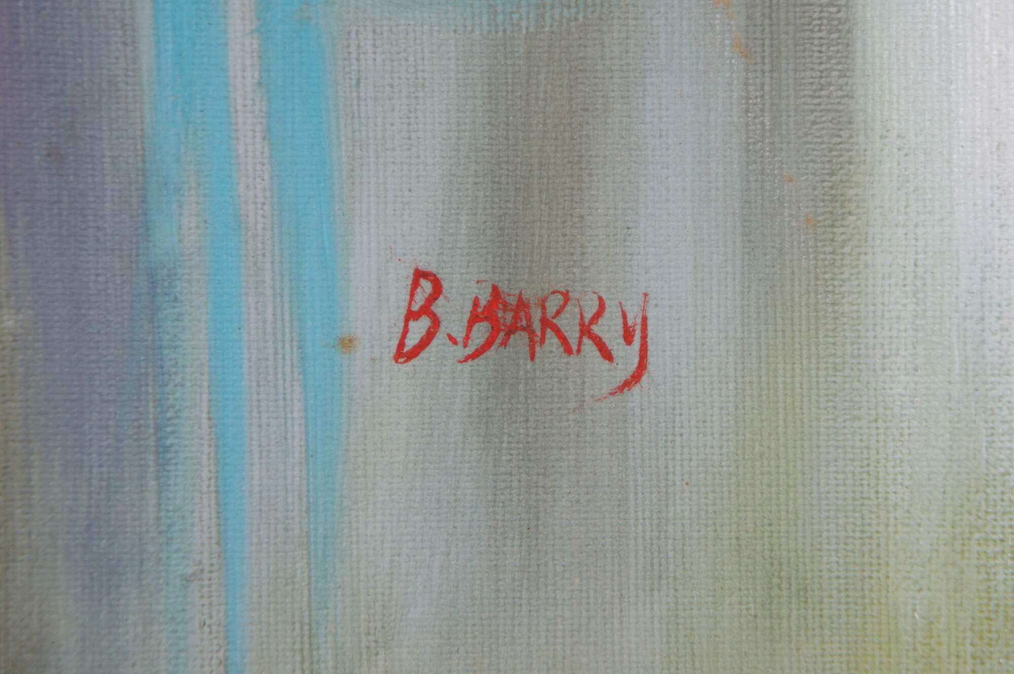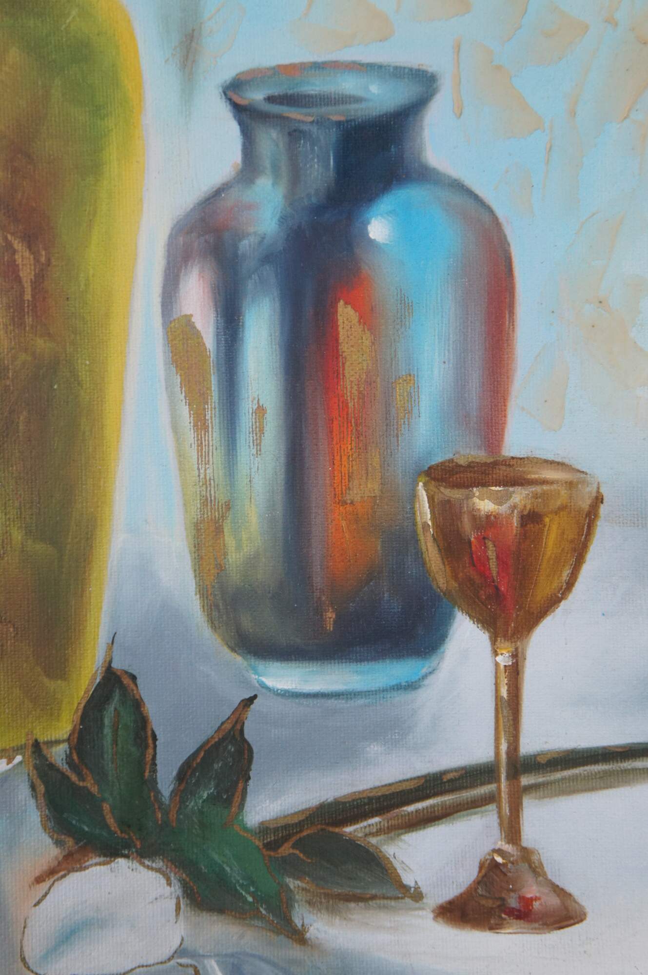 Vintage expressionist oil on canvas still life painting showing a bouquest of pink flowers in a yellow center vase, next to a vase and brass goblet on a blue and white tablecloth. Signed B. Barry in lower right.