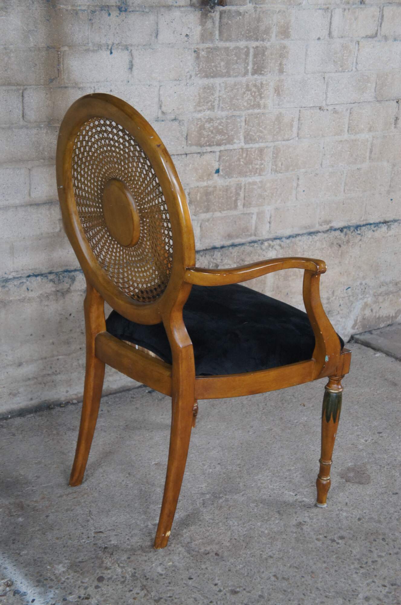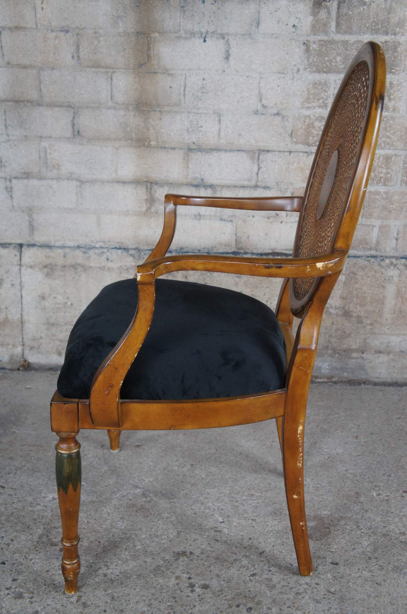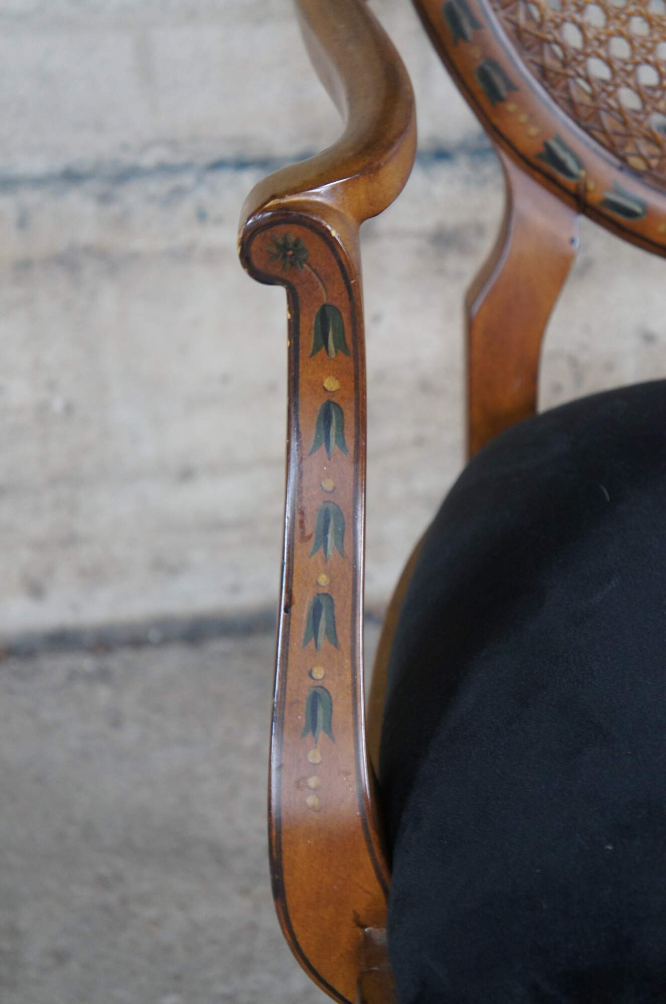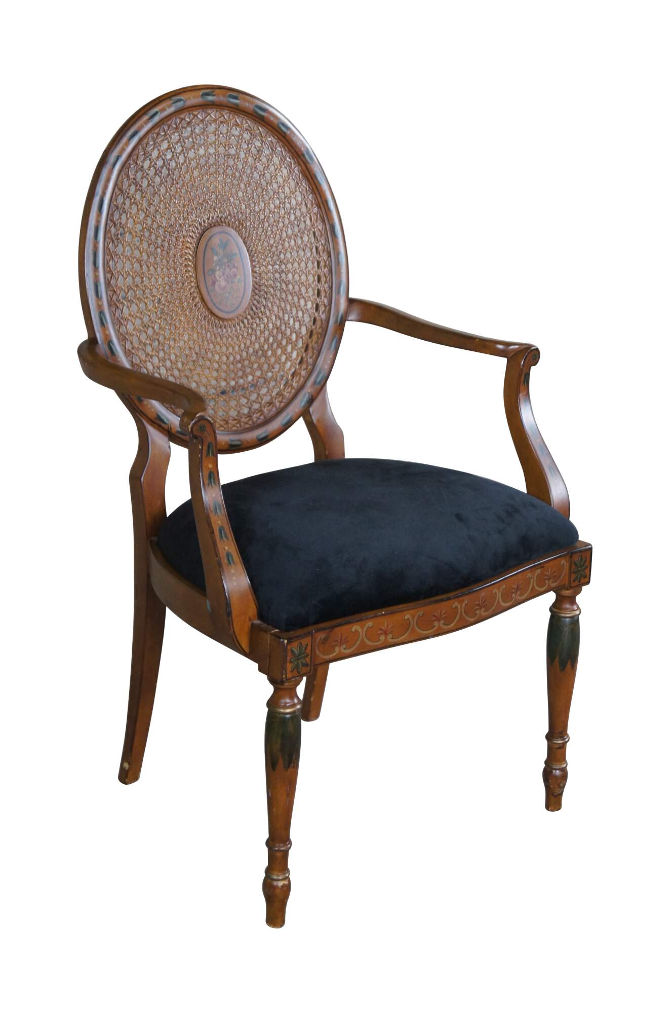 Vintage Pulaski Furntiure armchair. Featuring Louis XVI styling with caned wheel back, flared arms and hand painted details. Made in Italy.