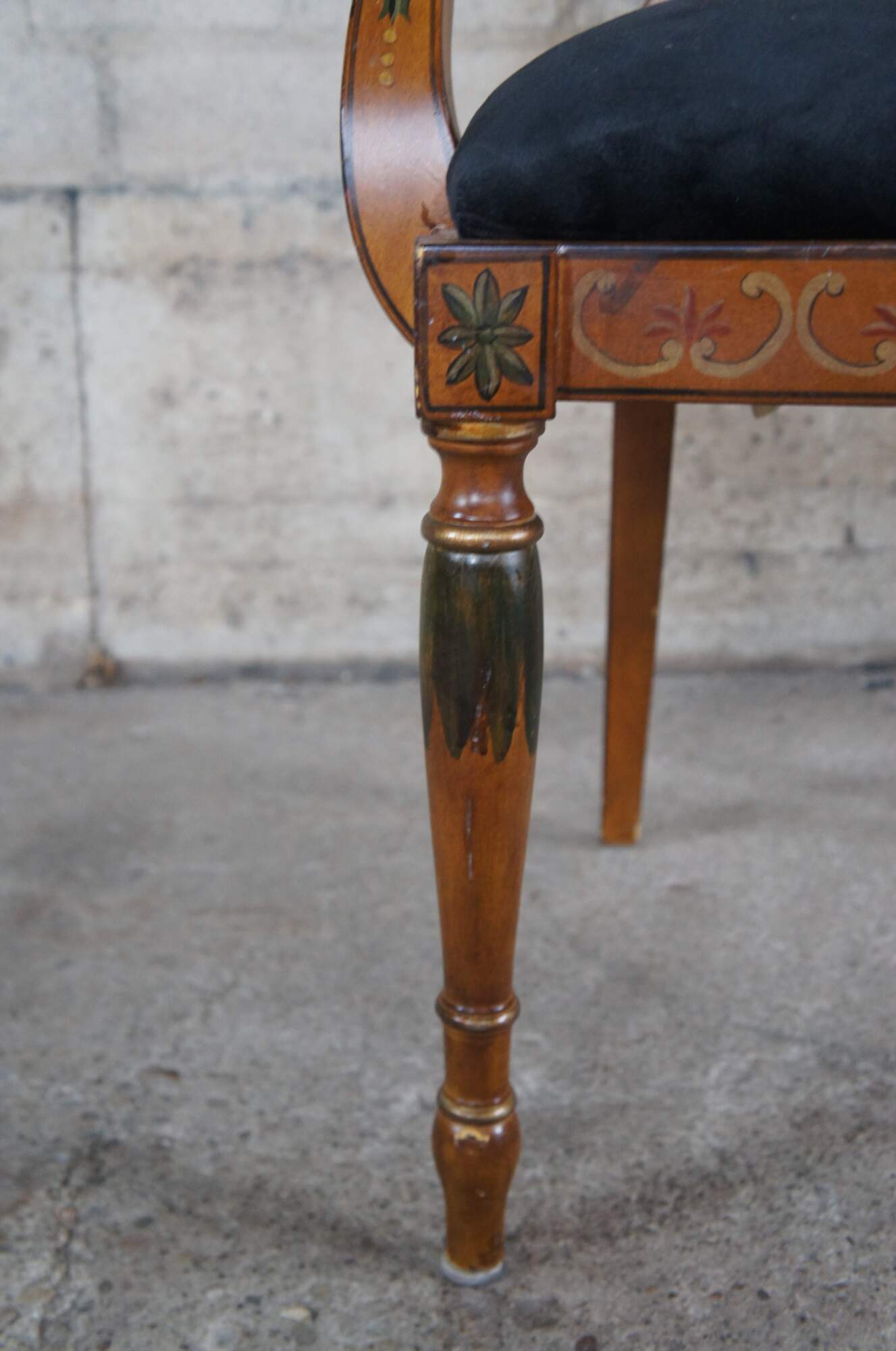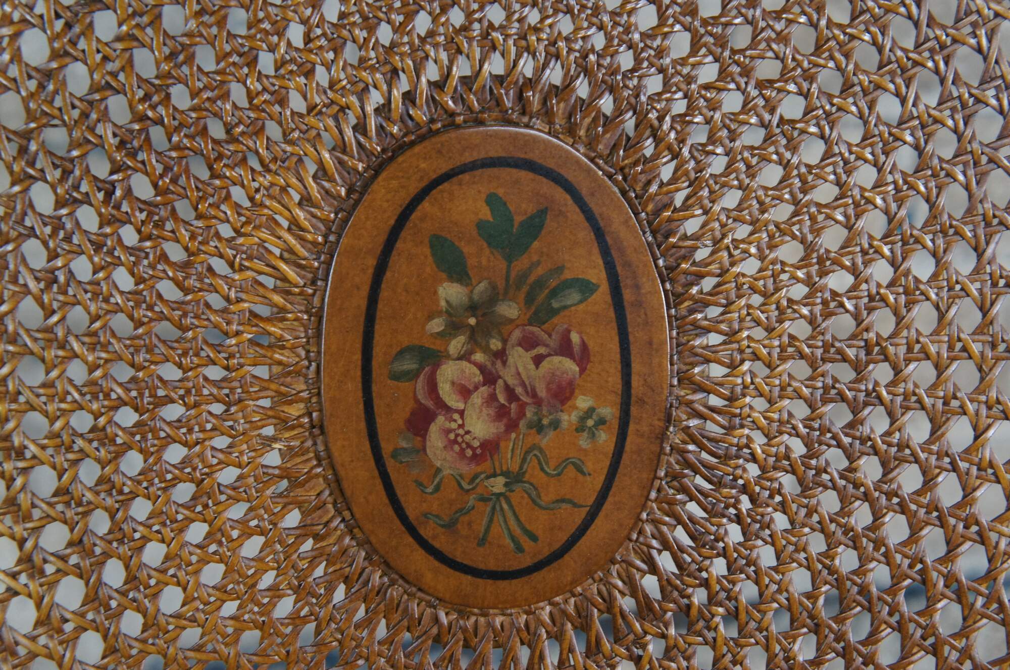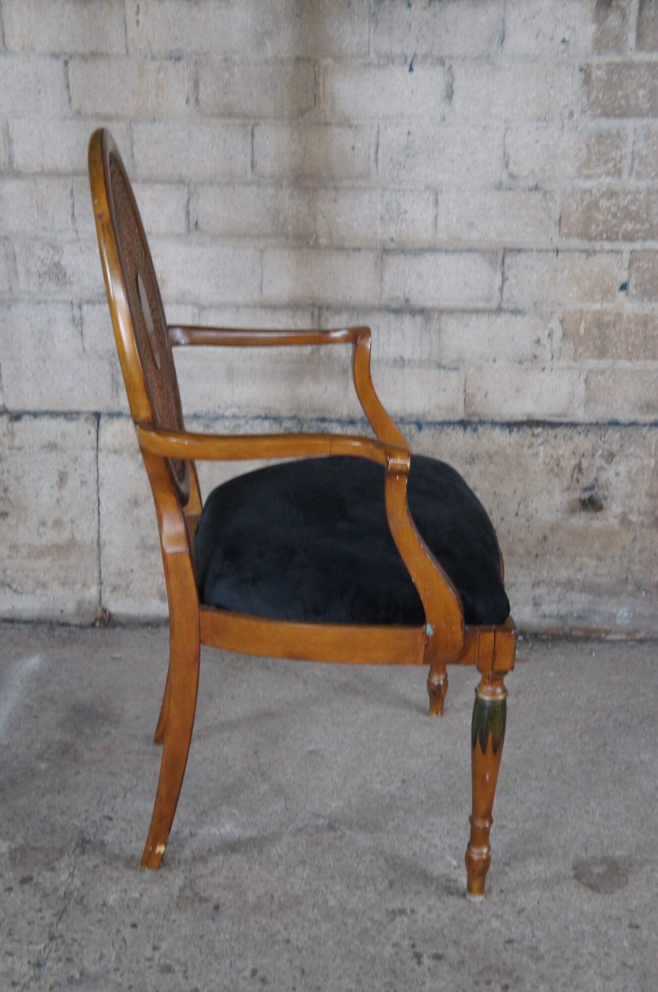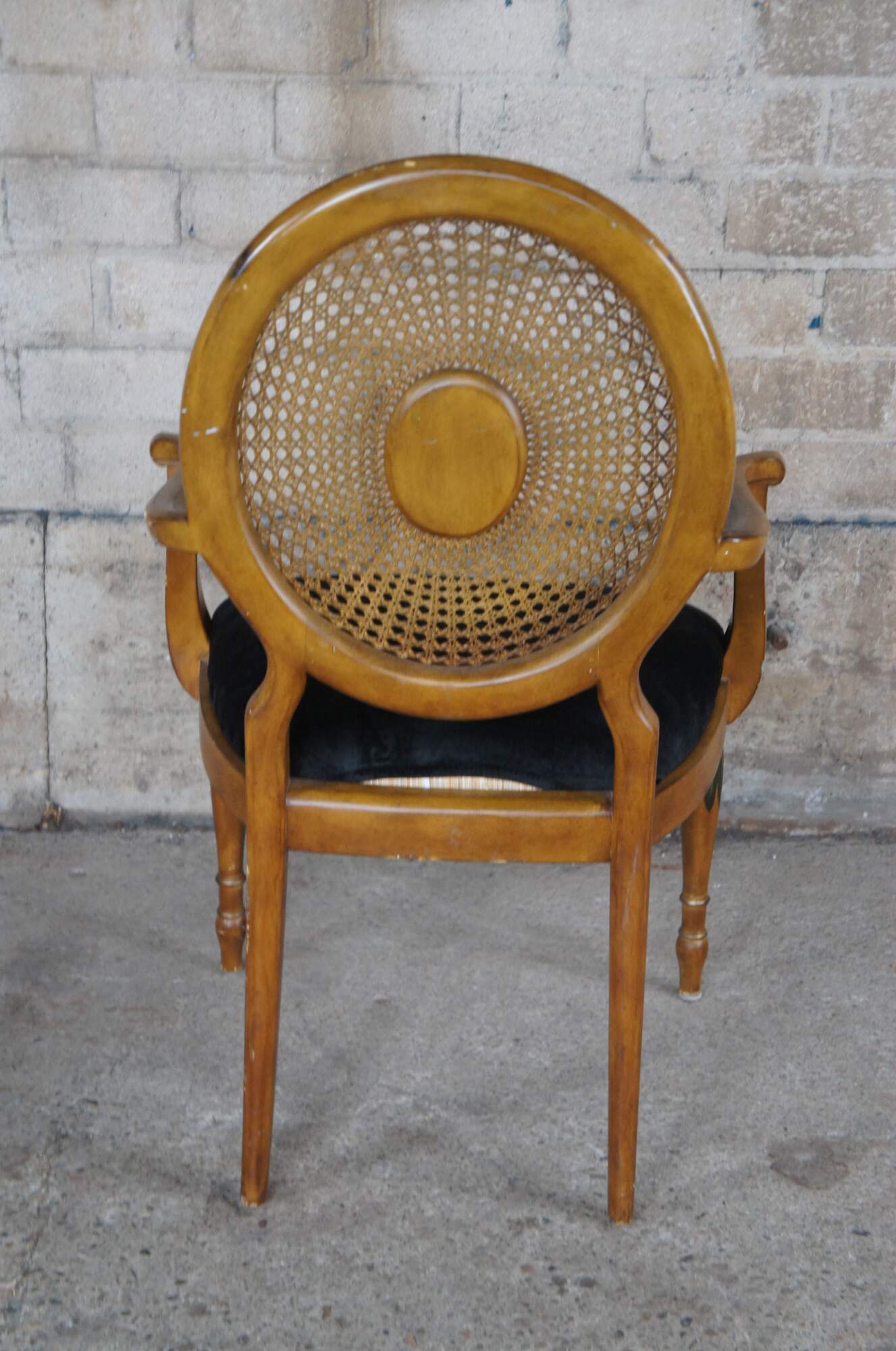 Vintage Pulaski Furntiure armchair. Featuring Louis XVI styling with caned wheel back, flared arms and hand painted details. Made in Italy.