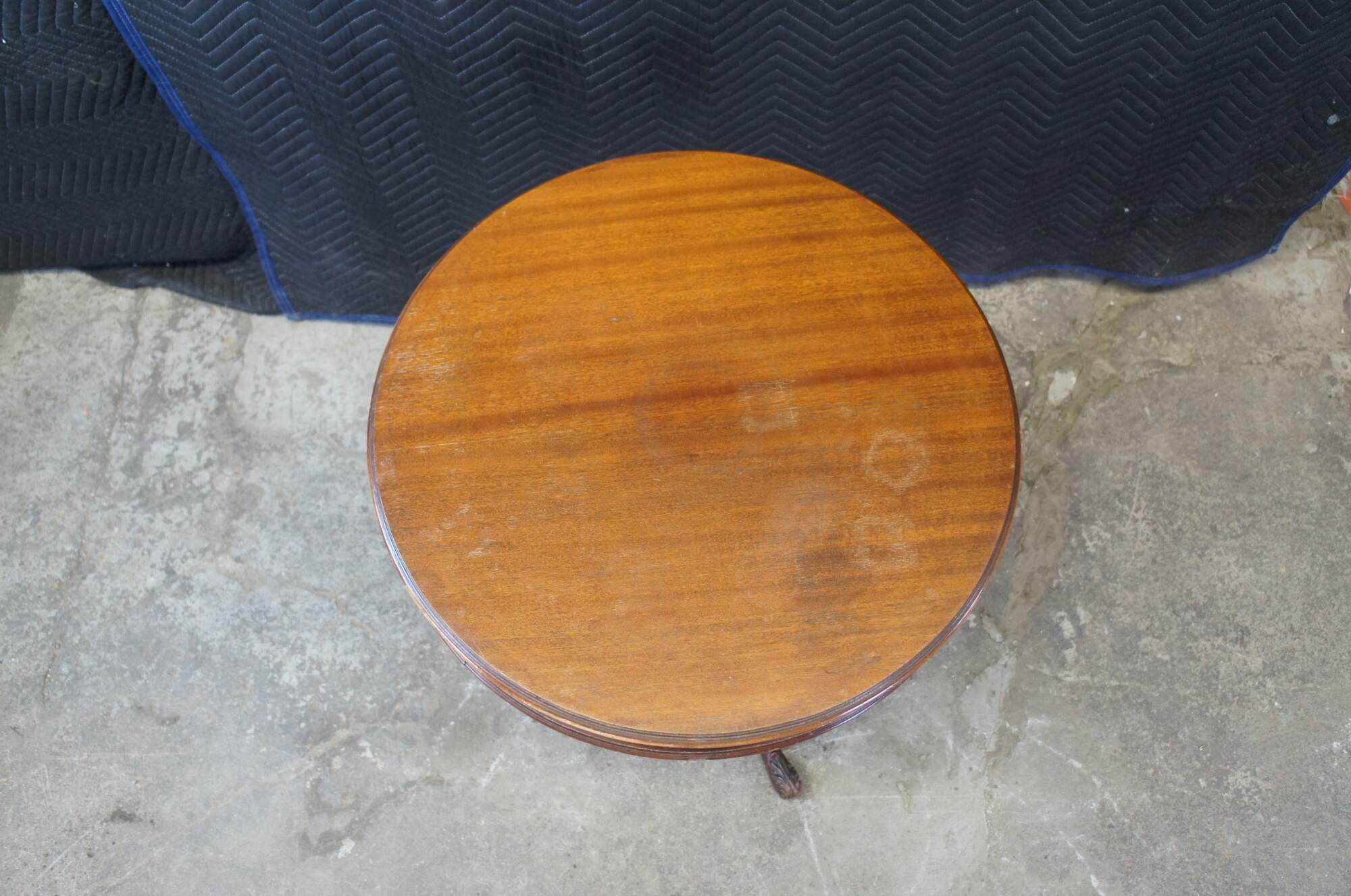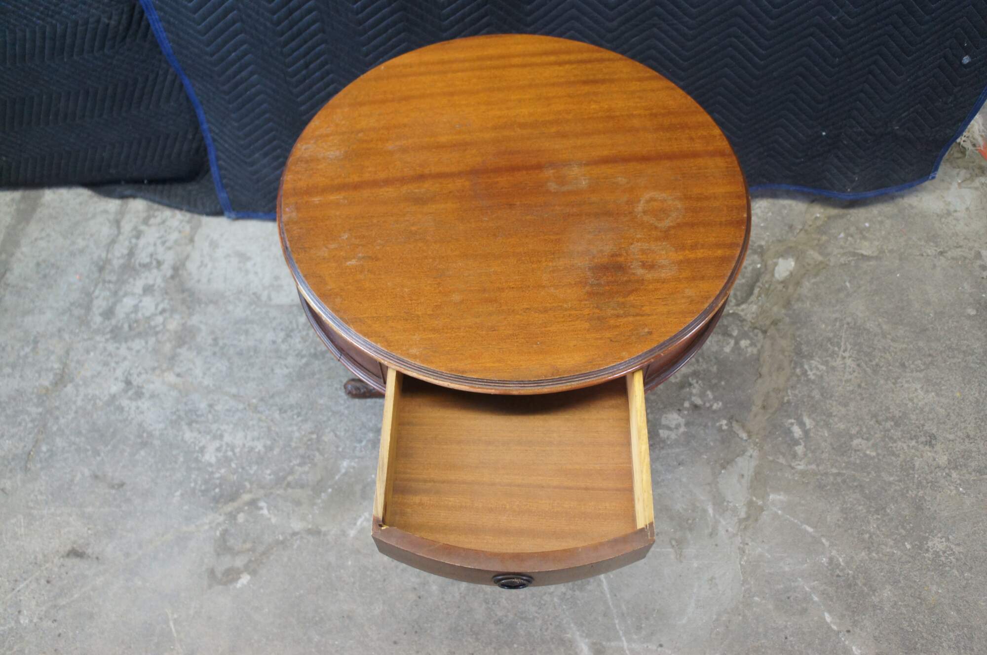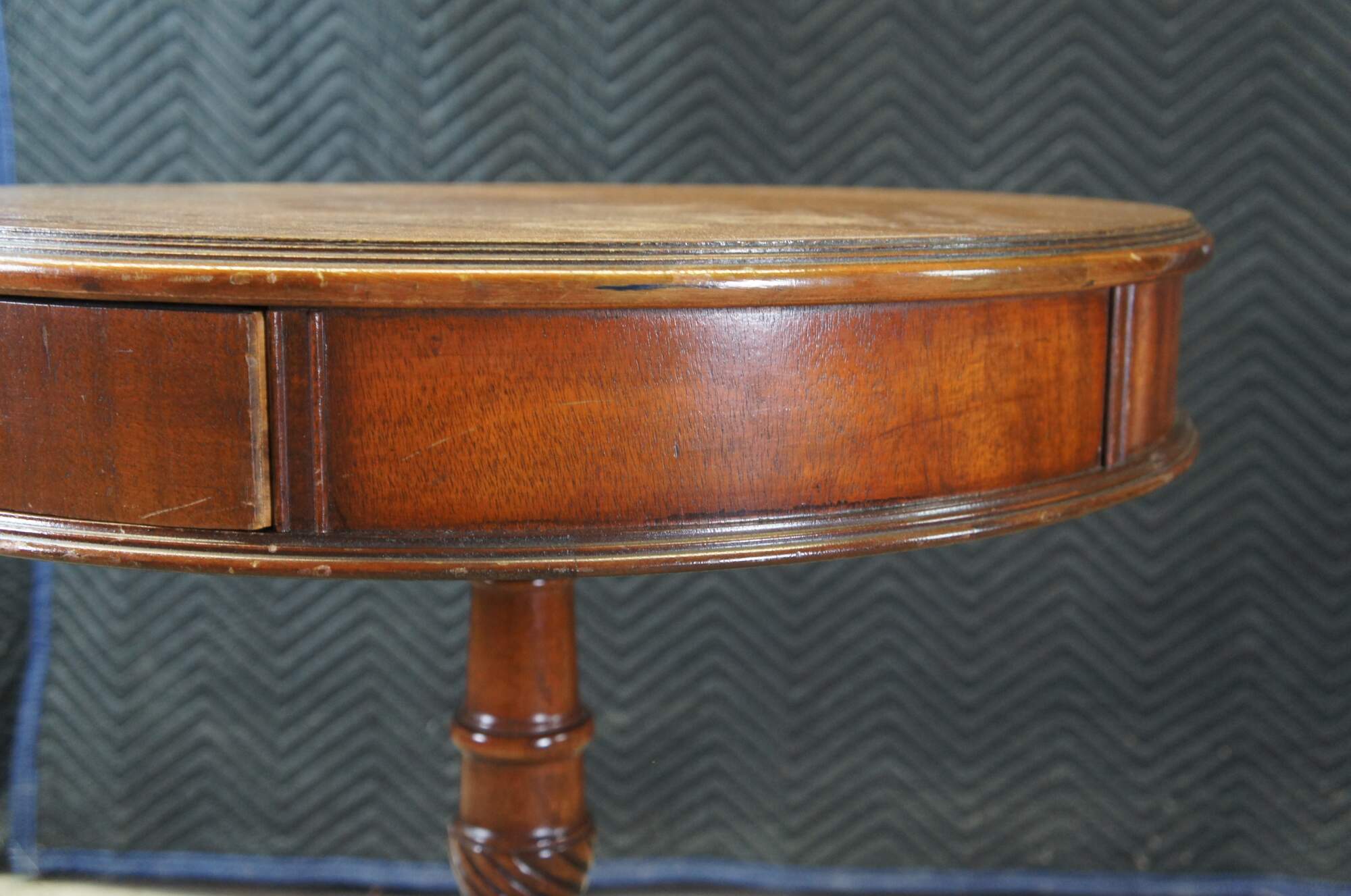 An antique Georgian style drum table. Made from mahogany with rounded top featuring a drawer within the frieze over a turned and carved column leading to downswept tripod base with scrolled pad feet.