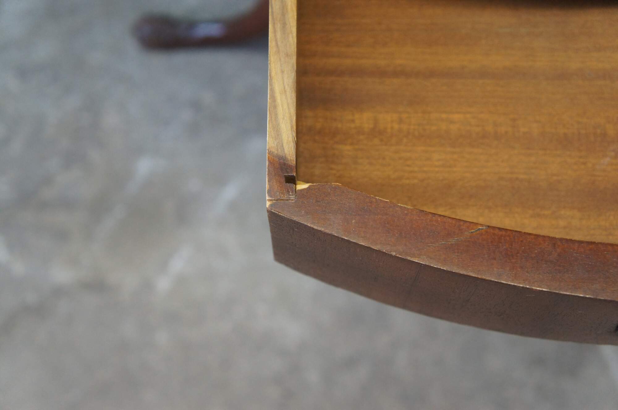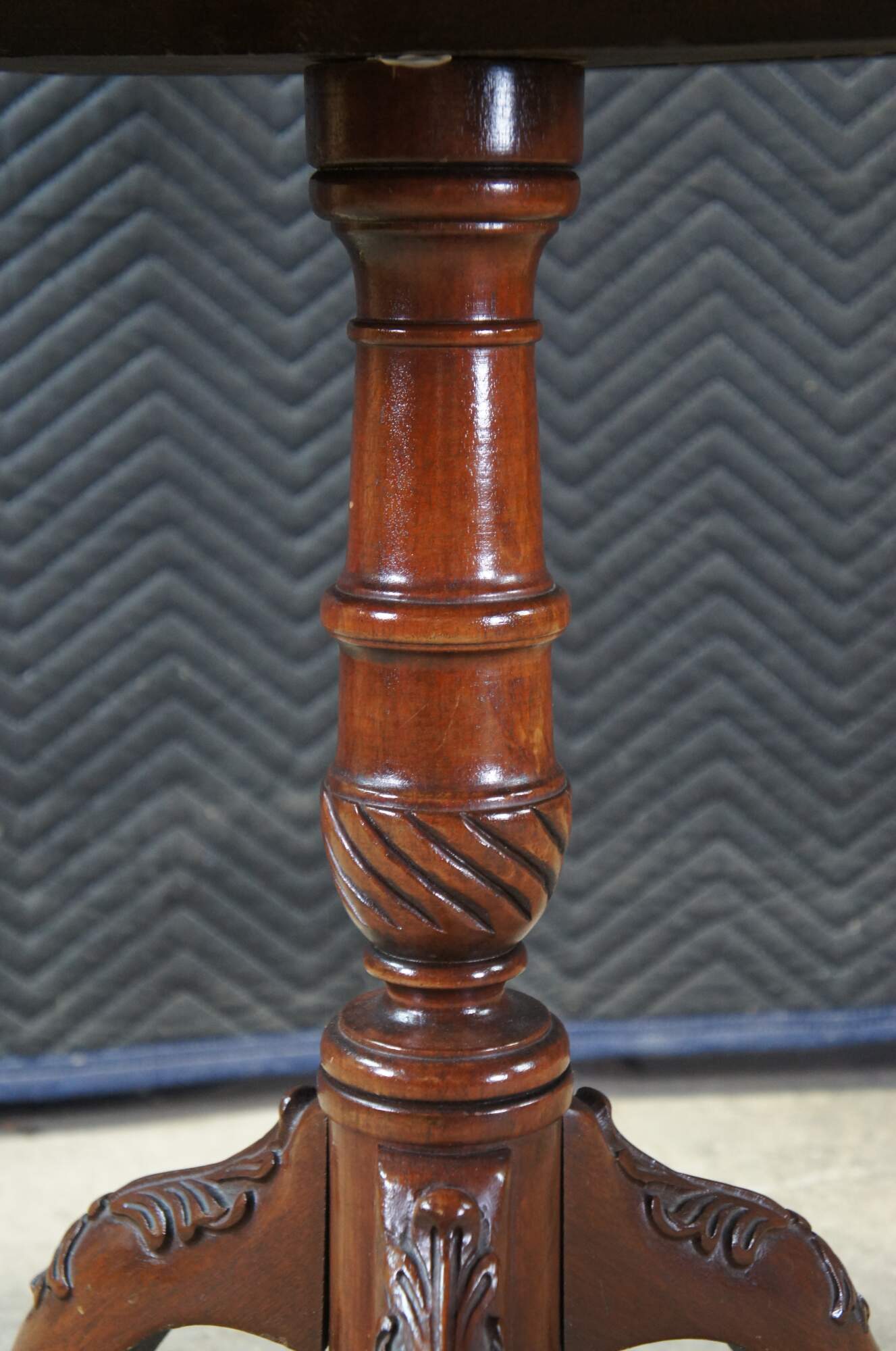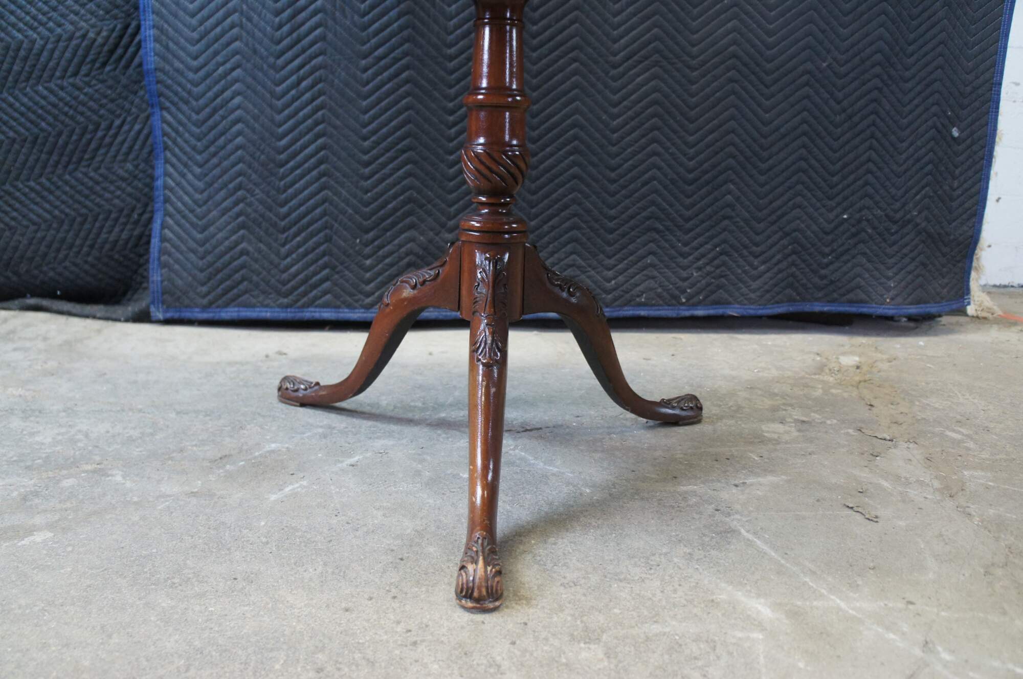 An antique Georgian style drum table. Made from mahogany with rounded top featuring a drawer within the frieze over a turned and carved column leading to downswept tripod base with scrolled pad feet.