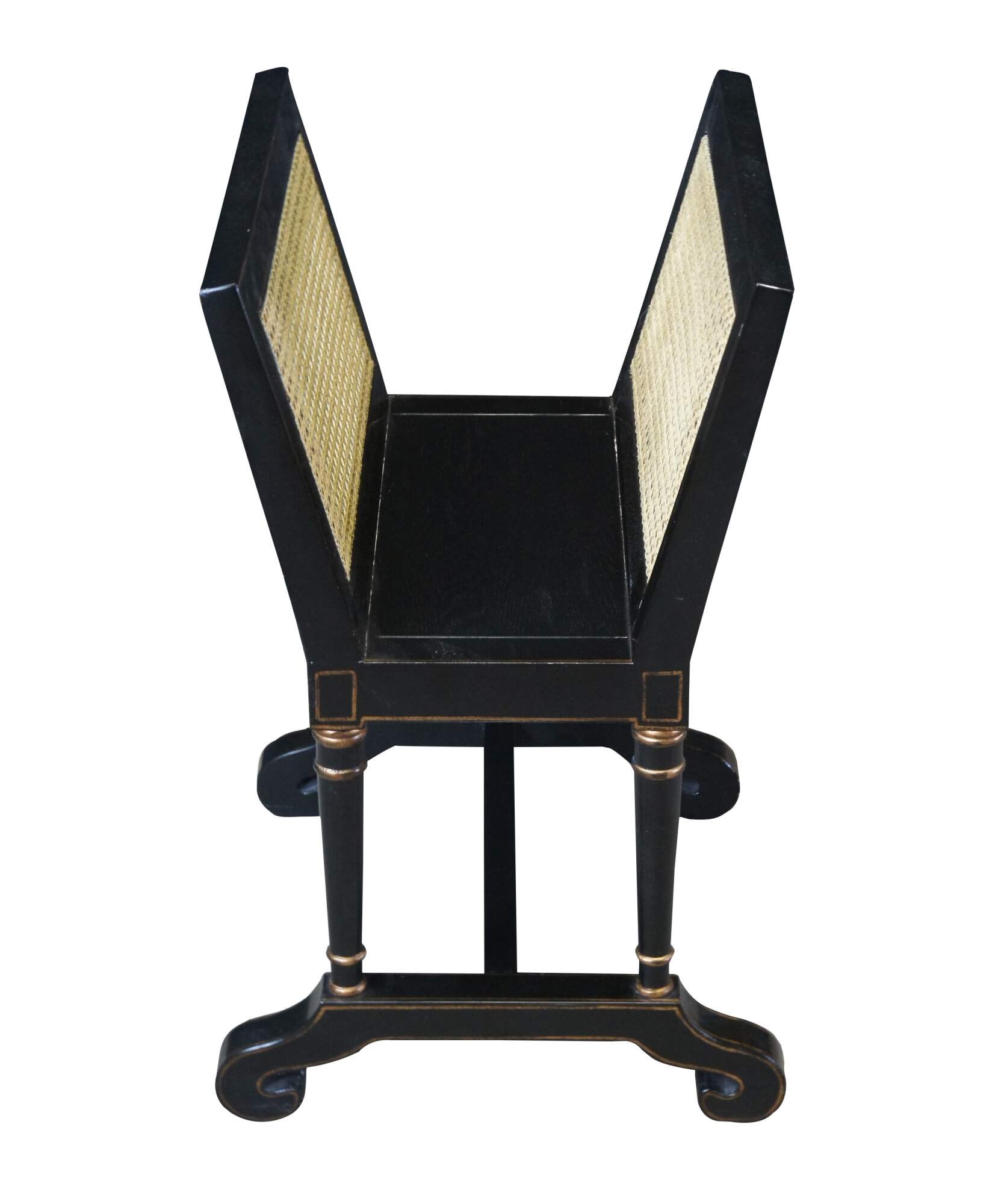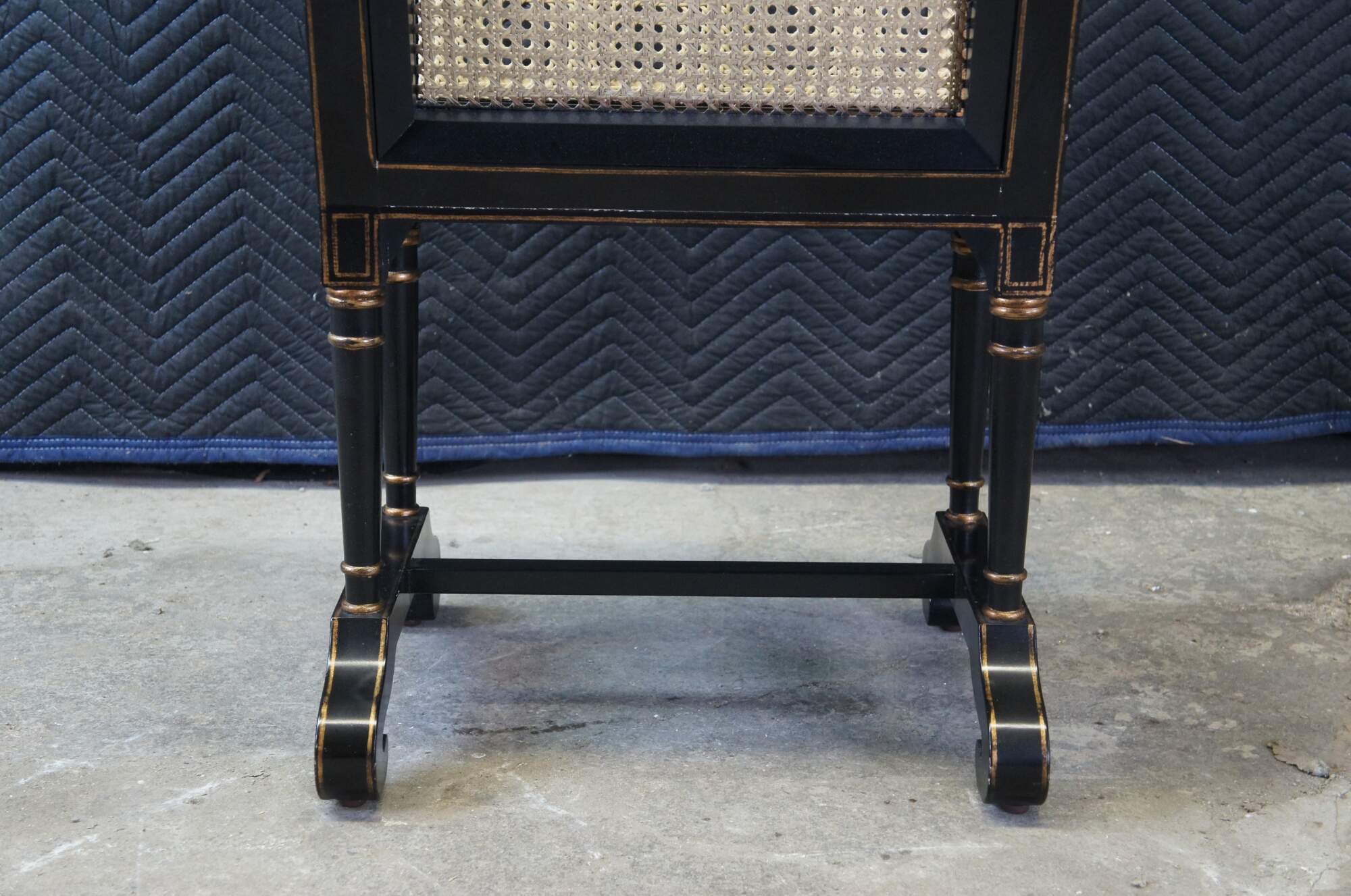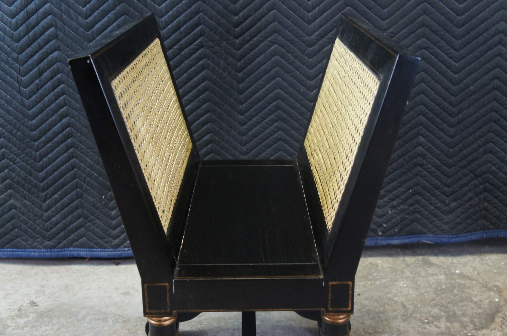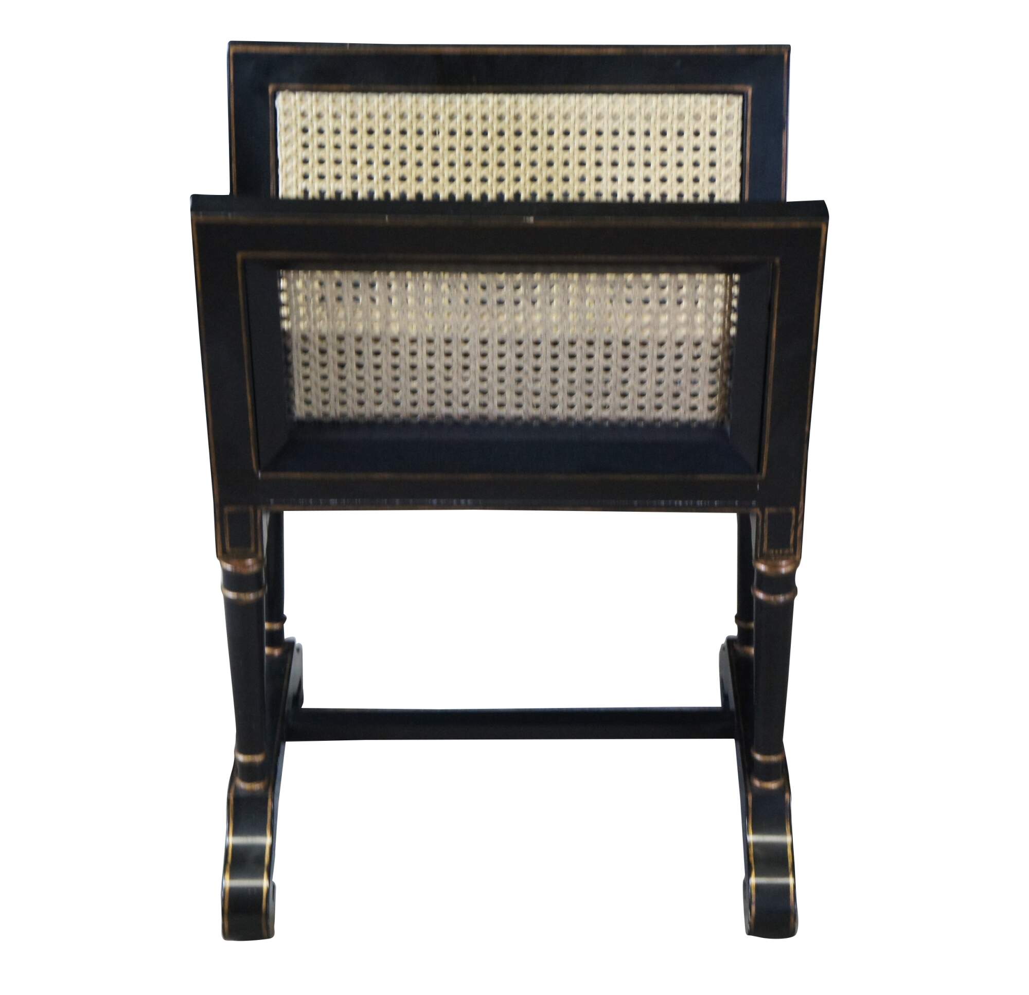 French Empire Napoleon III style ebonized magazine rack. Made from oak with flared caned magazine or newspaper supports. The top is supported by turned columns over scrolled feet connected by an H stretcher. Features gold trim throughout.