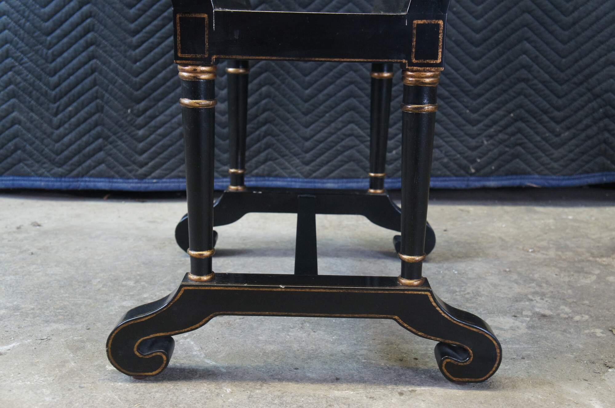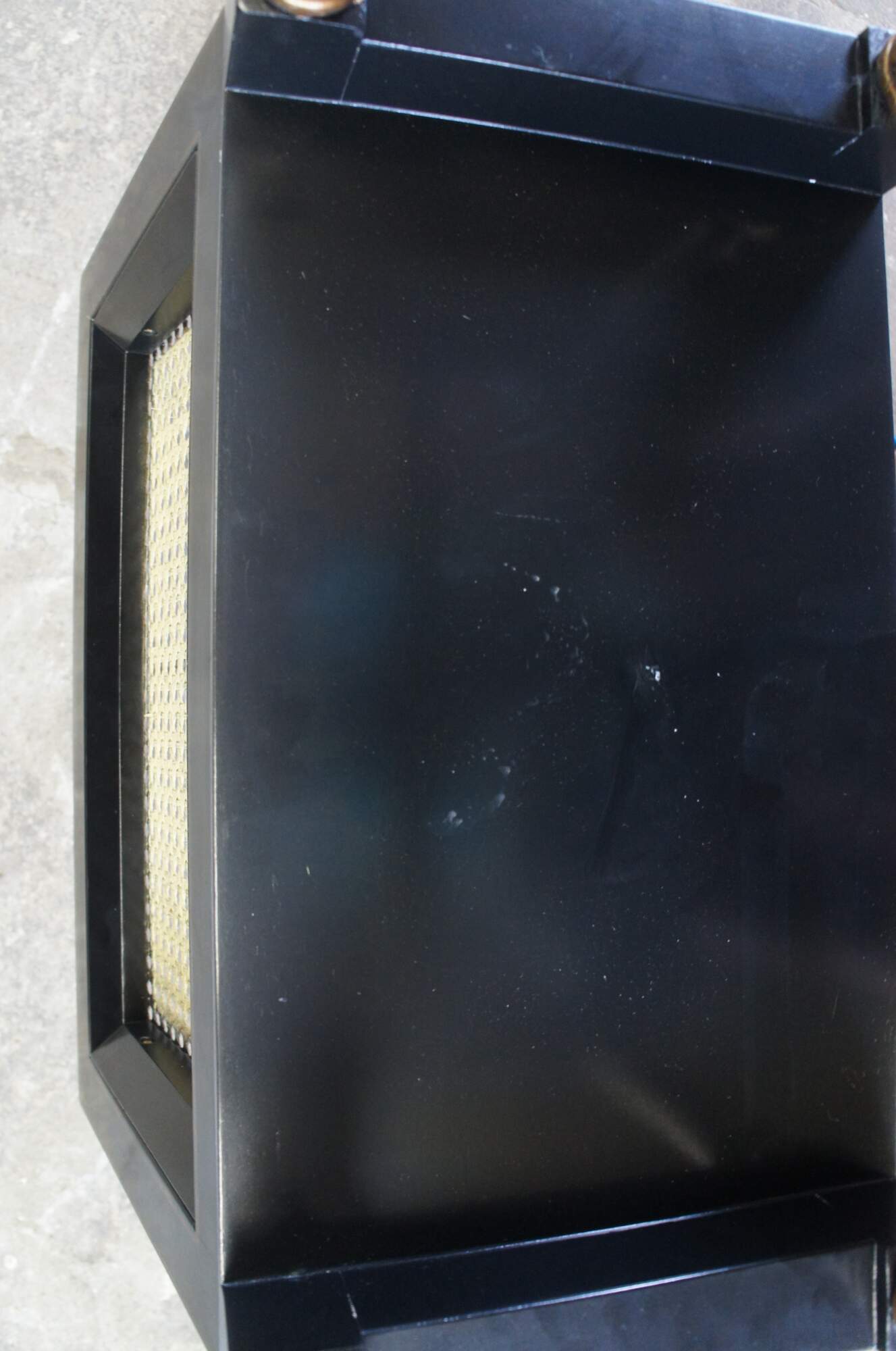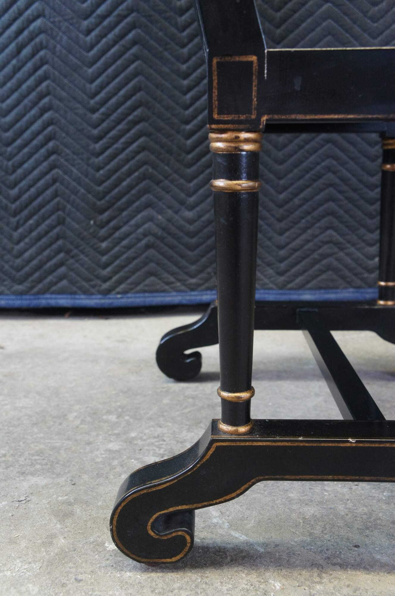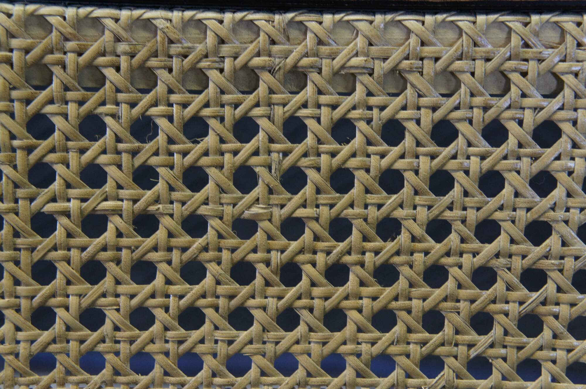 French Empire Napoleon III style ebonized magazine rack. Made from oak with flared caned magazine or newspaper supports. The top is supported by turned columns over scrolled feet connected by an H stretcher. Features gold trim throughout.